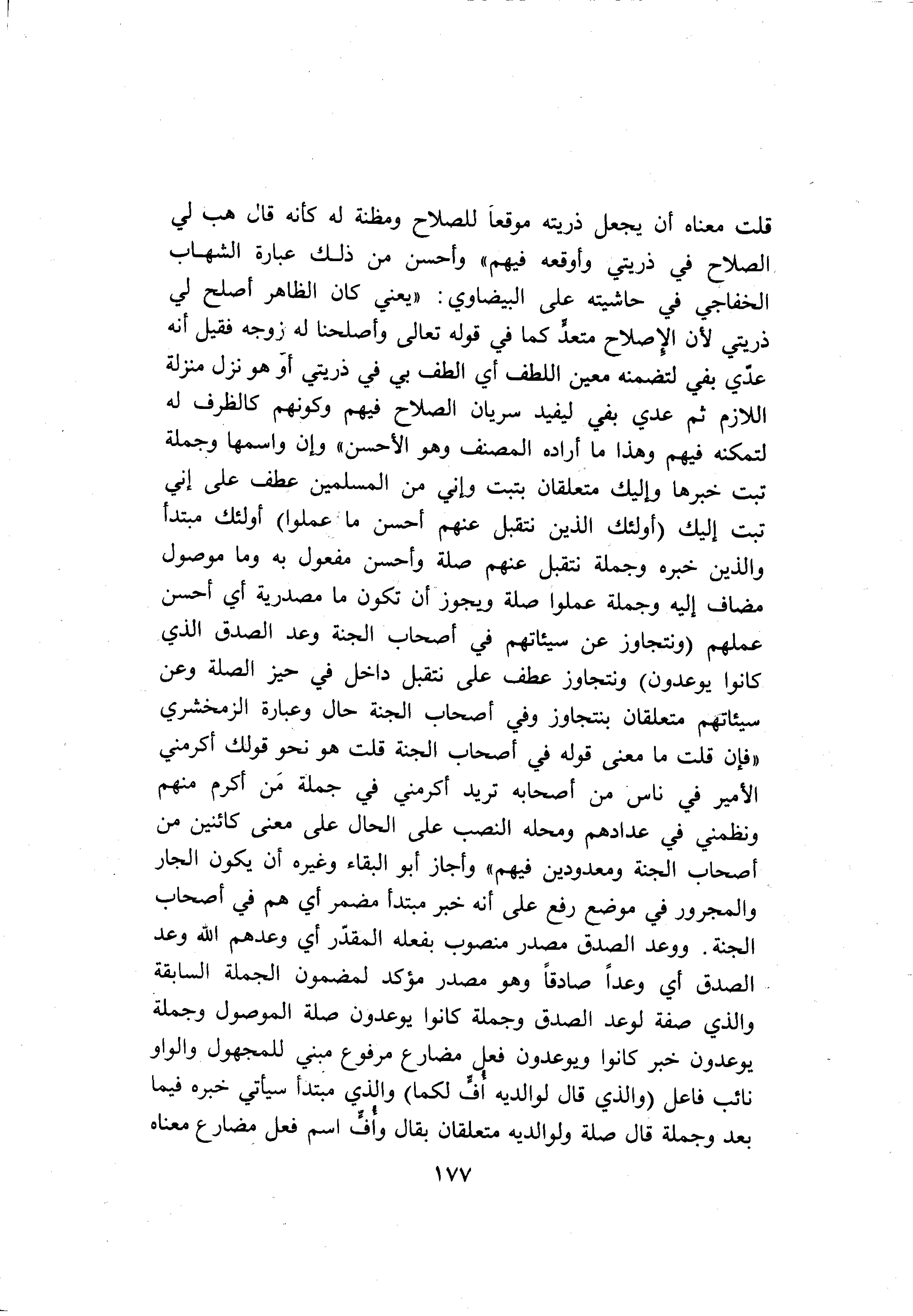 قلت معناه أن يجعل ذريته موقعا للصلاح ومظنة له كأنه قال هب لي الصلاح في ذريتي وأوقعه فيهم» وأحسن من ذلك عبارة الشهاب الخفاجي في حاشيته على البيضاوي: «يعني كان الظاهر أصلح لي ذريتي لأن الإصلاح متعدّ كما في قوله تعالى وأصلحنا له زوجه فقيل أنه عدّي بفي لتضمنه معين اللطف أي الطف بي في ذريتي أو هو نزل منزلة اللازم ثم عدي بفي ليفيد سريان الصلاح فيهم وكونهم كالظرف له لتمكنه فيهم وهذا ما أراده المصنف وهو الأحسن» وإن واسمها وجملة تبت خبرها وإليك متعلقان بتبت وإني من المسلمين عطف على إني تبت إليك (أُولئِكَ الَّذِينَ نَتَقَبَّلُ عَنْهُمْ أَحْسَنَ ما عَمِلُوا) أولئك مبتدأ والذين خبره وجملة نتقبل عنهم صلة وأحسن مفعول به وما موصول مضاف إليه وجملة عملوا صلة ويجوز أن تكون ما مصدرية أي أحسن عملهم (وَنَتَجاوَزُ عَنْ سَيِّئاتِهِمْ فِي أَصْحابِ الْجَنَّةِ وَعْدَ الصِّدْقِ الَّذِي كانُوا يُوعَدُونَ) ونتجاوز عطف على نتقبل داخل في حيز الصلة وعن سيئاتهم متعلقان بنتجاوز وفي أصحاب الجنة حال وعبارة الزمخشري «فإن قلت ما معنى قوله في أصحاب الجنة قلت هو نحو قولك أكرمني الأمير في ناس من أصحابه تريد أكرمني في جملة من أكرم منهم ونظمني في عدادهم ومحله النصب على الحال على معنى كائنين من أصحاب الجنة ومعدودين فيهم» وأجاز أبو البقاء وغيره أن يكون الجار والمجرور في موضع رفع على أنه خبر مبتدأ مضمر أي هم في أصحاب الجنة. ووعد الصدق مصدر منصوب بفعله المقدّر أي وعدهم الله وعد الصدق أي وعدا صادقا وهو مصدر مؤكد لمضمون الجملة السابقة والذي صفة لوعد الصدق وجملة كانوا يوعدون صلة الموصول وجملة يوعدون خبر كانوا ويوعدون فعل مضارع مرفوع مبني للمجهول والواو نائب فاعل (وَالَّذِي قالَ لِوالِدَيْهِ أُفٍّ لَكُما) والذي مبتدأ سيأتي خبره فيما بعد وجملة قال صلة ولوالديه متعلقان بقال وأفّ اسم فعل مضارع معناه
