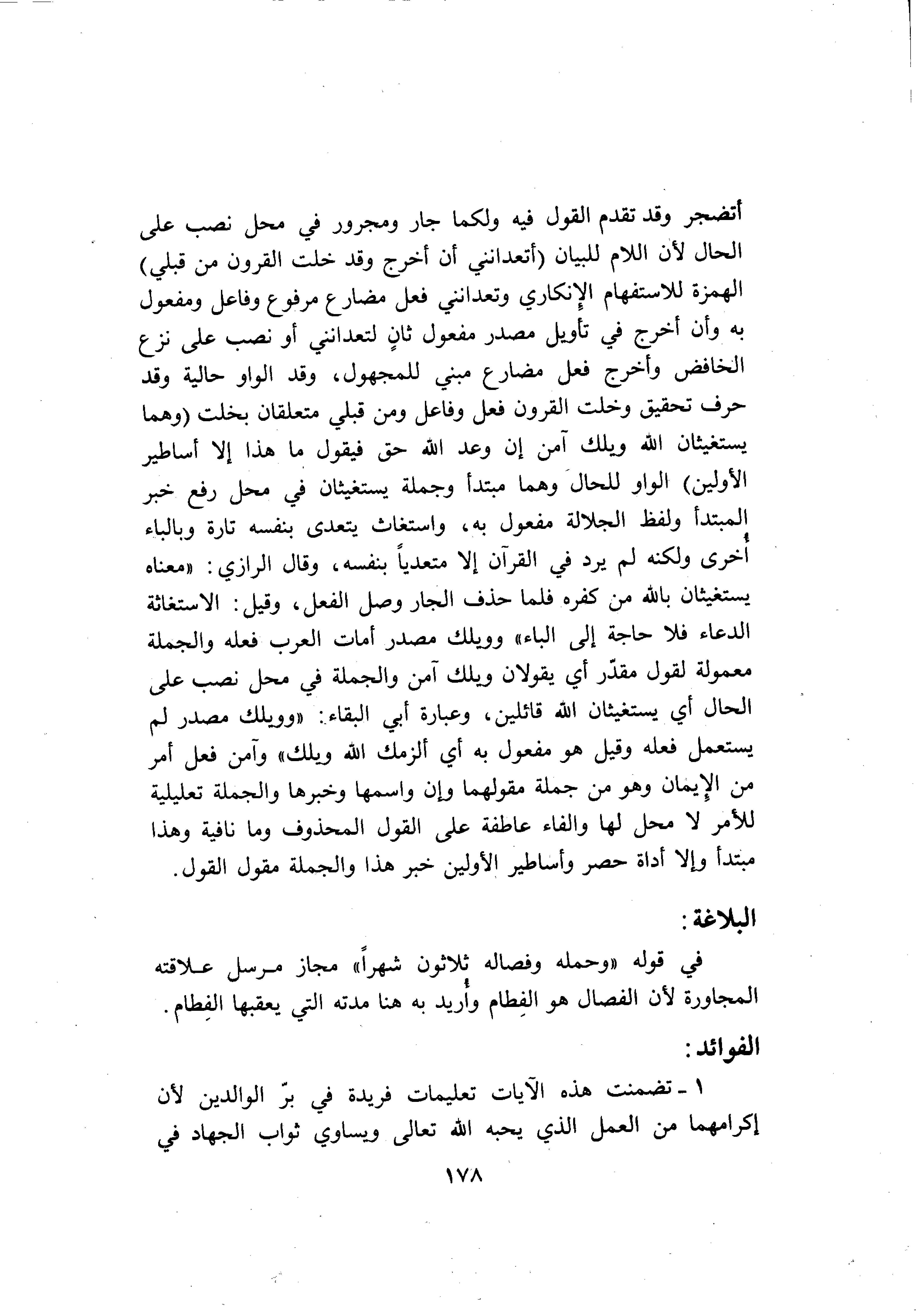 في قوله «وحمله وفصاله ثلاثون شهرا» مجاز مرسل علاقته المجاورة لأن الفصال هو الفطام وأريد به هنا مدته التي يعقبها الفطام.