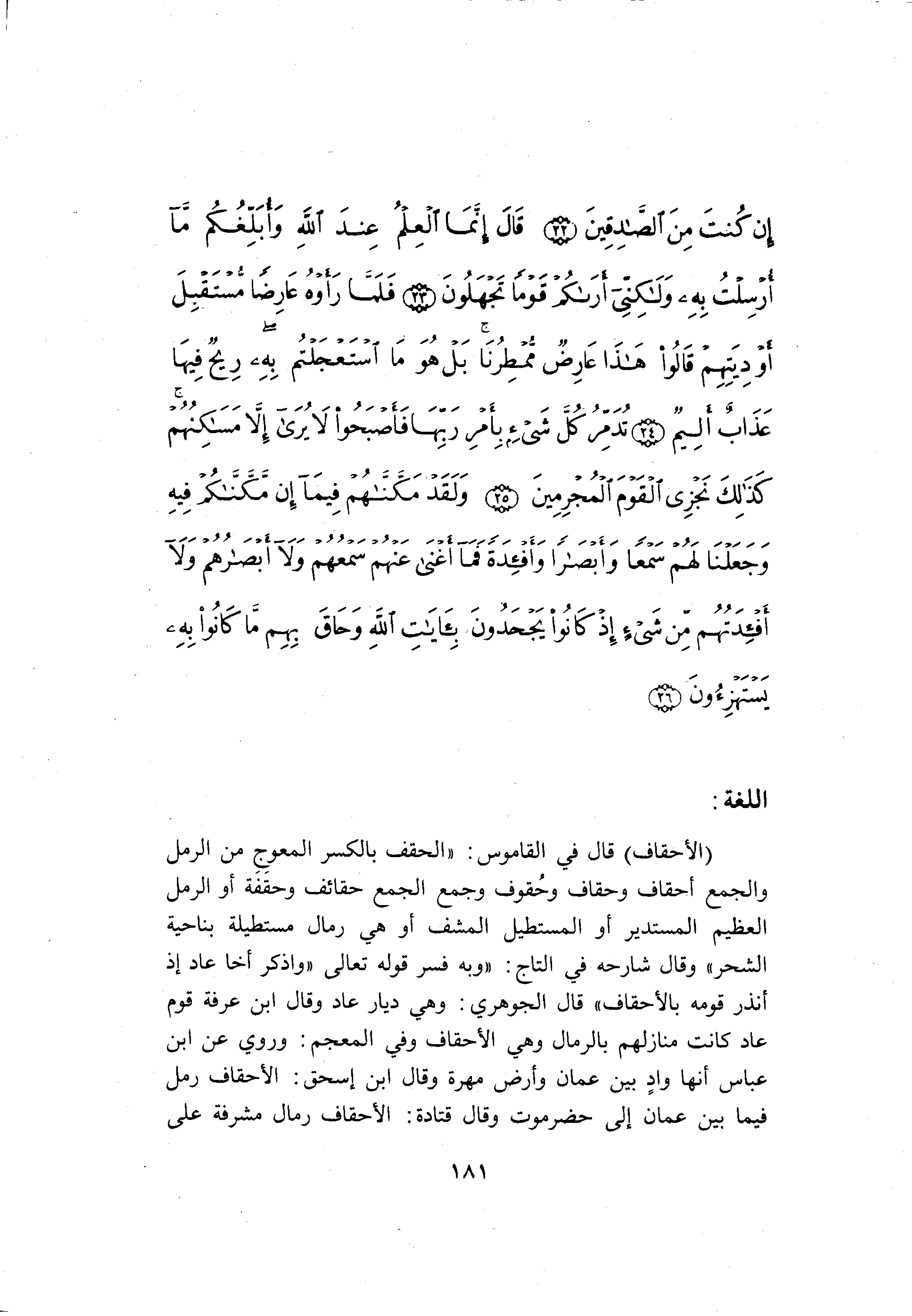 (الأحقاف) قال في القاموس: «الحقف بالكسر المعوج من الرمل والجمع أحقاف وحقاف وحقوف وجمع الجمع حقائف وحقفة أو الرمل العظيم المستدير أو المستطيل المشف أو هي رمال مستطيلة بناحية الشحر» وقال شارحه في التاج: «وبه فسر قوله تعالى «واذكر أخا عاد إذ أنذر قومه بالأحقاف» قال الجوهري: وهي ديار عاد وقال ابن عرفة قوم عاد كانت منازلهم بالرمال وهي الأحقاف وفي المعجم: وروي عن ابن عباس أنها واد بين عمان وأرض مهرة وقال ابن إسحق: الأحقاف رمل فيما بين عمان إلى حضرموت وقال قتادة: الأحقاف رمال مشرفة على