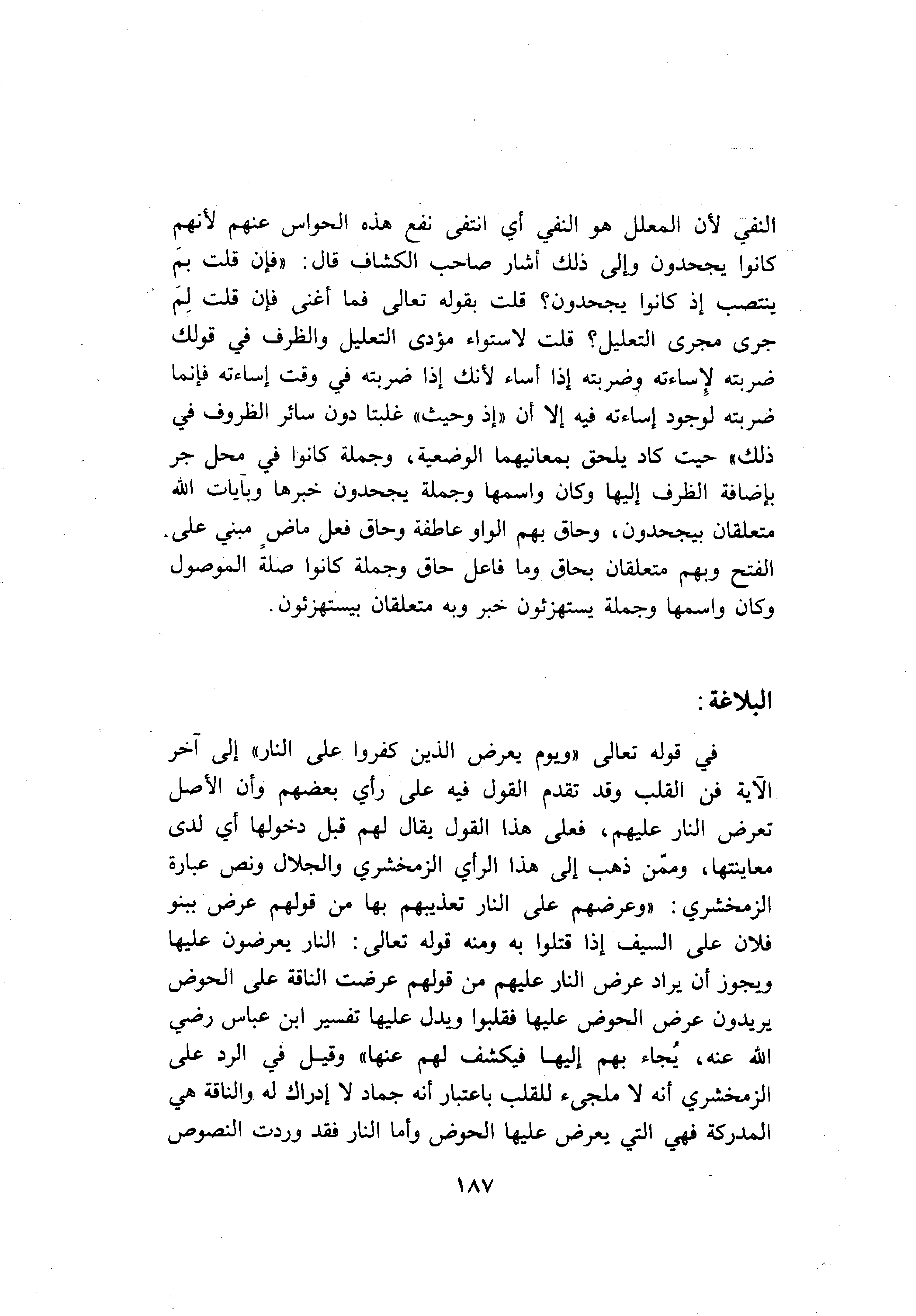 في قوله تعالى «ويوم يعرض الذين كفروا على النار» إلى آخر الآية فن القلب وقد تقدم القول فيه على رأي بعضهم وأن الأصل تعرض النار عليهم، فعلى هذا القول يقال لهم قبل دخولها أي لدى معاينتها، وممّن ذهب إلى هذا الرأي الزمخشري والجلال ونص عبارة الزمخشري: «وعرضهم على النار تعذيبهم بها من قولهم عرض ببنو فلان على السيف إذا قتلوا به ومنه قوله تعالى: النار يعرضون عليها ويجوز أن يراد عرض النار عليهم من قولهم عرضت الناقة على الحوض يريدون عرض الحوض عليها فقلبوا ويدل عليها تفسير ابن عباس رضي الله عنه، يجاء بهم إليها فيكشف لهم عنها» وقيل في الرد على الزمخشري أنه لا ملجئ للقلب باعتبار أنه جماد لا إدراك له والناقة هي المدركة فهي التي يعرض عليها الحوض وأما النار فقد وردت النصوص