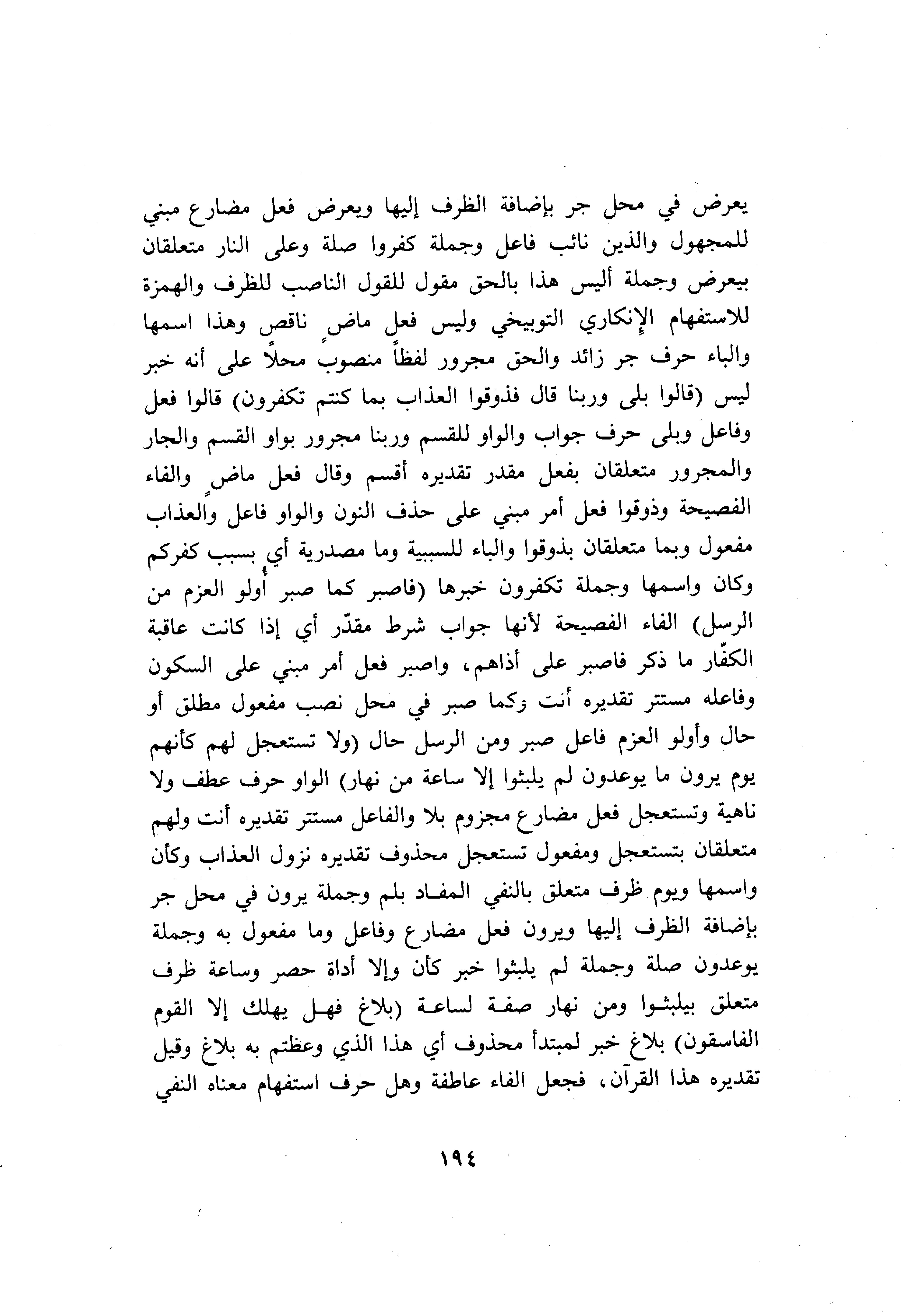 يعرض في محل جر بإضافة الظرف إليها ويعرض فعل مضارع مبني للمجهول والذين نائب فاعل وجملة كفروا صلة وعلى النار متعلقان بيعرض وجملة أليس هذا بالحق مقول للقول الناصب للظرف والهمزة للاستفهام الإنكاري التوبيخي وليس فعل ماض ناقص وهذا اسمها والباء حرف جر زائد والحق مجرور لفظا منصوب محلا على أنه خبر ليس (قالُوا بَلى وَرَبِّنا قالَ فَذُوقُوا الْعَذابَ بِما كُنْتُمْ تَكْفُرُونَ) قالوا فعل وفاعل وبلى حرف جواب والواو للقسم وربنا مجرور بواو القسم والجار والمجرور متعلقان بفعل مقدر تقديره أقسم وقال فعل ماض والفاء الفصيحة وذوقوا فعل أمر مبني على حذف النون والواو فاعل والعذاب مفعول وبما متعلقان بذوقوا والباء للسببية وما مصدرية أي بسبب كفركم وكان واسمها وجملة تكفرون خبرها (فَاصْبِرْ كَما صَبَرَ أُولُوا الْعَزْمِ مِنَ الرُّسُلِ) الفاء الفصيحة لأنها جواب شرط مقدّر أي إذا كانت عاقبة الكفّار ما ذكر فاصبر على أذاهم، واصبر فعل أمر مبني على السكون وفاعله مستتر تقديره أنت وكما صبر في محل نصب مفعول مطلق أو حال وأولو العزم فاعل صبر ومن الرسل حال (وَلا تَسْتَعْجِلْ لَهُمْ كَأَنَّهُمْ يَوْمَ يَرَوْنَ ما يُوعَدُونَ لَمْ يَلْبَثُوا إِلَّا ساعَةً مِنْ نَهارٍ) الواو حرف عطف ولا ناهية وتستعجل فعل مضارع مجزوم بلا والفاعل مستتر تقديره أنت ولهم متعلقان بتستعجل ومفعول تستعجل محذوف تقديره نزول العذاب وكأن واسمها ويوم ظرف متعلق بالنفي المفاد بلم وجملة يرون في محل جر بإضافة الظرف إليها ويرون فعل مضارع وفاعل وما مفعول به وجملة يوعدون صلة وجملة لم يلبثوا خبر كأن وإلا أداة حصر وساعة ظرف متعلق بيلبثوا ومن نهار صفة لساعة (بَلاغٌ فَهَلْ يُهْلَكُ إِلَّا الْقَوْمُ الْفاسِقُونَ) بلاغ خبر لمبتدأ محذوف أي هذا الذي وعظتم به بلاغ وقيل تقديره هذا القرآن، فجعل الفاء عاطفة وهل حرف استفهام معناه النفي