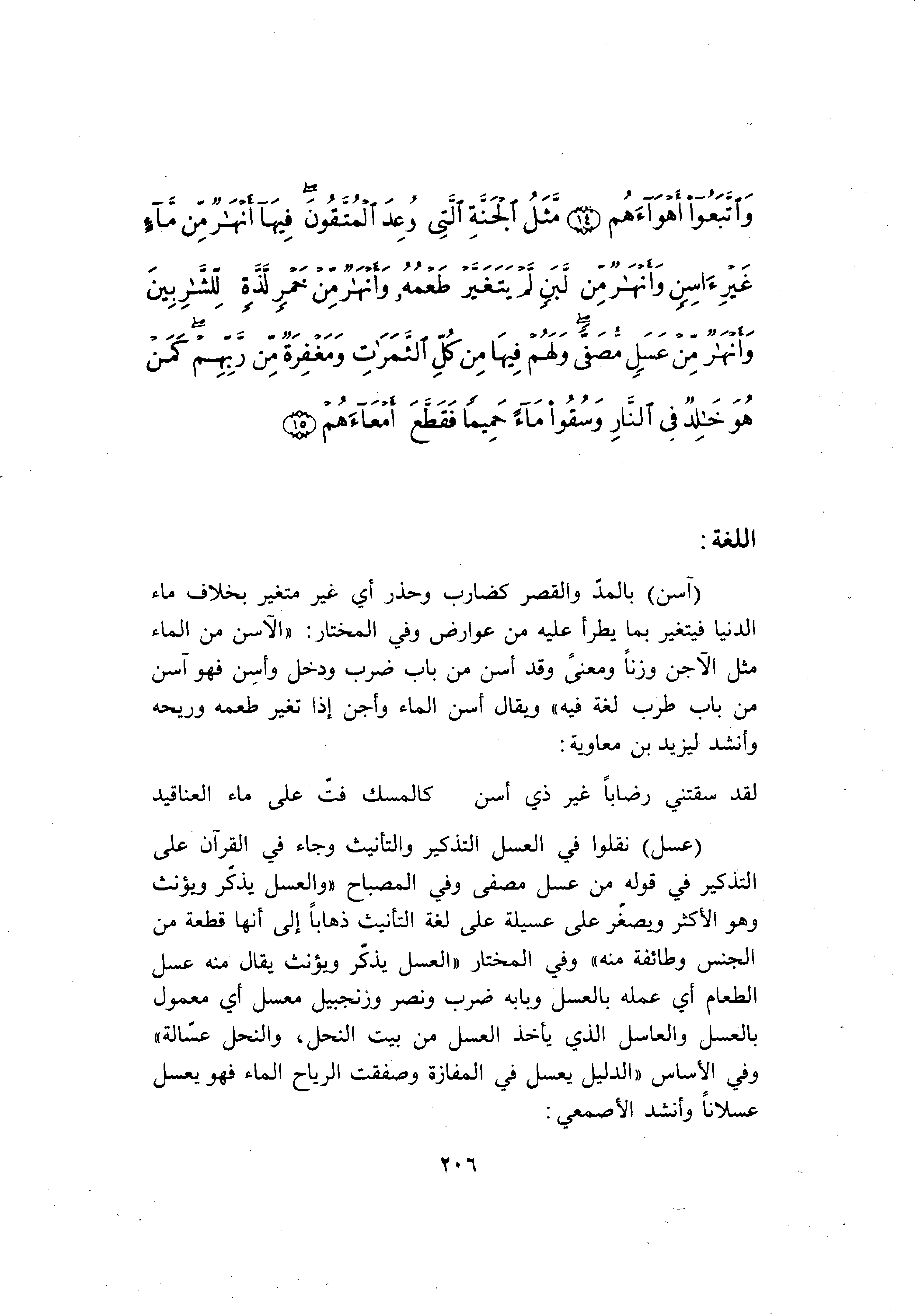 (عَسَلٍ) نقلوا في العسل التذكير والتأنيث وجاء في القرآن على التذكير في قوله من عسل مصفى وفي المصباح «والعسل يذكّر ويؤنث وهو الأكثر ويصغّر على عسيلة على لغة التأنيث ذهابا إلى أنها قطعة من الجنس وطائفة منه» وفي المختار «العسل يذكّر ويؤنث يقال منه عسل الطعام أي عمله بالعسل وبابه ضرب ونصر وزنجبيل معسل أي معمول بالعسل والعاسل الذي يأخذ العسل من بيت النحل، والنحل عسّالة» وفي الأساس «الدليل يعسل في المفازة وصفقت الرياح الماء فهو يعسل عسلانا وأنشد الأصمعي:
