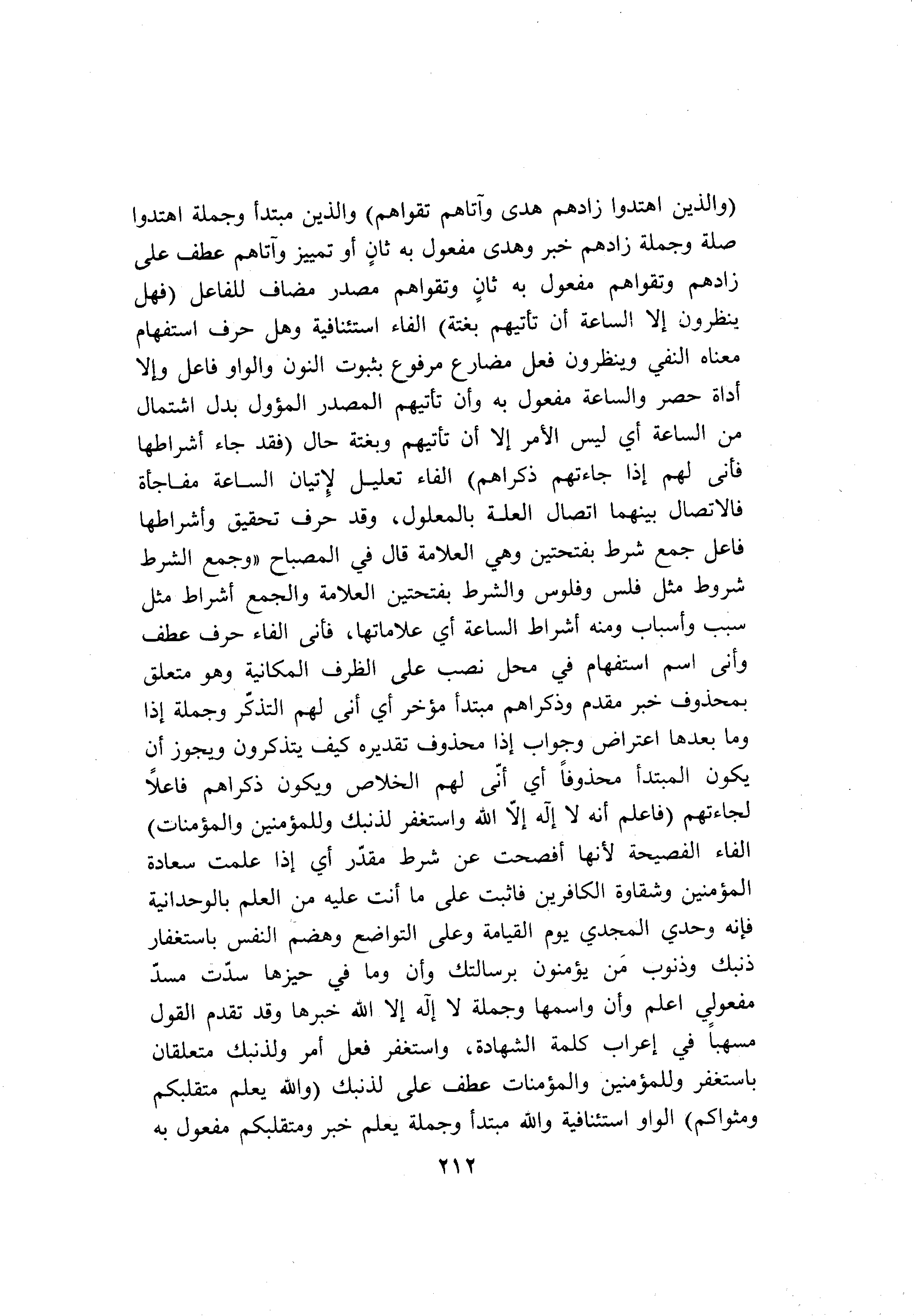 (وَالَّذِينَ اهْتَدَوْا زادَهُمْ هُدىً وَآتاهُمْ تَقْواهُمْ) والذين مبتدأ وجملة اهتدوا صلة وجملة زادهم خبر وهدى مفعول به ثان أو تمييز وآتاهم عطف على زادهم وتقواهم مفعول به ثان وتقواهم مصدر مضاف للفاعل (فَهَلْ يَنْظُرُونَ إِلَّا السَّاعَةَ أَنْ تَأْتِيَهُمْ بَغْتَةً) الفاء استئنافية وهل حرف استفهام معناه النفي وينظرون فعل مضارع مرفوع بثبوت النون والواو فاعل وإلا أداة حصر والساعة مفعول به وأن تأتيهم المصدر المؤول بدل اشتمال من الساعة أي ليس الأمر إلا أن تأتيهم وبغتة حال (فَقَدْ جاءَ أَشْراطُها فَأَنَّى لَهُمْ إِذا جاءَتْهُمْ ذِكْراهُمْ) الفاء تعليل لإتيان الساعة مفاجأة فالاتصال بينهما اتصال العلة بالمعلول، وقد حرف تحقيق وأشراطها فاعل جمع شرط بفتحتين وهي العلامة قال في المصباح «وجمع الشرط شروط مثل فلس وفلوس والشرط بفتحتين العلامة والجمع أشراط مثل سبب وأسباب ومنه أشراط الساعة أي علاماتها، فأنى الفاء حرف عطف وأنى اسم استفهام في محل نصب على الظرف المكانية وهو متعلق بمحذوف خبر مقدم وذكراهم مبتدأ مؤخر أي أنى لهم التذكّر وجملة إذا وما بعدها اعتراض وجواب إذا محذوف تقديره كيف يتذكرون ويجوز أن يكون المبتدأ محذوفا أي أنّى لهم الخلاص ويكون ذكراهم فاعلا لجاءتهم (فَاعْلَمْ أَنَّهُ لا إِلهَ إِلَّا اللَّهُ وَاسْتَغْفِرْ لِذَنْبِكَ وَلِلْمُؤْمِنِينَ وَالْمُؤْمِناتِ) الفاء الفصيحة لأنها أفصحت عن شرط مقدّر أي إذا علمت سعادة المؤمنين وشقاوة الكافرين فاثبت على ما أنت عليه من العلم بالوحدانية فإنه وحدي المجدي يوم القيامة وعلى التواضع وهضم النفس باستغفار ذنبك وذنوب من يؤمنون برسالتك وأن وما في حيزها سدّت مسدّ مفعولي اعلم وأن واسمها وجملة لا إله إلا الله خبرها وقد تقدم القول مسهبا في إعراب كلمة الشهادة، واستغفر فعل أمر ولذنبك متعلقان باستغفر وللمؤمنين والمؤمنات عطف على لذنبك (وَاللَّهُ يَعْلَمُ مُتَقَلَّبَكُمْ وَمَثْواكُمْ) الواو استئنافية والله مبتدأ وجملة يعلم خبر ومتقلبكم مفعول به