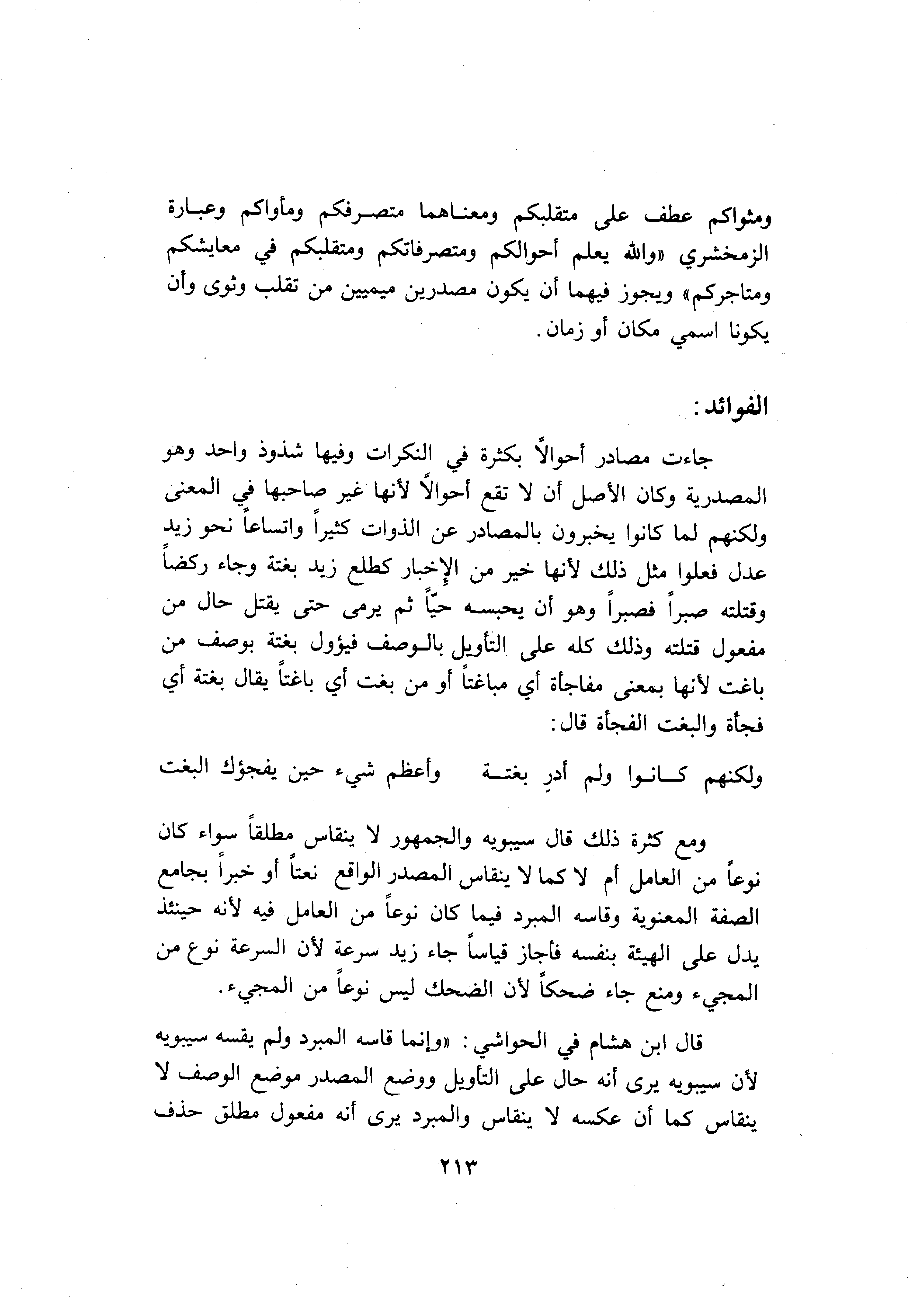 جاءت مصادر أحوالا بكثرة في النكرات وفيها شذوذ واحد وهو المصدرية وكان الأصل أن لا تقع أحوالا لأنها غير صاحبها في المعنى ولكنهم لما كانوا يخبرون بالمصادر عن الذوات كثيرا واتساعا نحو زيد عدل فعلوا مثل ذلك لأنها خير من الإخبار كطلع زيد بغتة وجاء ركضا وقتلته صبرا فصبرا وهو أن يحبسه حيّا ثم يرمى حتى يقتل حال من مفعول قتلته وذلك كله على التأويل بالوصف فيؤول بغتة بوصف من باغت لأنها بمعنى مفاجأة أي مباغتا أو من بغت أي باغتا يقال بغتة أي فجأة والبغت الفجأة قال: