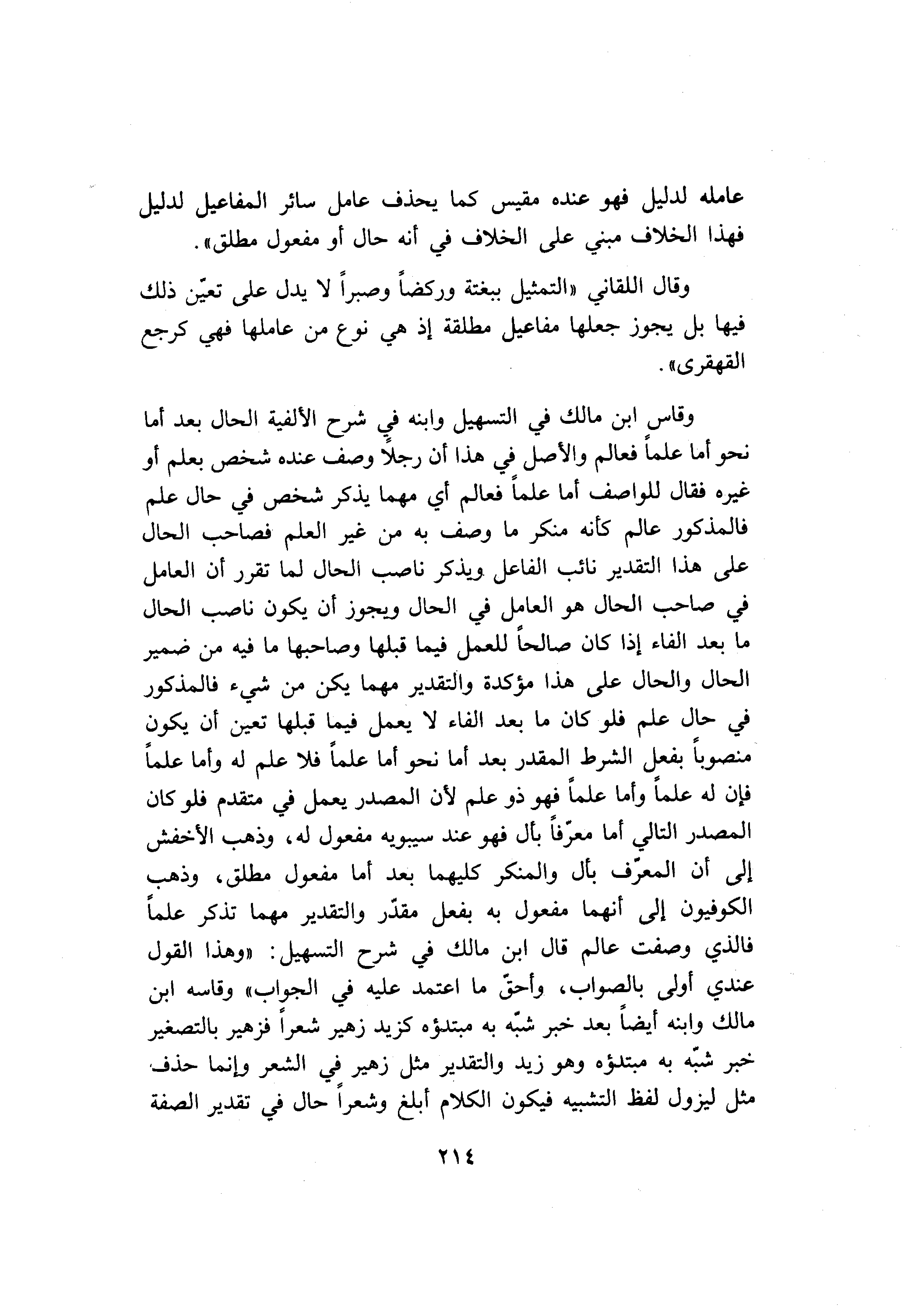 وقاس ابن مالك في التسهيل وابنه في شرح الألفية الحال بعد أما نحو أما علما فعالم والأصل في هذا أن رجلا وصف عنده شخص بعلم أو غيره فقال للواصف أما علما فعالم أي مهما يذكر شخص في حال علم فالمذكور عالم كأنه منكر ما وصف به من غير العلم فصاحب الحال على هذا التقدير نائب الفاعل ويذكر ناصب الحال لما تقرر أن العامل في صاحب الحال هو العامل في الحال ويجوز أن يكون ناصب الحال ما بعد الفاء إذا كان صالحا للعمل فيما قبلها وصاحبها ما فيه من ضمير الحال والحال على هذا مؤكدة والتقدير مهما يكن من شيء فالمذكور في حال علم فلو كان ما بعد الفاء لا يعمل فيما قبلها تعين أن يكون منصوبا بفعل الشرط المقدر بعد أما نحو أما علما فلا علم له وأما علما فإن له علما وأما علما فهو ذو علم لأن المصدر يعمل في متقدم فلو كان المصدر التالي أما معرّفا بأل فهو عند سيبويه مفعول له، وذهب الأخفش إلى أن المعرّف بأل والمنكر كليهما بعد أما مفعول مطلق، وذهب الكوفيون إلى أنهما مفعول به بفعل مقدّر والتقدير مهما تذكر علما فالذي وصفت عالم قال ابن مالك في شرح التسهيل: «وهذا القول عندي أولى بالصواب، وأحقّ ما اعتمد عليه في الجواب» وقاسه ابن مالك وابنه أيضا بعد خبر شبّه به مبتدؤه كزيد زهير شعرا فزهير بالتصغير خبر شبّه به مبتدؤه وهو زيد والتقدير مثل زهير في الشعر وإنما حذف مثل ليزول لفظ التشبيه فيكون الكلام أبلغ وشعرا حال في تقدير الصفة