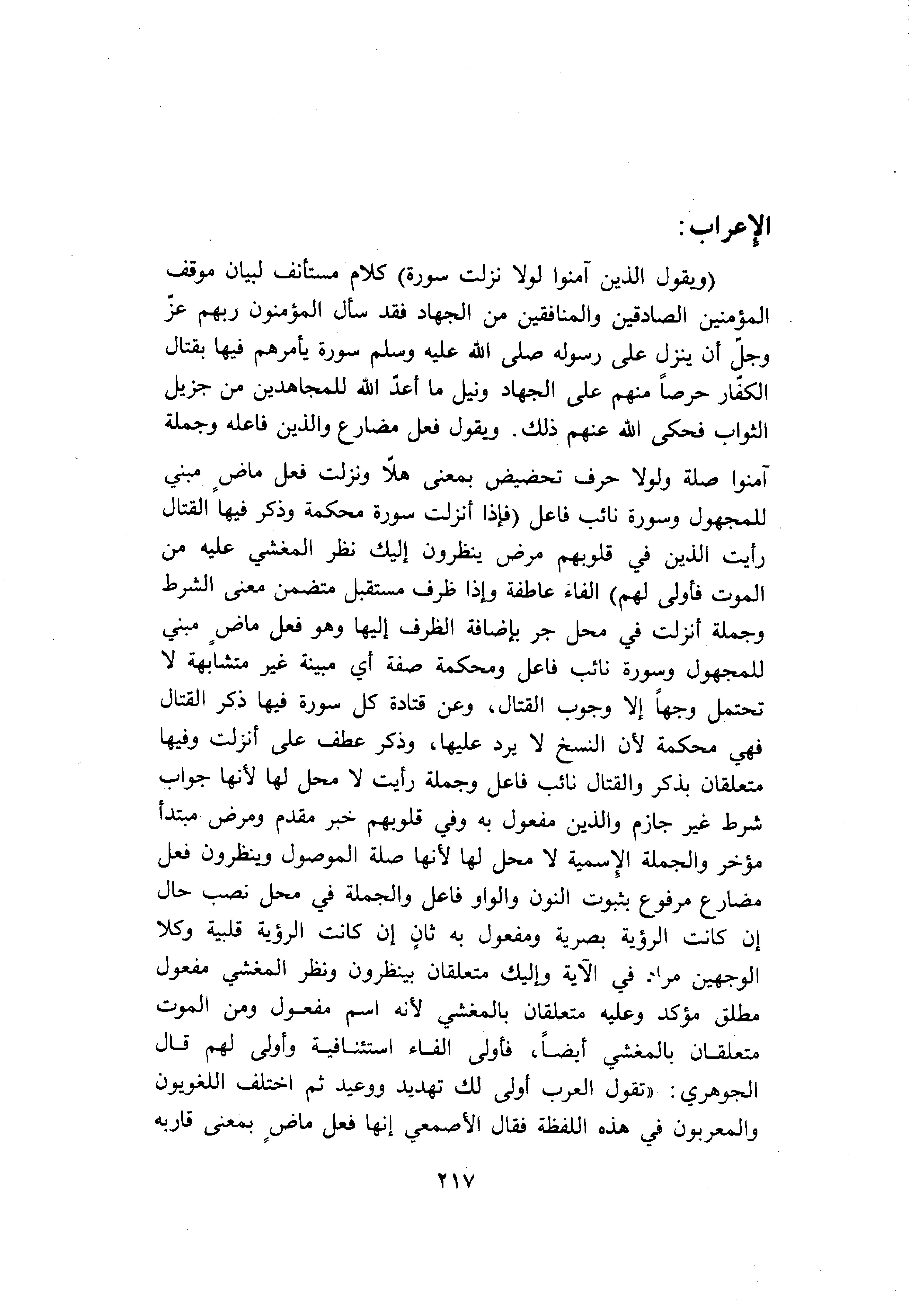 (وَيَقُولُ الَّذِينَ آمَنُوا لَوْلا نُزِّلَتْ سُورَةٌ) كلام مستأنف لبيان موقف المؤمنين الصادقين والمنافقين من الجهاد فقد سأل المؤمنون ربهم عزّ وجلّ أن ينزل على رسوله صلى الله عليه وسلم سورة يأمرهم فيها بقتال الكفّار حرصا منهم على الجهاد ونيل ما أعدّ الله للمجاهدين من جزيل الثواب فحكى الله عنهم ذلك. ويقول فعل مضارع والذين فاعله وجملة آمنوا صلة ولولا حرف تحضيض بمعنى هلّا ونزلت فعل ماض مبني للمجهول وسورة نائب فاعل (فَإِذا أُنْزِلَتْ سُورَةٌ مُحْكَمَةٌ وَذُكِرَ فِيهَا الْقِتالُ رَأَيْتَ الَّذِينَ فِي قُلُوبِهِمْ مَرَضٌ يَنْظُرُونَ إِلَيْكَ نَظَرَ الْمَغْشِيِّ عَلَيْهِ مِنَ الْمَوْتِ فَأَوْلى لَهُمْ) الفاء عاطفة وإذا ظرف مستقبل متضمن معنى الشرط وجملة أنزلت في محل جر بإضافة الظرف إليها وهو فعل ماض مبني للمجهول وسورة نائب فاعل ومحكمة صفة أي مبينة غير متشابهة لا تحتمل وجها إلا وجوب القتال، وعن قتادة كل سورة فيها ذكر القتال فهي محكمة لأن النسخ لا يرد عليها، وذكر عطف على أنزلت وفيها متعلقان بذكر والقتال نائب فاعل وجملة رأيت لا محل لها لأنها جواب شرط غير جازم والذين مفعول به وفي قلوبهم خبر مقدم ومرض مبتدأ مؤخر والجملة الاسمية لا محل لها لأنها صلة الموصول وينظرون فعل مضارع مرفوع بثبوت النون والواو فاعل والجملة في محل نصب حال إن كانت الرؤية بصرية ومفعول به ثان إن كانت الرؤية قلبية وكلا الوجهين مراد في الآية وإليك متعلقان بينظرون ونظر المغشي مفعول مطلق مؤكد وعليه متعلقان بالمغشي لأنه اسم مفعول ومن الموت متعلقان بالمغشي أيضا، فأولى الفاء استئنافية وأولى لهم قال الجوهري: «تقول العرب أولى لك تهديد ووعيد ثم اختلف اللغويون والمعربون في هذه اللفظة فقال الأصمعي إنها فعل ماض بمعنى قاربه