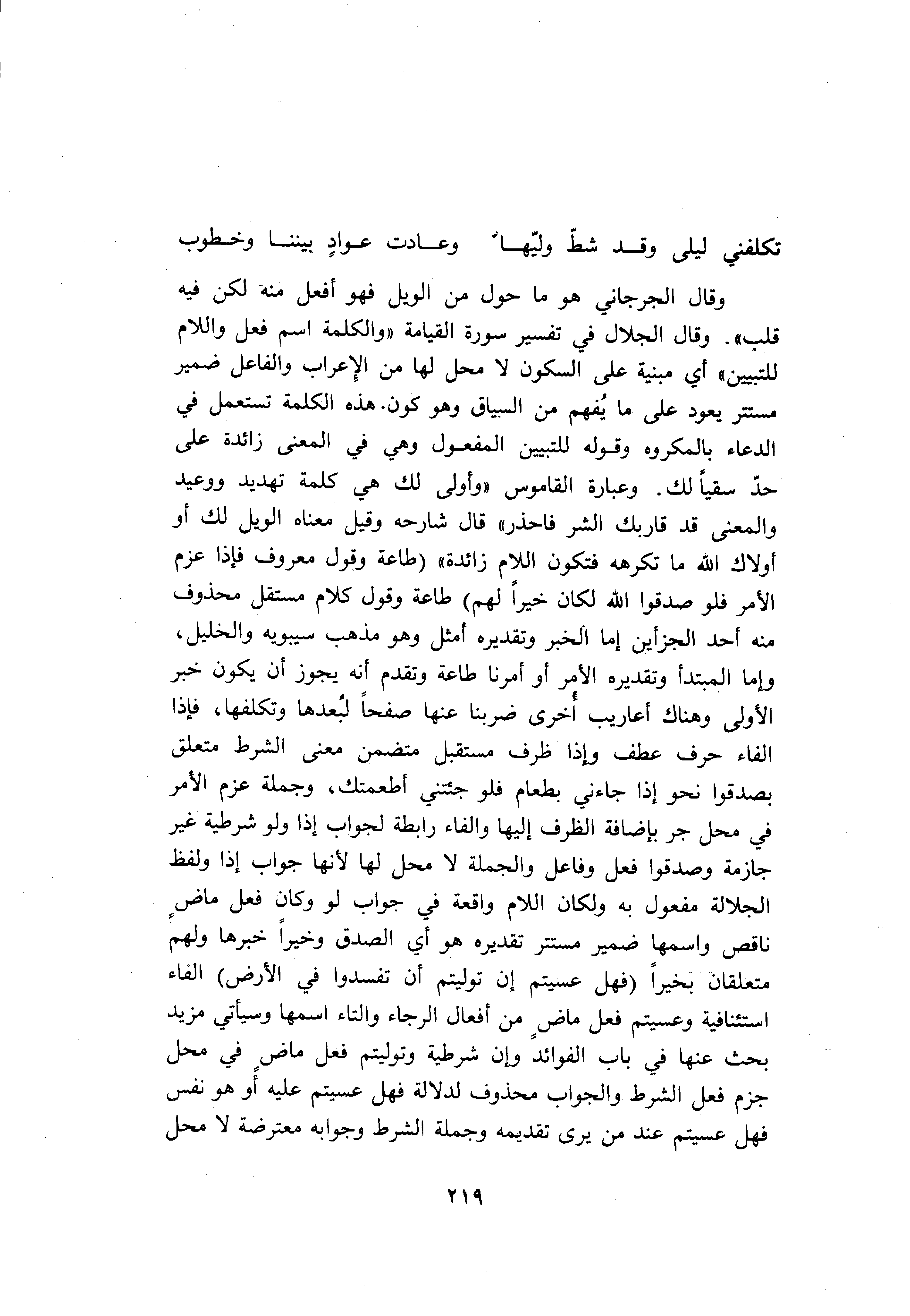 وقال الجرجاني هو ما حول من الويل فهو أفعل منه لكن فيه قلب» . وقال الجلال في تفسير سورة القيامة «والكلمة اسم فعل واللام للتبيين» أي مبنية على السكون لا محل لها من الإعراب والفاعل ضمير مستتر يعود على ما يفهم من السياق وهو كون هذه الكلمة تستعمل في الدعاء بالمكروه وقوله للتبيين المفعول وهي في المعنى زائدة على حدّ سقيا لك. وعبارة القاموس «وأولى لك هي كلمة تهديد ووعيد والمعنى قد قاربك الشر فاحذر» قال شارحه وقيل معناه الويل لك أو أولاك الله ما تكرهه فتكون اللام زائدة» (طاعَةٌ وَقَوْلٌ مَعْرُوفٌ فَإِذا عَزَمَ الْأَمْرُ فَلَوْ صَدَقُوا اللَّهَ لَكانَ خَيْراً لَهُمْ) طاعة وقول كلام مستقل محذوف منه أحد الجزأين إما الخبر وتقديره أمثل وهو مذهب سيبويه والخليل، وإما المبتدأ وتقديره الأمر أو أمرنا طاعة وتقدم أنه يجوز أن يكون خبر الأولى وهناك أعاريب أخرى ضربنا عنها صفحا لبعدها وتكلفها، فإذا الفاء حرف عطف وإذا ظرف مستقبل متضمن معنى الشرط متعلق بصدقوا نحو إذا جاءني بطعام فلو جئتني أطعمتك، وجملة عزم الأمر في محل جر بإضافة الظرف إليها والفاء رابطة لجواب إذا ولو شرطية غير جازمة وصدقوا فعل وفاعل والجملة لا محل لها لأنها جواب إذا ولفظ الجلالة مفعول به ولكان اللام واقعة في جواب لو وكان فعل ماض ناقص واسمها ضمير مستتر تقديره هو أي الصدق وخيرا خبرها ولهم متعلقان بخيرا (فَهَلْ عَسَيْتُمْ إِنْ تَوَلَّيْتُمْ أَنْ تُفْسِدُوا فِي الْأَرْضِ) الفاء استئنافية وعسيتم فعل ماض من أفعال الرجاء والتاء اسمها وسيأتي مزيد بحث عنها في باب الفوائد وإن شرطية وتوليتم فعل ماض في محل جزم فعل الشرط والجواب محذوف لدلالة فهل عسيتم عليه أو هو نفس فهل عسيتم عند من يرى تقديمه وجملة الشرط وجوابه معترضة لا محل