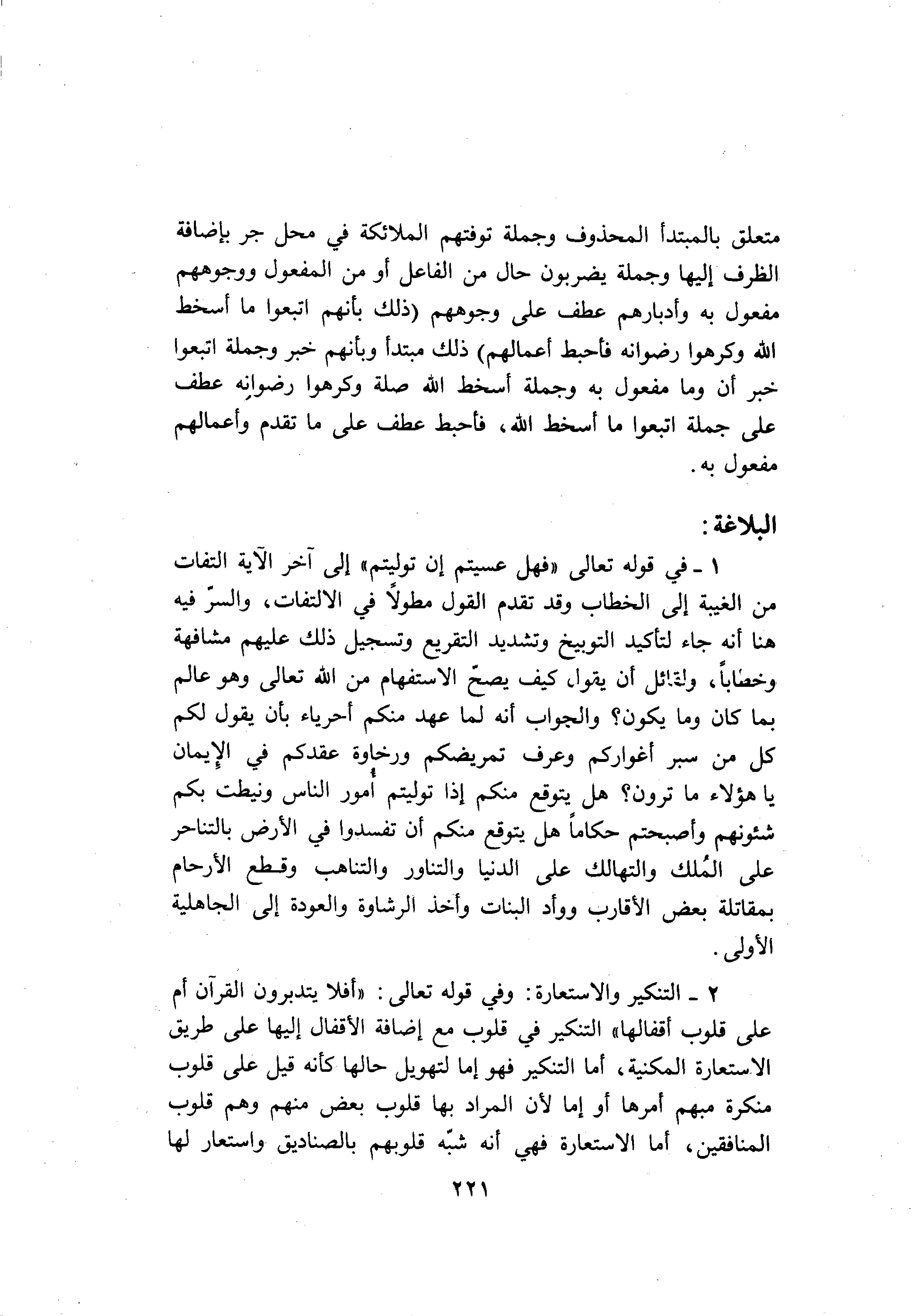 2- التنكير والاستعارة: وفي قوله تعالى: «أفلا يتدبرون القرآن أم على قلوب أقفالها» التنكير في قلوب مع إضافة الأقفال إليها على طريق الاستعارة المكنية، أما التنكير فهو إما لتهويل حالها كأنه قيل على قلوب منكرة مبهم أمرها أو إما لأن المراد بها قلوب بعض منهم وهم قلوب المنافقين، أما الاستعارة فهي أنه شبّه قلوبهم بالصناديق واستعار لها
