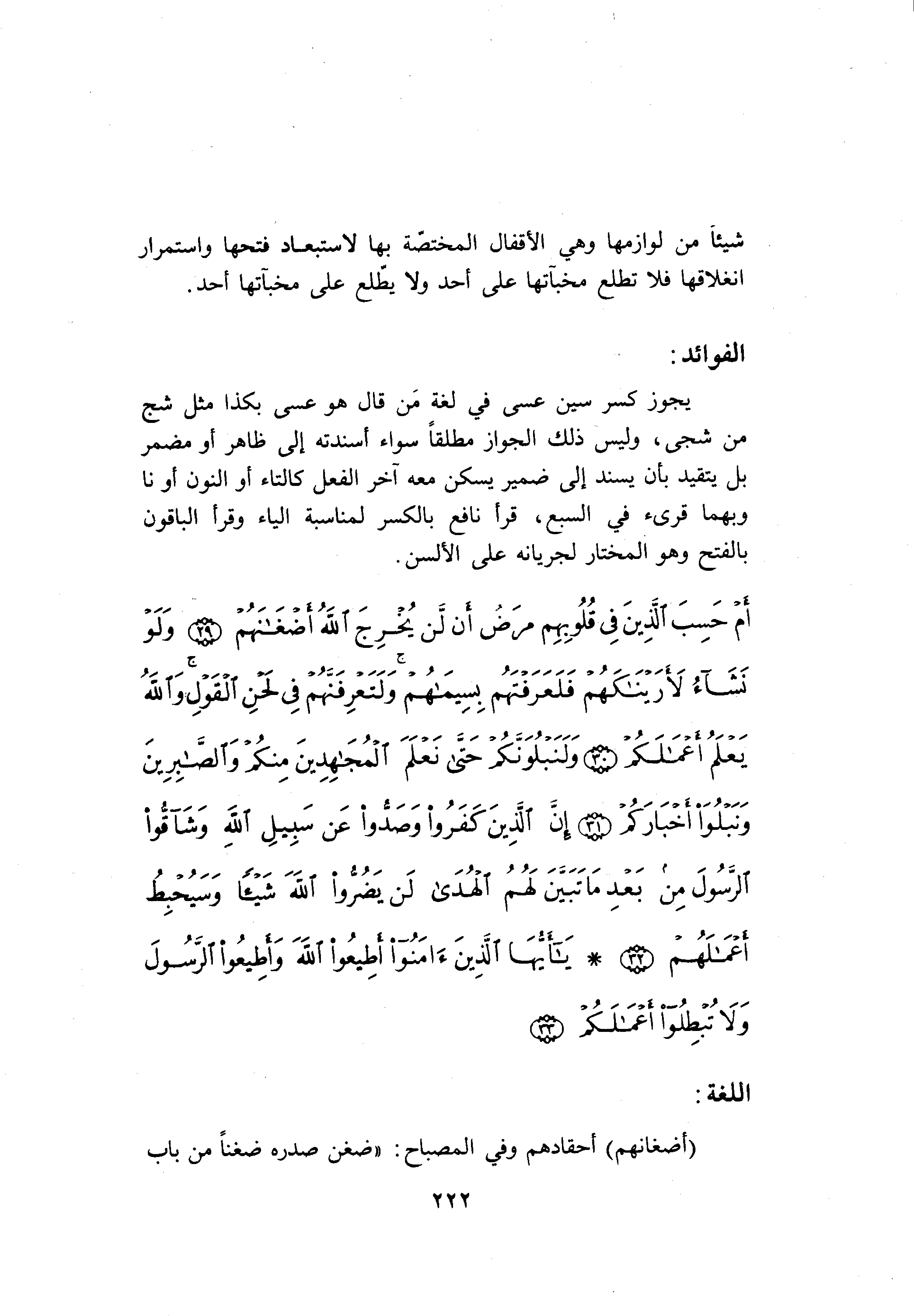 يجوز كسر سين عسى في لغة من قال هو عسى بكذا مثل شج من شجى، وليس ذلك الجواز مطلقا سواء أسندته إلى ظاهر أو مضمر بل يتقيد بأن يسند إلى ضمير يسكن معه آخر الفعل كالتاء أو النون أو نا وبهما قرئ في السبع، قرأ نافع بالكسر لمناسبة الياء وقرأ الباقون بالفتح وهو المختار لجريانه على الألسن.