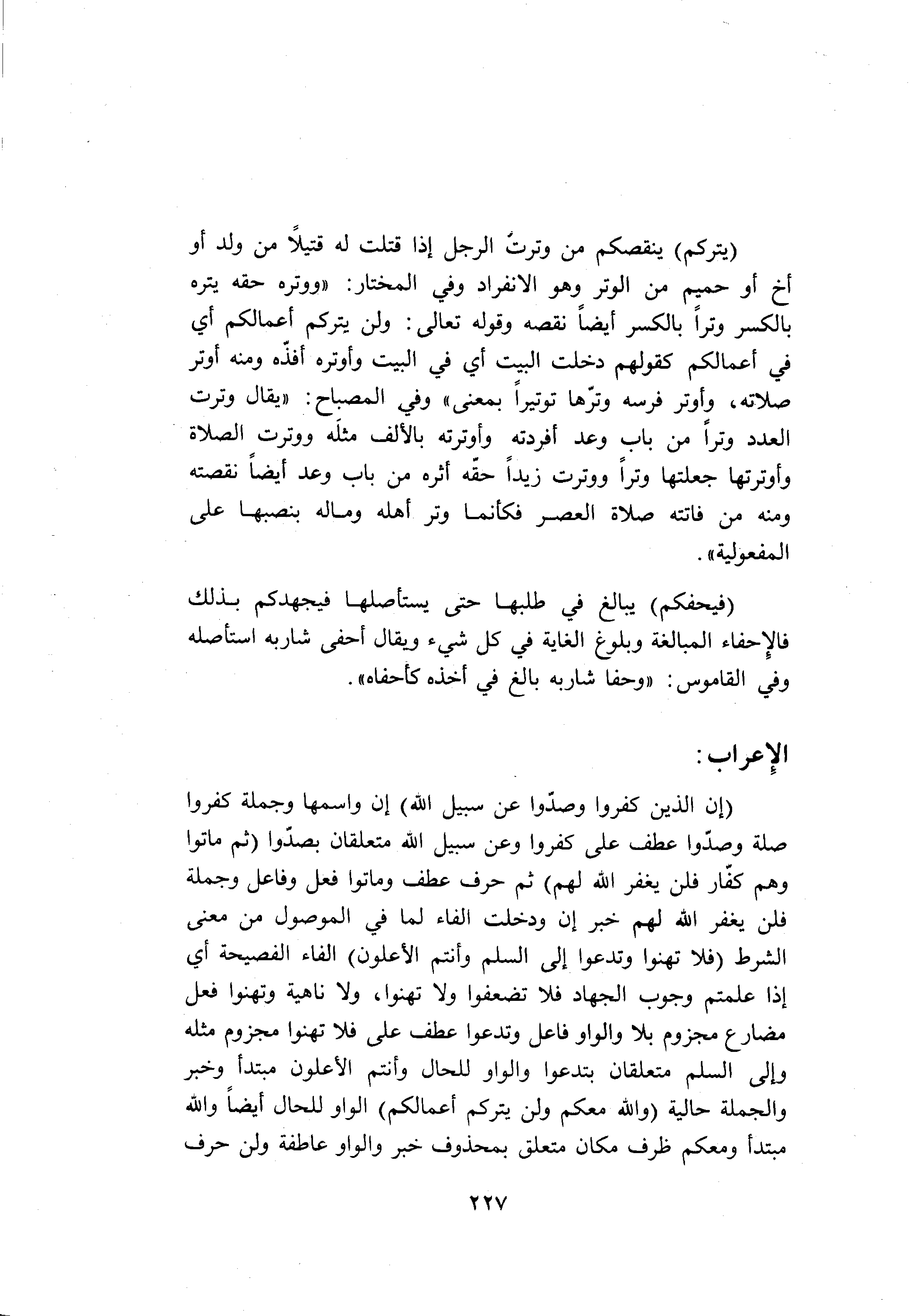 (إِنَّ الَّذِينَ كَفَرُوا وَصَدُّوا عَنْ سَبِيلِ اللَّهِ) إن واسمها وجملة كفروا صلة وصدّوا عطف على كفروا وعن سبيل الله متعلقان بصدّوا (ثُمَّ ماتُوا وَهُمْ كُفَّارٌ فَلَنْ يَغْفِرَ اللَّهُ لَهُمْ) ثم حرف عطف وماتوا فعل وفاعل وجملة فلن يغفر الله لهم خبر إن ودخلت الفاء لما في الموصول من معنى الشرط (فَلا تَهِنُوا وَتَدْعُوا إِلَى السَّلْمِ وَأَنْتُمُ الْأَعْلَوْنَ) الفاء الفصيحة أي إذا علمتم وجوب الجهاد فلا تضعفوا ولا تهنوا، ولا ناهية وتهنوا فعل مضارع مجزوم بلا والواو فاعل وتدعوا عطف على فلا تهنوا مجزوم مثله وإلى السلم متعلقان بتدعوا والواو للحال وأنتم الأعلون مبتدأ وخبر والجملة حالية (وَاللَّهُ مَعَكُمْ وَلَنْ يَتِرَكُمْ أَعْمالَكُمْ) الواو للحال أيضا والله مبتدأ ومعكم ظرف مكان متعلق بمحذوف خبر والواو عاطفة ولن حرف
