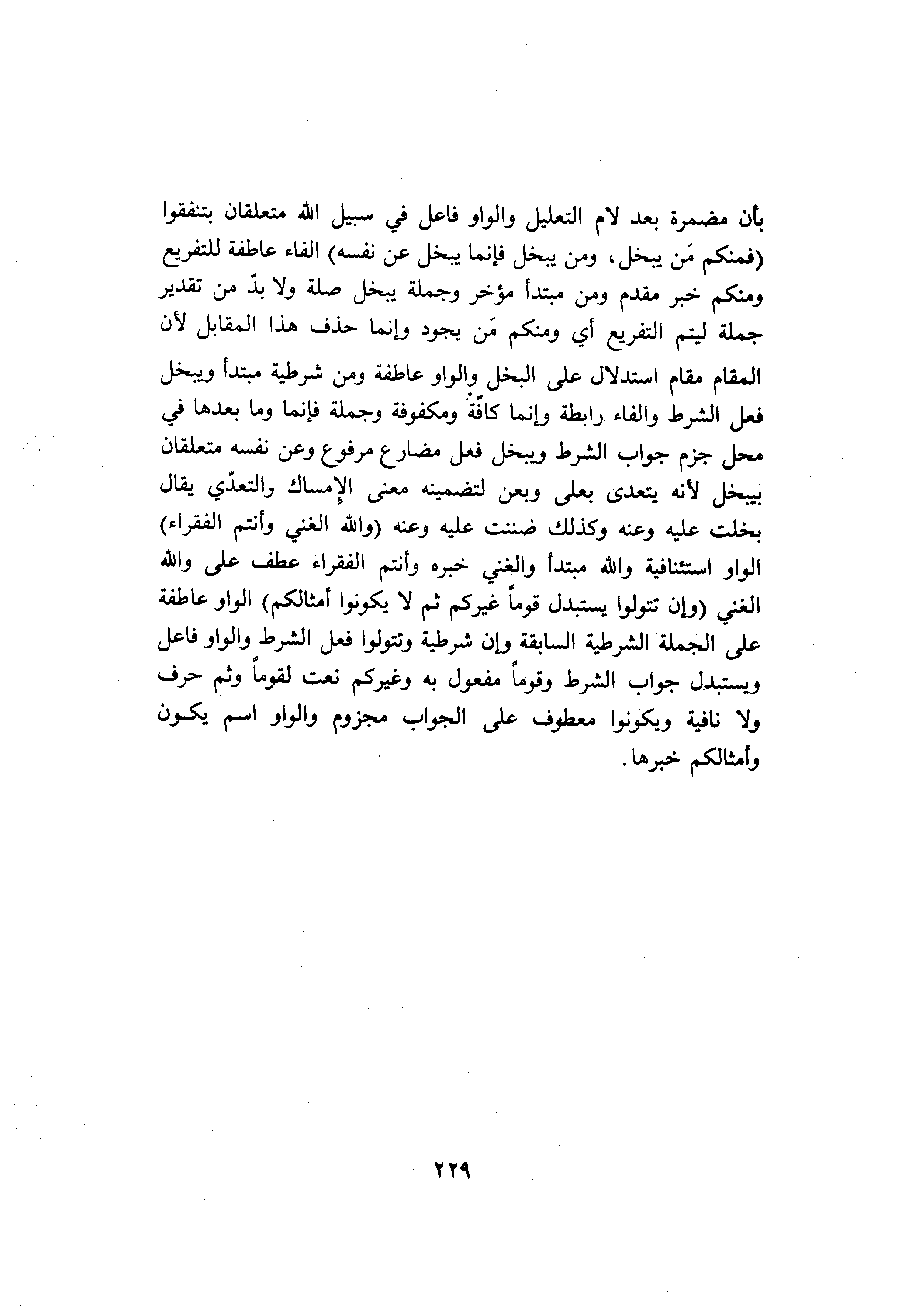 بأن مضمرة بعد لام التعليل والواو فاعل في سبيل الله متعلقان بتنفقوا (فَمِنْكُمْ مَنْ يَبْخَلُ، وَمَنْ يَبْخَلْ فَإِنَّما يَبْخَلُ عَنْ نَفْسِهِ) الفاء عاطفة للتفريع ومنكم خبر مقدم ومن مبتدأ مؤخر وجملة يبخل صلة ولا بدّ من تقدير جملة ليتم التفريع أي ومنكم من يجود وإنما حذف هذا المقابل لأن المقام مقام استدلال على البخل والواو عاطفة ومن شرطية مبتدأ ويبخل فعل الشرط والفاء رابطة وإنما كافّة ومكفوفة وجملة فإنما وما بعدها في محل جزم جواب الشرط ويبخل فعل مضارع مرفوع وعن نفسه متعلقان بيبخل لأنه يتعدى بعلى وبعن لتضمينه معنى الإمساك والتعدّي يقال بخلت عليه وعنه وكذلك ضننت عليه وعنه (وَاللَّهُ الْغَنِيُّ وَأَنْتُمُ الْفُقَراءُ) الواو استئنافية والله مبتدأ والغني خبره وأنتم الفقراء عطف على والله الغني (وَإِنْ تَتَوَلَّوْا يَسْتَبْدِلْ قَوْماً غَيْرَكُمْ ثُمَّ لا يَكُونُوا أَمْثالَكُمْ) الواو عاطفة على الجملة الشرطية السابقة وإن شرطية وتتولوا فعل الشرط والواو فاعل ويستبدل جواب الشرط وقوما مفعول به وغيركم نعت لقوما وثم حرف ولا نافية ويكونوا معطوف على الجواب مجزوم والواو اسم يكون وأمثالكم خبرها.
