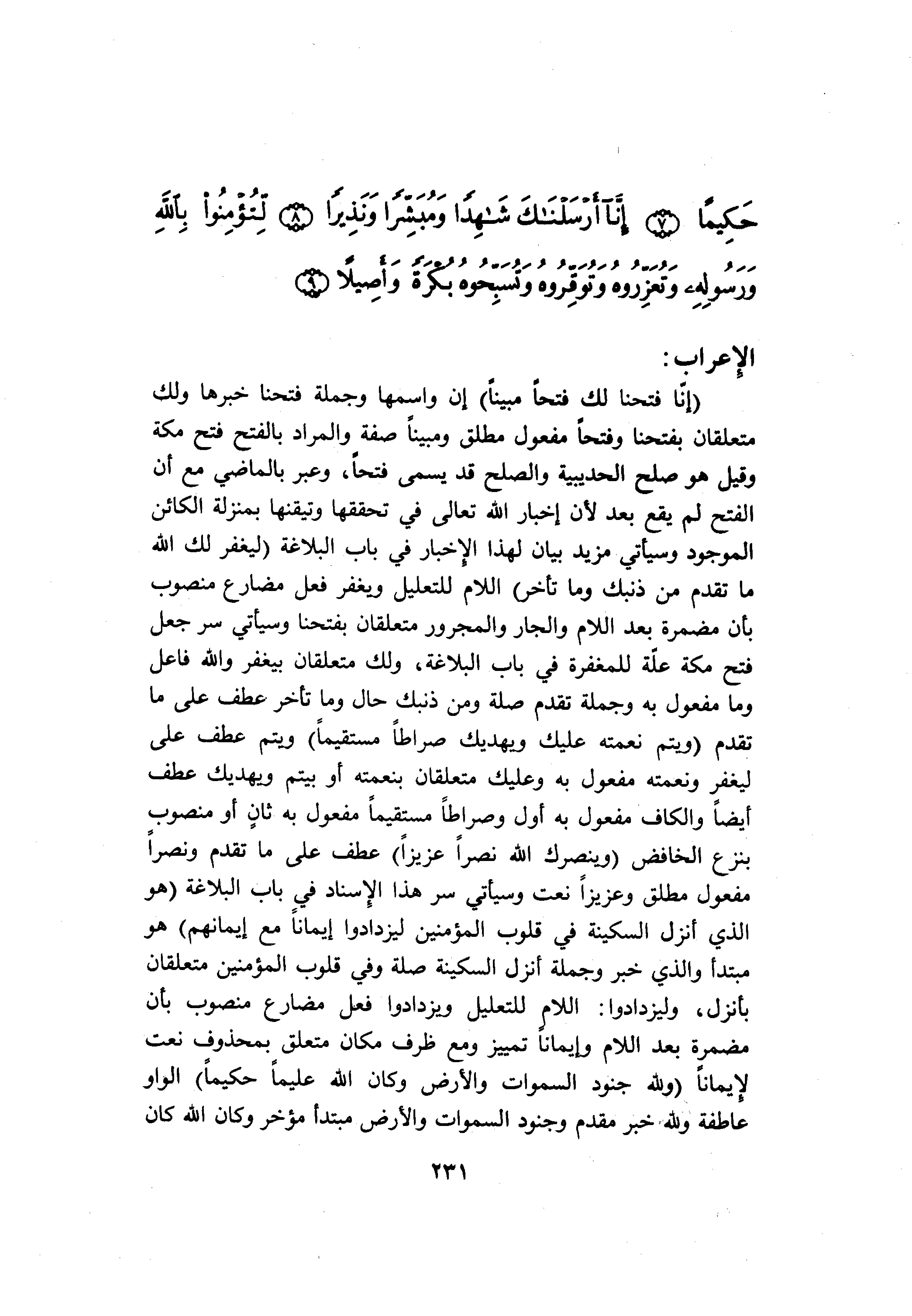 (إِنَّا فَتَحْنا لَكَ فَتْحاً مُبِيناً) إن واسمها وجملة فتحنا خبرها ولك متعلقان بفتحنا وفتحا مفعول مطلق ومبينا صفة والمراد بالفتح فتح مكة وقيل هو صلح الحديبية والصلح قد يسمى فتحا، وعبر بالماضي مع أن الفتح لم يقع بعد لأن إخبار الله تعالى في تحققها وتيقنها بمنزلة الكائن الموجود وسيأتي مزيد بيان لهذا الإخبار في باب البلاغة (لِيَغْفِرَ لَكَ اللَّهُ ما تَقَدَّمَ مِنْ ذَنْبِكَ وَما تَأَخَّرَ) اللام للتعليل ويغفر فعل مضارع منصوب بأن مضمرة بعد اللام والجار والمجرور متعلقان بفتحنا وسيأتي سر جعل فتح مكة علّة للمغفرة في باب البلاغة، ولك متعلقان بيغفر والله فاعل وما مفعول به وجملة تقدم صلة ومن ذنبك حال وما تأخر عطف على ما تقدم (وَيُتِمَّ نِعْمَتَهُ عَلَيْكَ وَيَهْدِيَكَ صِراطاً مُسْتَقِيماً) ويتم عطف على ليغفر ونعمته مفعول به وعليك متعلقان بنعمته أو بيتم ويهديك عطف أيضا والكاف مفعول به أول وصراطا مستقيما مفعول به ثان أو منصوب بنزع الخافض (وَيَنْصُرَكَ اللَّهُ نَصْراً عَزِيزاً) عطف على ما تقدم ونصرا مفعول مطلق وعزيزا نعت وسيأتي سر هذا الإسناد في باب البلاغة (هُوَ الَّذِي أَنْزَلَ السَّكِينَةَ فِي قُلُوبِ الْمُؤْمِنِينَ لِيَزْدادُوا إِيماناً مَعَ إِيمانِهِمْ) هو مبتدأ والذي خبر وجملة أنزل السكينة صلة وفي قلوب المؤمنين متعلقان بأنزل، وليزدادوا: اللام للتعليل ويزدادوا فعل مضارع منصوب بأن مضمرة بعد اللام وإيمانا تمييز ومع ظرف مكان متعلق بمحذوف نعت لإيمانا (وَلِلَّهِ جُنُودُ السَّماواتِ وَالْأَرْضِ وَكانَ اللَّهُ عَلِيماً حَكِيماً) الواو عاطفة ولله خبر مقدم وجنود السموات والأرض مبتدأ مؤخر وكان الله كان