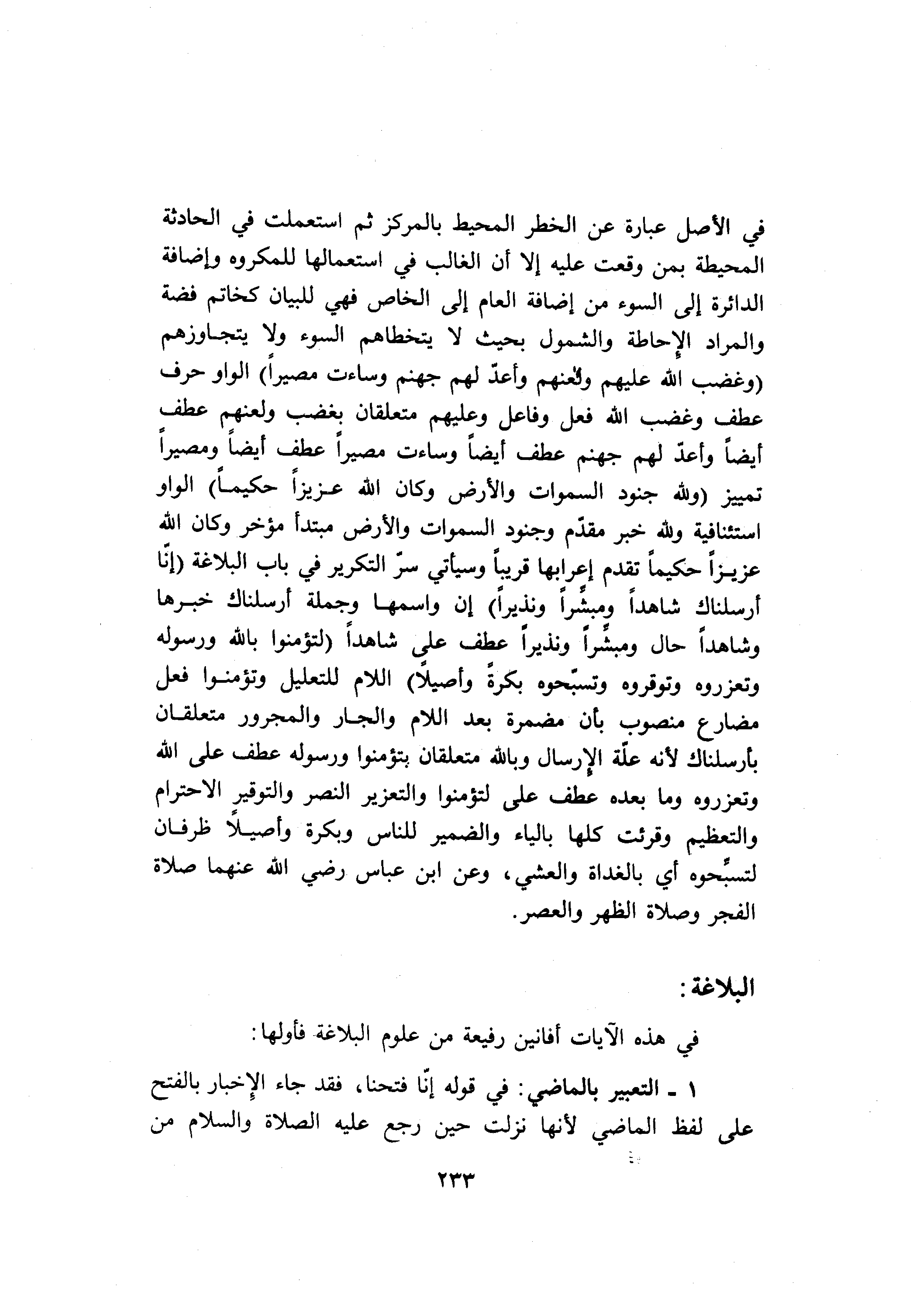 ولله خبر مقدّم وجنود السموات والأرض مبتدأ مؤخر وكان الله عزيزا حكيما تقدم إعرابها قريبا وسيأتي سرّ التكرير في باب البلاغة (إِنَّا أَرْسَلْناكَ شاهِداً وَمُبَشِّراً وَنَذِيراً) إن واسمها وجملة أرسلناك خبرها وشاهدا حال ومبشرا ونذيرا عطف على شاهدا (لِتُؤْمِنُوا بِاللَّهِ وَرَسُولِهِ وَتُعَزِّرُوهُ وَتُوَقِّرُوهُ وَتُسَبِّحُوهُ بُكْرَةً وَأَصِيلًا) اللام للتعليل وتؤمنوا فعل مضارع منصوب بأن مضمرة بعد اللام والجار والمجرور متعلقان بأرسلناك لأنه علّة الإرسال وبالله متعلقان بتؤمنوا ورسوله عطف على الله وتعزروه وما بعده عطف على لتؤمنوا والتعزير النصر والتوقير الاحترام والتعظيم وقرئت كلها بالياء والضمير للناس وبكرة وأصيلا ظرفان لتسبّحوه أي بالغداة والعشي، وعن ابن عباس رضي الله عنهما صلاة الفجر وصلاة الظهر والعصر.