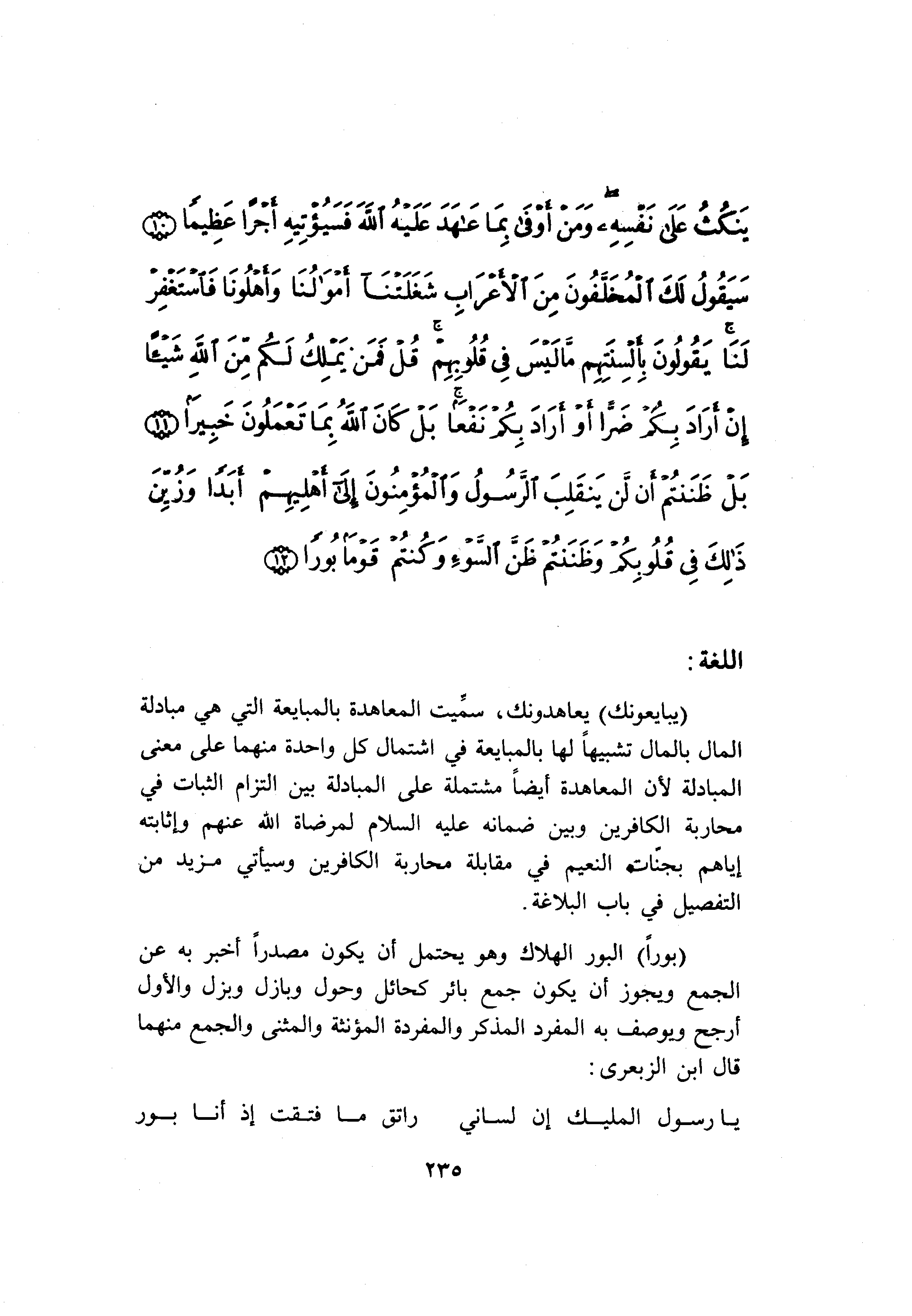 (بُوراً) البور الهلاك وهو يحتمل أن يكون مصدرا أخبر به عن الجمع ويجوز أن يكون جمع بائر كحائل وحول وبازل وبزل والأول أرجح ويوصف به المفرد المذكر والمفردة المؤنثة والمثنى والجمع منهما قال ابن الزبعرى: