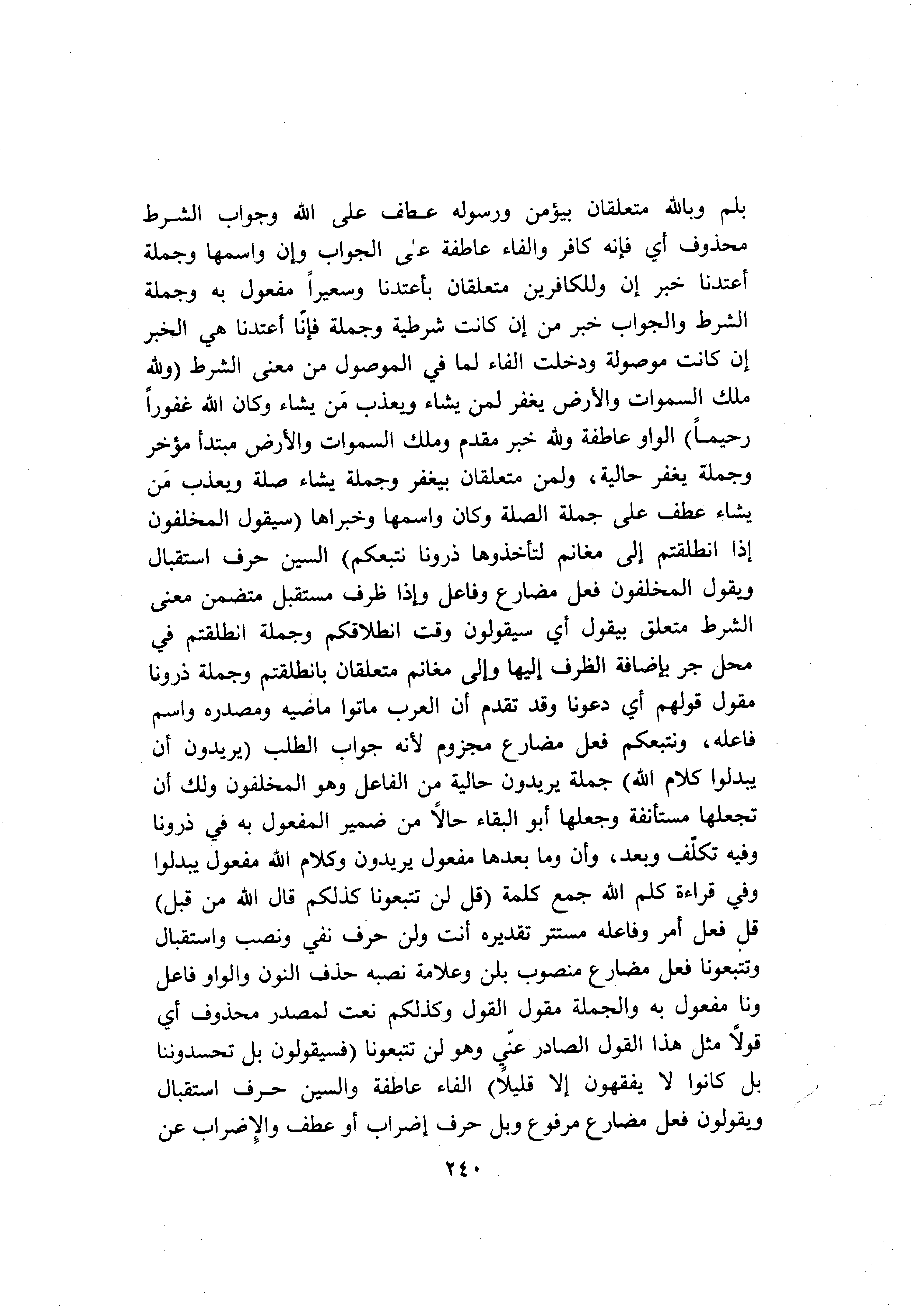 بلم وبالله متعلقان بيؤمن ورسوله عطف على الله وجواب الشرط محذوف أي فإنه كافر والفاء عاطفة على الجواب وإن واسمها وجملة أعتدنا خبر إن وللكافرين متعلقان بأعتدنا وسعيرا مفعول به وجملة الشرط والجواب خبر من إن كانت شرطية وجملة فإنّا أعتدنا هي الخبر إن كانت موصولة ودخلت الفاء لما في الموصول من معنى الشرط (وَلِلَّهِ مُلْكُ السَّماواتِ وَالْأَرْضِ يَغْفِرُ لِمَنْ يَشاءُ وَيُعَذِّبُ مَنْ يَشاءُ وَكانَ اللَّهُ غَفُوراً رَحِيماً) الواو عاطفة ولله خبر مقدم وملك السموات والأرض مبتدأ مؤخر وجملة يغفر حالية، ولمن متعلقان بيغفر وجملة يشاء صلة ويعذب من يشاء عطف على جملة الصلة وكان واسمها وخبراها (سَيَقُولُ الْمُخَلَّفُونَ إِذَا انْطَلَقْتُمْ إِلى مَغانِمَ لِتَأْخُذُوها ذَرُونا نَتَّبِعْكُمْ) السين حرف استقبال ويقول المخلفون فعل مضارع وفاعل وإذا ظرف مستقبل متضمن معنى الشرط متعلق بيقول أي سيقولون وقت انطلاقكم وجملة انطلقتم في محل جر بإضافة الظرف إليها وإلى مغانم متعلقان بانطلقتم وجملة ذرونا مقول قولهم أي دعونا وقد تقدم أن العرب ماتوا ماضيه ومصدره واسم فاعله، ونتبعكم فعل مضارع مجزوم لأنه جواب الطلب (يُرِيدُونَ أَنْ يُبَدِّلُوا كَلامَ اللَّهِ) جملة يريدون حالية من الفاعل وهو المخلفون ولك أن تجعلها مستأنفة وجعلها أبو البقاء حالا من ضمير المفعول به في ذرونا وفيه تكلّف وبعد، وأن وما بعدها مفعول يريدون وكلام الله مفعول يبدلوا وفي قراءة كلم الله جمع كلمة (قُلْ لَنْ تَتَّبِعُونا كَذلِكُمْ قالَ اللَّهُ مِنْ قَبْلُ) قل فعل أمر وفاعله مستتر تقديره أنت ولن حرف نفي ونصب واستقبال وتتبعونا فعل مضارع منصوب بلن وعلامة نصبه حذف النون والواو فاعل ونا مفعول به والجملة مقول القول وكذلكم نعت لمصدر محذوف أي قولا مثل هذا القول الصادر عنّي وهو لن تتبعونا (فَسَيَقُولُونَ بَلْ تَحْسُدُونَنا بَلْ كانُوا لا يَفْقَهُونَ إِلَّا قَلِيلًا) الفاء عاطفة والسين حرف استقبال ويقولون فعل مضارع مرفوع وبل حرف إضراب أو عطف والإضراب عن