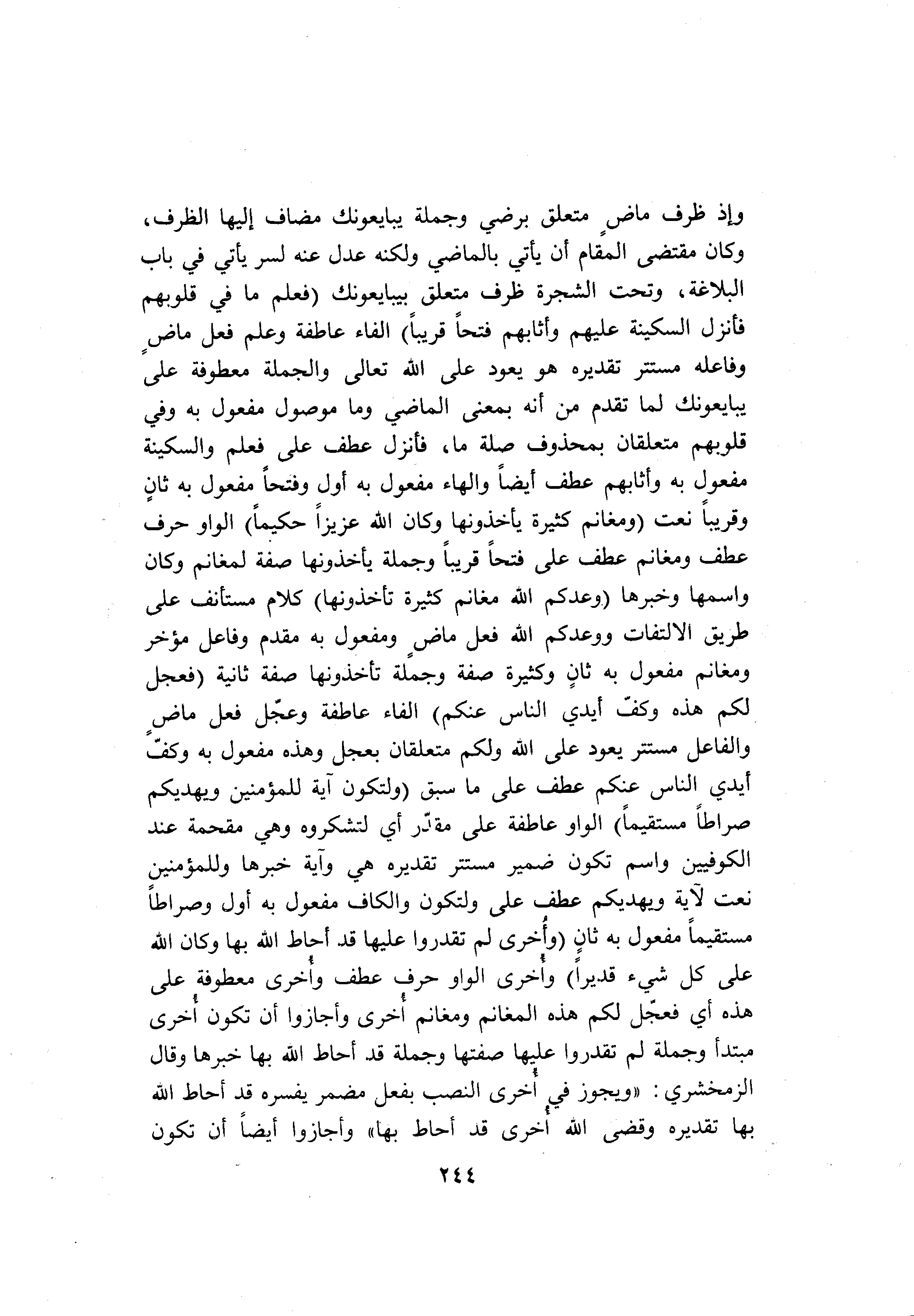 وإذ ظرف ماض متعلق برضي وجملة يبايعونك مضاف إليها الظرف، وكان مقتضى المقام أن يأتي بالماضي ولكنه عدل عنه لسر يأتي في باب البلاغة، وتحت الشجرة ظرف متعلق بيبايعونك (فَعَلِمَ ما فِي قُلُوبِهِمْ فَأَنْزَلَ السَّكِينَةَ عَلَيْهِمْ وَأَثابَهُمْ فَتْحاً قَرِيباً) الفاء عاطفة وعلم فعل ماض وفاعله مستتر تقديره هو يعود على الله تعالى والجملة معطوفة على يبايعونك لما تقدم من أنه بمعنى الماضي وما موصول مفعول به وفي قلوبهم متعلقان بمحذوف صلة ما، فأنزل عطف على فعلم والسكينة مفعول به وأثابهم عطف أيضا والهاء مفعول به أول وفتحا مفعول به ثان وقريبا نعت (وَمَغانِمَ كَثِيرَةً يَأْخُذُونَها وَكانَ اللَّهُ عَزِيزاً حَكِيماً) الواو حرف عطف ومغانم عطف على فتحا قريبا وجملة يأخذونها صفة لمغانم وكان واسمها وخبرها (وَعَدَكُمُ اللَّهُ مَغانِمَ كَثِيرَةً تَأْخُذُونَها) كلام مستأنف على طريق الالتفات ووعدكم الله فعل ماض ومفعول به مقدم وفاعل مؤخر ومغانم مفعول به ثان وكثيرة صفة وجملة تأخذونها صفة ثانية (فَعَجَّلَ لَكُمْ هذِهِ وَكَفَّ أَيْدِيَ النَّاسِ عَنْكُمْ) الفاء عاطفة وعجّل فعل ماض والفاعل مستتر يعود على الله ولكم متعلقان بعجل وهذه مفعول به وكفّ أيدي الناس عنكم عطف على ما سبق (وَلِتَكُونَ آيَةً لِلْمُؤْمِنِينَ وَيَهْدِيَكُمْ صِراطاً مُسْتَقِيماً) الواو عاطفة على مقدّر أي لتشكروه وهي مقحمة عند الكوفيين واسم تكون ضمير مستتر تقديره هي وآية خبرها وللمؤمنين نعت لآية ويهديكم عطف على ولتكون والكاف مفعول به أول وصراطا مستقيما مفعول به ثان (وَأُخْرى لَمْ تَقْدِرُوا عَلَيْها قَدْ أَحاطَ اللَّهُ بِها وَكانَ اللَّهُ عَلى كُلِّ شَيْءٍ قَدِيراً) وأخرى الواو حرف عطف وأخرى معطوفة على هذه أي فعجّل لكم هذه المغانم ومغانم أخرى وأجازوا أن تكون أخرى مبتدأ وجملة لم تقدروا عليها صفتها وجملة قد أحاط الله بها خبرها وقال الزمخشري: «ويجوز في أخرى النصب بفعل مضمر يفسره قد أحاط الله بها تقديره وقضى الله أخرى قد أحاط بها» وأجازوا أيضا أن تكون
