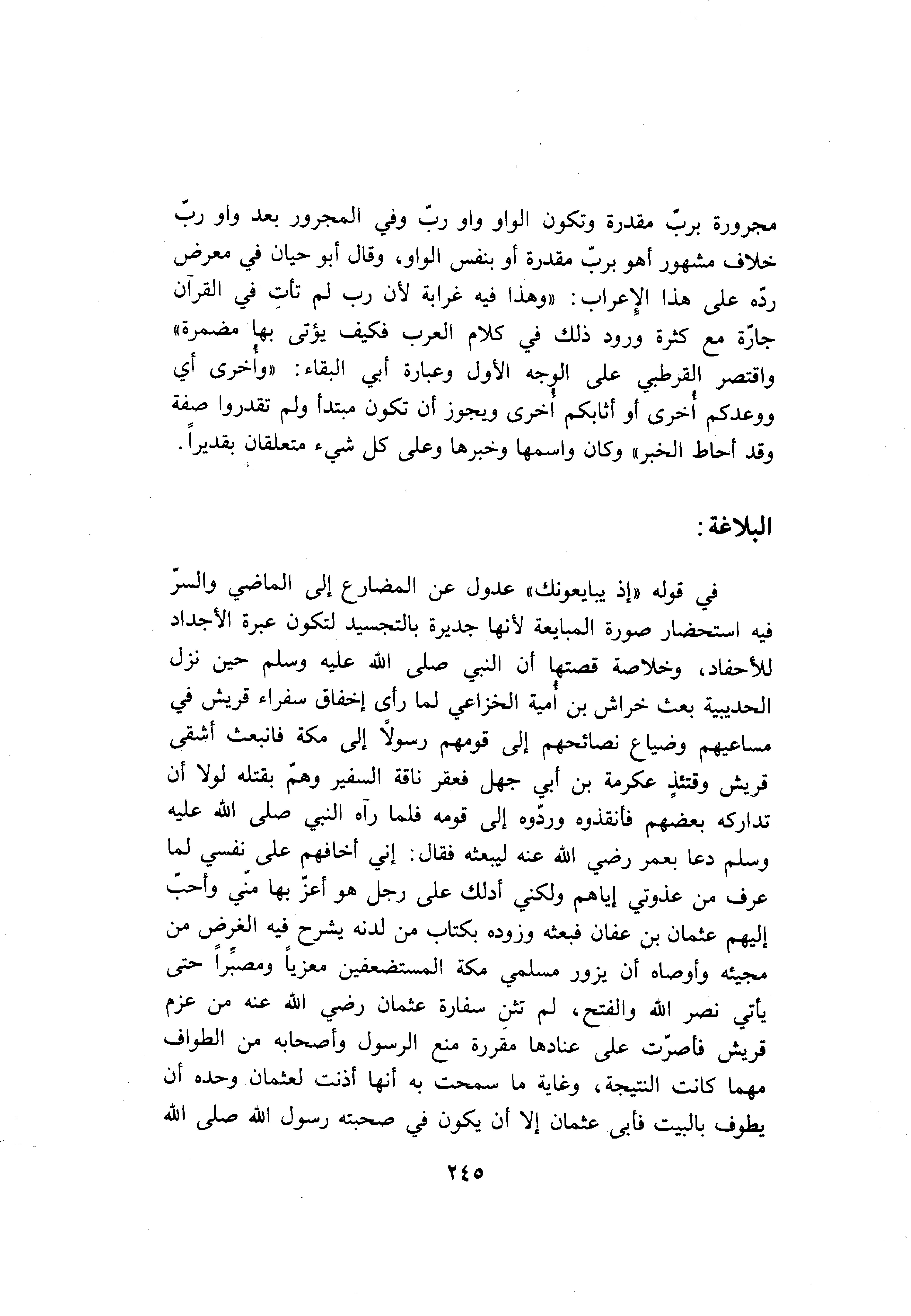 في قوله «إذ يبايعونك» عدول عن المضارع إلى الماضي والسرّ فيه استحضار صورة المبايعة لأنها جديرة بالتجسيد لتكون عبرة الأجداد للأحفاد، وخلاصة قصتها أن النبي صلى الله عليه وسلم حين نزل الحديبية بعث خراش بن أمية الخزاعي لما رأى إخفاق سفراء قريش في مساعيهم وضياع نصائحهم إلى قومهم رسولا إلى مكة فانبعث أشقى قريش وقتئذ عكرمة بن أبي جهل فعقر ناقة السفير وهمّ بقتله لولا أن تداركه بعضهم فأنقذوه وردّوه إلى قومه فلما رآه النبي صلى الله عليه وسلم دعا بعمر رضي الله عنه ليبعثه فقال: إني أخافهم على نفسي لما عرف من عذوتي إياهم ولكني أدلك على رجل هو أعزّ بها منّي وأحبّ إليهم عثمان بن عفان فبعثه وزوده بكتاب من لدنه يشرح فيه الغرض من مجيئه وأوصاه أن يزور مسلمي مكة المستضعفين معزيا ومصبّرا حتى يأتي نصر الله والفتح، لم تثن سفارة عثمان رضي الله عنه من عزم قريش فأصرّت على عنادها مقررة منع الرسول وأصحابه من الطواف مهما كانت النتيجة، وغاية ما سمحت به أنها أذنت لعثمان وحده أن يطوف بالبيت فأبى عثمان إلا أن يكون في صحبته رسول الله صلى الله