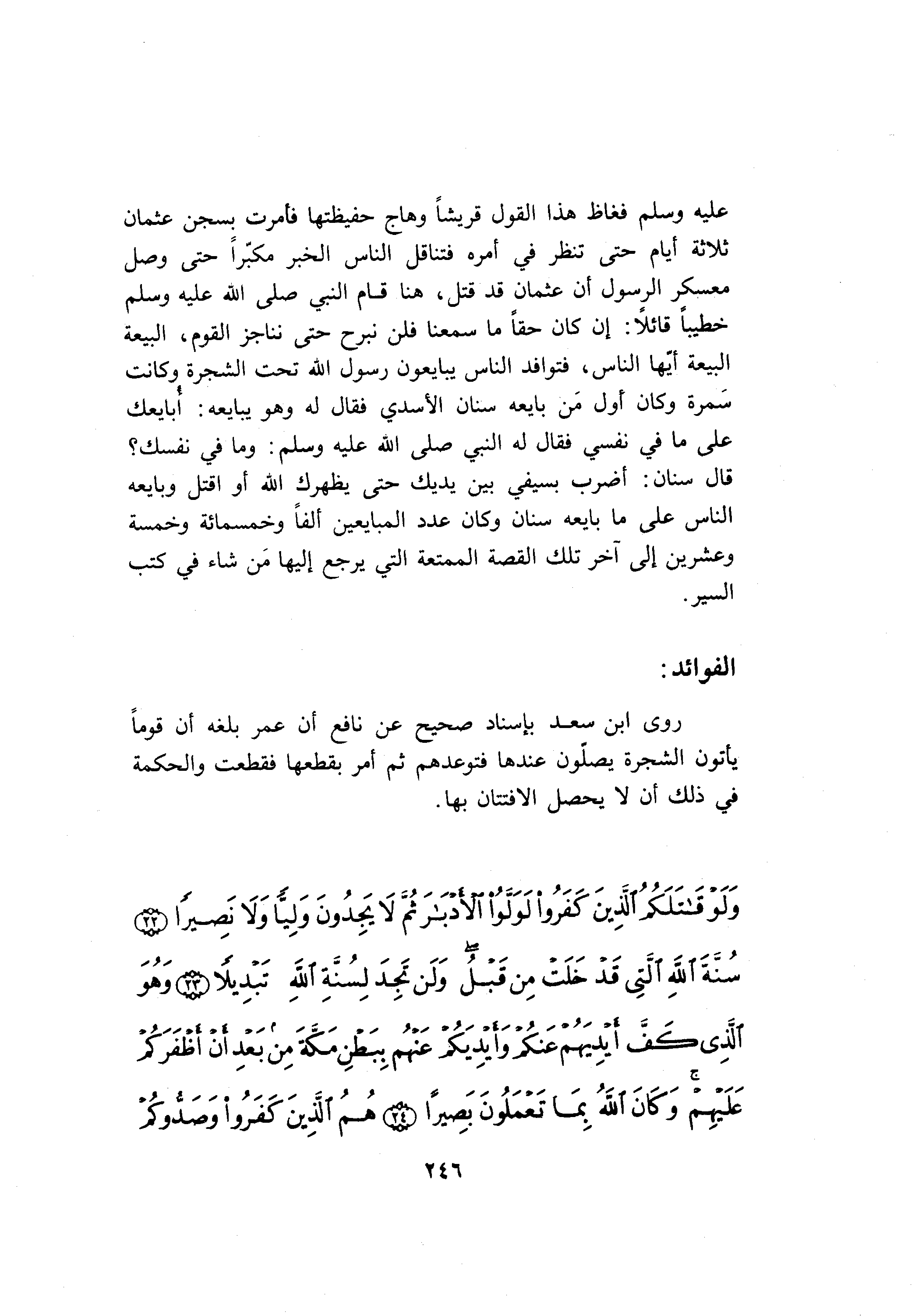 عليه وسلم فغاظ هذا القول قريشا وهاج حفيظتها فأمرت بسجن عثمان ثلاثة أيام حتى تنظر في أمره فتناقل الناس الخبر مكبّرا حتى وصل معسكر الرسول أن عثمان قد قتل، هنا قام النبي صلى الله عليه وسلم خطيبا قائلا: ان كان حقا ما سمعنا فلن نبرح حتى نناجز القوم، البيعة البيعة أيّها الناس، فتوافد الناس يبايعون رسول الله تحت الشجرة وكانت سمرة وكان أول من بايعه سنان الأسدي فقال له وهو يبايعه: أبايعك على ما في نفسي فقال له النبي صلى الله عليه وسلم: وما في نفسك؟