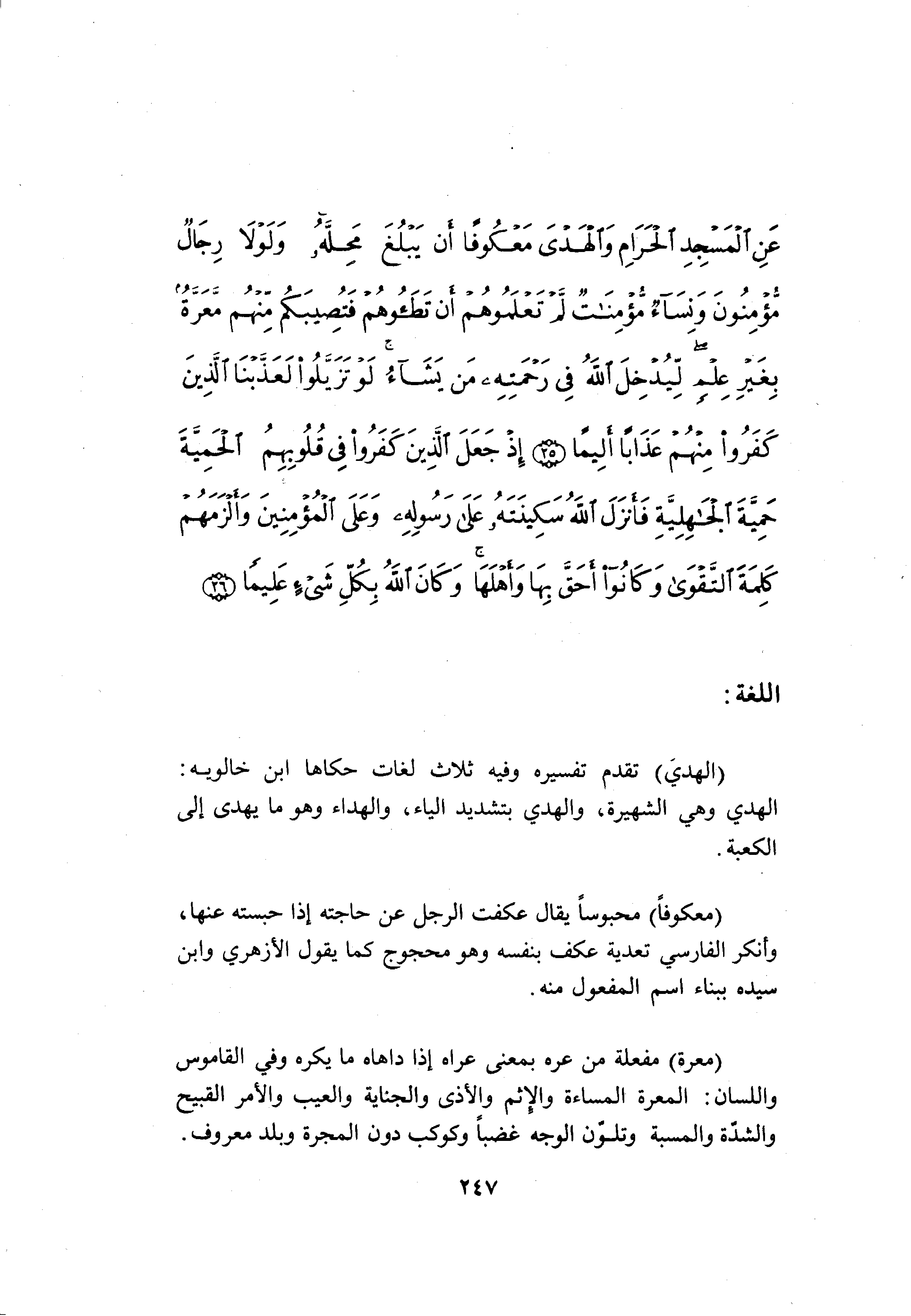 (مَعَرَّةٌ) مفعلة من عره بمعنى عراه إذا داهاه ما يكره وفي القاموس واللسان: المعرة المساءة والإثم والأذى والجناية والعيب والأمر القبيح والشدّة والمسبة وتلوّن الوجه غضبا وكوكب دون المجرة وبلد معروف.