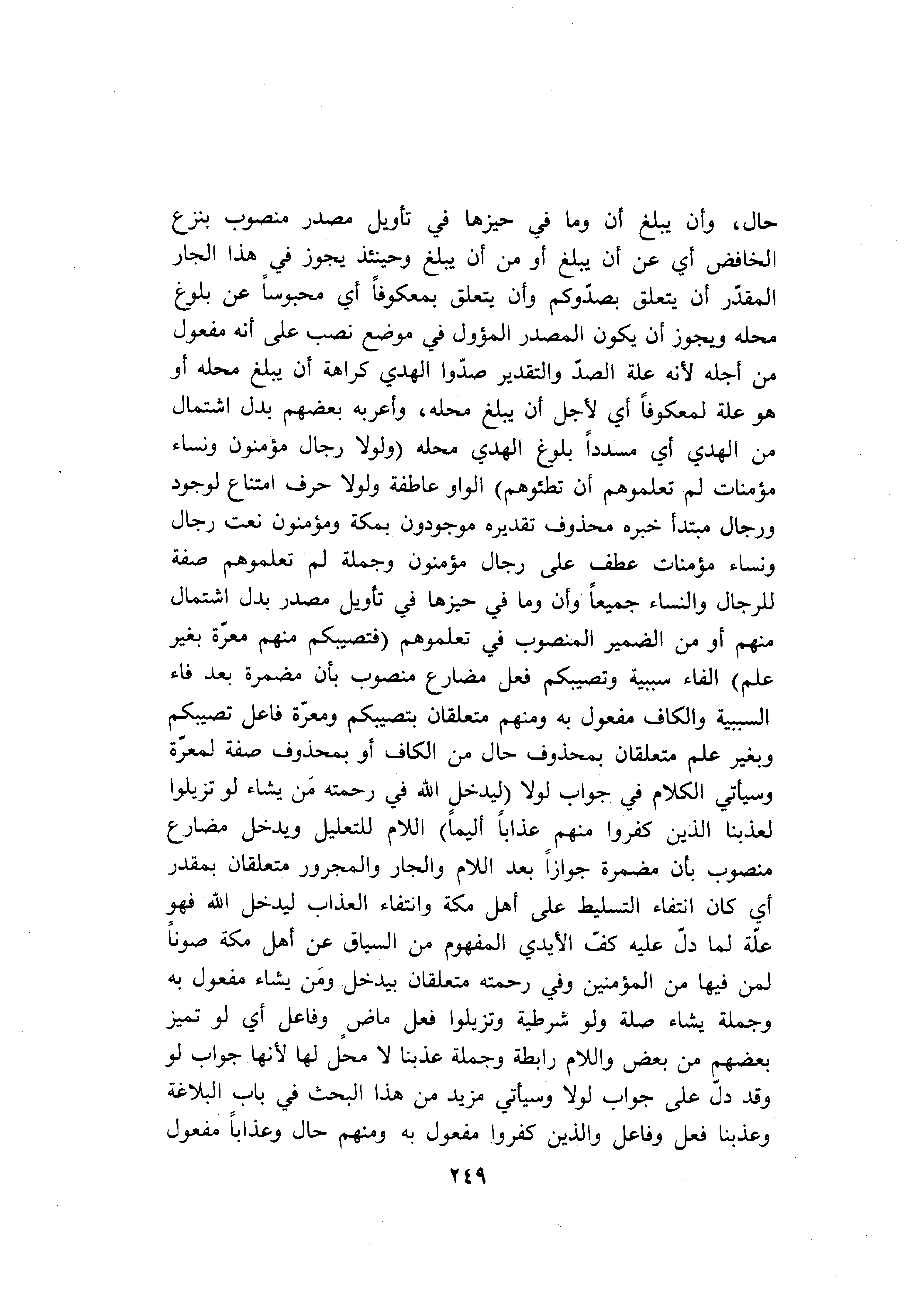 حال، وأن يبلغ أن وما في حيزها في تأويل مصدر منصوب بنزع الخافض أي عن أن يبلغ أو من أن يبلغ وحينئذ يجوز في هذا الجار المقدّر أن يتعلق بصدّوكم وأن يتعلق بمعكوفا أي محبوسا عن بلوغ محله ويجوز أن يكون المصدر المؤول في موضع نصب على أنه مفعول من أجله لأنه علة الصدّ والتقدير صدّوا الهدي كراهة أن يبلغ محله أو هو علة لمعكوفا أي لأجل أن يبلغ محله، وأعربه بعضهم بدل اشتمال من الهدي أي مسددا بلوغ الهدي محله (وَلَوْلا رِجالٌ مُؤْمِنُونَ وَنِساءٌ مُؤْمِناتٌ لَمْ تَعْلَمُوهُمْ أَنْ تَطَؤُهُمْ) الواو عاطفة ولولا حرف امتناع لوجود ورجال مبتدأ خبره محذوف تقديره موجودون بمكة ومؤمنون نعت رجال ونساء مؤمنات عطف على رجال مؤمنون وجملة لم تعلموهم صفة للرجال والنساء جميعا وأن وما في حيزها في تأويل مصدر بدل اشتمال منهم أو من الضمير المنصوب في تعلموهم (فَتُصِيبَكُمْ مِنْهُمْ مَعَرَّةٌ بِغَيْرِ عِلْمٍ) الفاء سببية وتصيبكم فعل مضارع منصوب بأن مضمرة بعد فاء السببية والكاف مفعول به ومنهم متعلقان بتصيبكم ومعرّة فاعل تصيبكم وبغير علم متعلقان بمحذوف حال من الكاف أو بمحذوف صفة لمعرّة وسيأتي الكلام في جواب لولا (لِيُدْخِلَ اللَّهُ فِي رَحْمَتِهِ مَنْ يَشاءُ لَوْ تَزَيَّلُوا لَعَذَّبْنَا الَّذِينَ كَفَرُوا مِنْهُمْ عَذاباً أَلِيماً) اللام للتعليل ويدخل مضارع منصوب بأن مضمرة جوازا بعد اللام والجار والمجرور متعلقان بمقدر أي كان انتفاء التسليط على أهل مكة وانتفاء العذاب ليدخل الله فهو علّة لما دلّ عليه كفّ الأيدي المفهوم من السياق عن أهل مكة صونا لمن فيها من المؤمنين وفي رحمته متعلقان بيدخل ومن يشاء مفعول به وجملة يشاء صلة ولو شرطية وتزيلوا فعل ماض وفاعل أي لو تميز بعضهم من بعض واللام رابطة وجملة عذبنا لا محل لها لأنها جواب لو وقد دلّ على جواب لولا وسيأتي مزيد من هذا البحث في باب البلاغة وعذبنا فعل وفاعل والذين كفروا مفعول به ومنهم حال وعذابا مفعول
