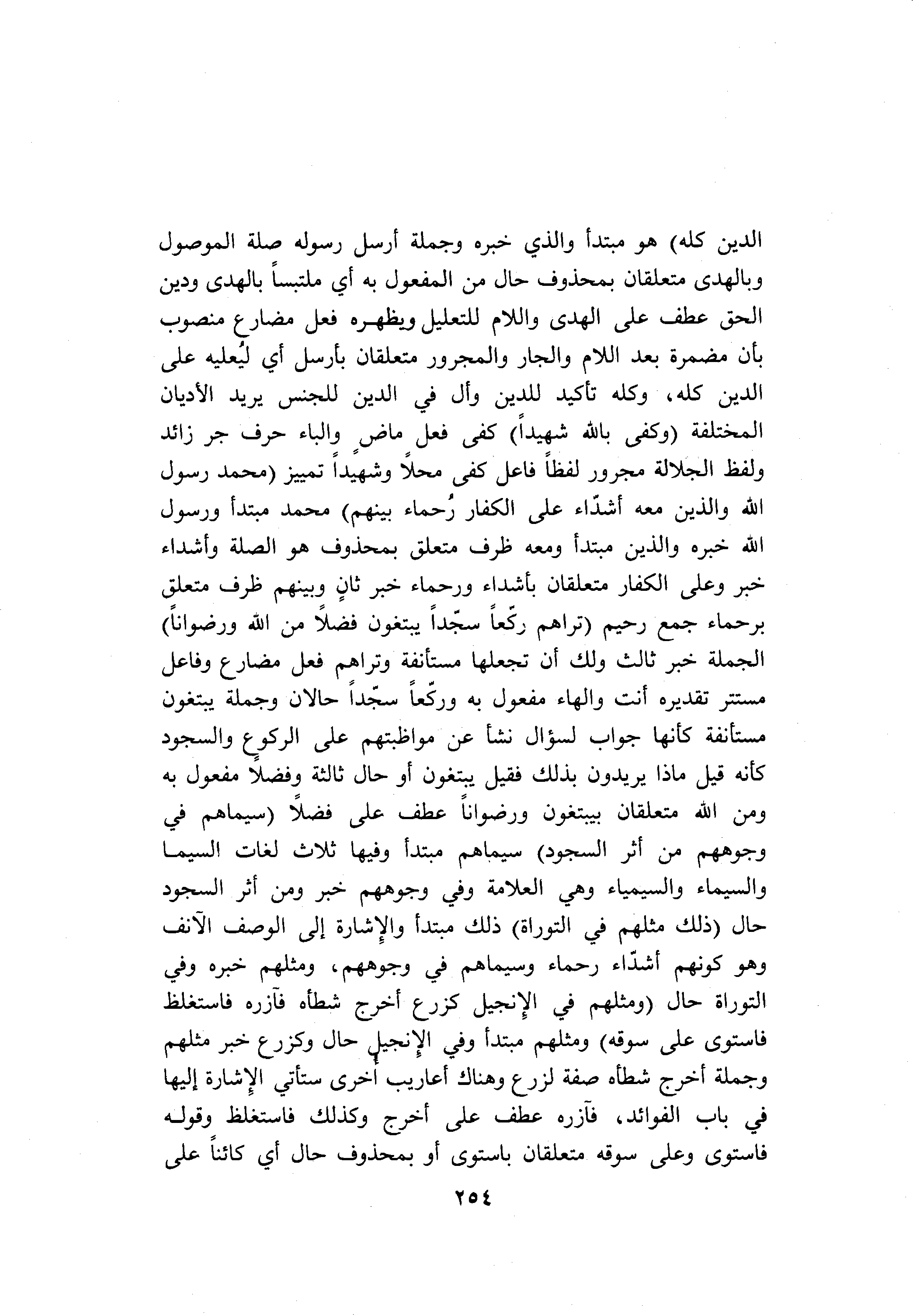 هو مبتدأ والذي خبره وجملة أرسل رسوله صلة الموصول وبالهدى متعلقان بمحذوف حال من المفعول به أي ملتبسا بالهدى ودين الحق عطف على الهدى واللام للتعليل ويظهره فعل مضارع منصوب بأن مضمرة بعد اللام والجار والمجرور متعلقان بأرسل أي ليعليه على الدين كله، وكله تأكيد للدين وأل في الدين للجنس يريد الأديان المختلفة (وَكَفى بِاللَّهِ شَهِيداً) كفى فعل ماض والباء حرف جر زائد ولفظ الجلالة مجرور لفظا فاعل كفى محلا وشهيدا تمييز (مُحَمَّدٌ رَسُولُ اللَّهِ وَالَّذِينَ مَعَهُ أَشِدَّاءُ عَلَى الْكُفَّارِ رُحَماءُ بَيْنَهُمْ) محمد مبتدأ ورسول الله خبره والذين مبتدأ ومعه ظرف متعلق بمحذوف هو الصلة وأشداء خبر وعلى الكفار متعلقان بأشداء ورحماء خبر ثان وبينهم ظرف متعلق برحماء جمع رحيم (تَراهُمْ رُكَّعاً سُجَّداً يَبْتَغُونَ فَضْلًا مِنَ اللَّهِ وَرِضْواناً) الجملة خبر ثالث ولك أن تجعلها مستأنفة وتراهم فعل مضارع وفاعل مستتر تقديره أنت والهاء مفعول به وركّعا سجّدا حالان وجملة يبتغون مستأنفة كأنها جواب لسؤال نشأ عن مواظبتهم على الركوع والسجود كأنه قيل ماذا يريدون بذلك فقيل يبتغون أو حال ثالثة وفضلا مفعول به ومن الله متعلقان بيبتغون ورضوانا عطف على فضلا (سِيماهُمْ فِي وُجُوهِهِمْ مِنْ أَثَرِ السُّجُودِ) سيماهم مبتدأ وفيها ثلاث لغات السيما والسيماء والسيمياء وهي العلامة وفي وجوههم خبر ومن أثر السجود حال (ذلِكَ مَثَلُهُمْ فِي التَّوْراةِ) ذلك مبتدأ والإشارة إلى الوصف الآنف وهو كونهم أشدّاء رحماء وسيماهم في وجوههم، ومثلهم خبره وفي التوراة حال (وَمَثَلُهُمْ فِي الْإِنْجِيلِ كَزَرْعٍ أَخْرَجَ شَطْأَهُ فَآزَرَهُ فَاسْتَغْلَظَ فَاسْتَوى عَلى سُوقِهِ) ومثلهم مبتدأ وفي الإنجيل حال وكزرع خبر مثلهم وجملة أخرج شطأه صفة لزرع وهناك أعاريب أخرى ستأتي الإشارة إليها في باب الفوائد، فآزره عطف على أخرج وكذلك فاستغلط وقوله فاستوى وعلى سوقه متعلقان باستوى أو بمحذوف حال أي كائنا على