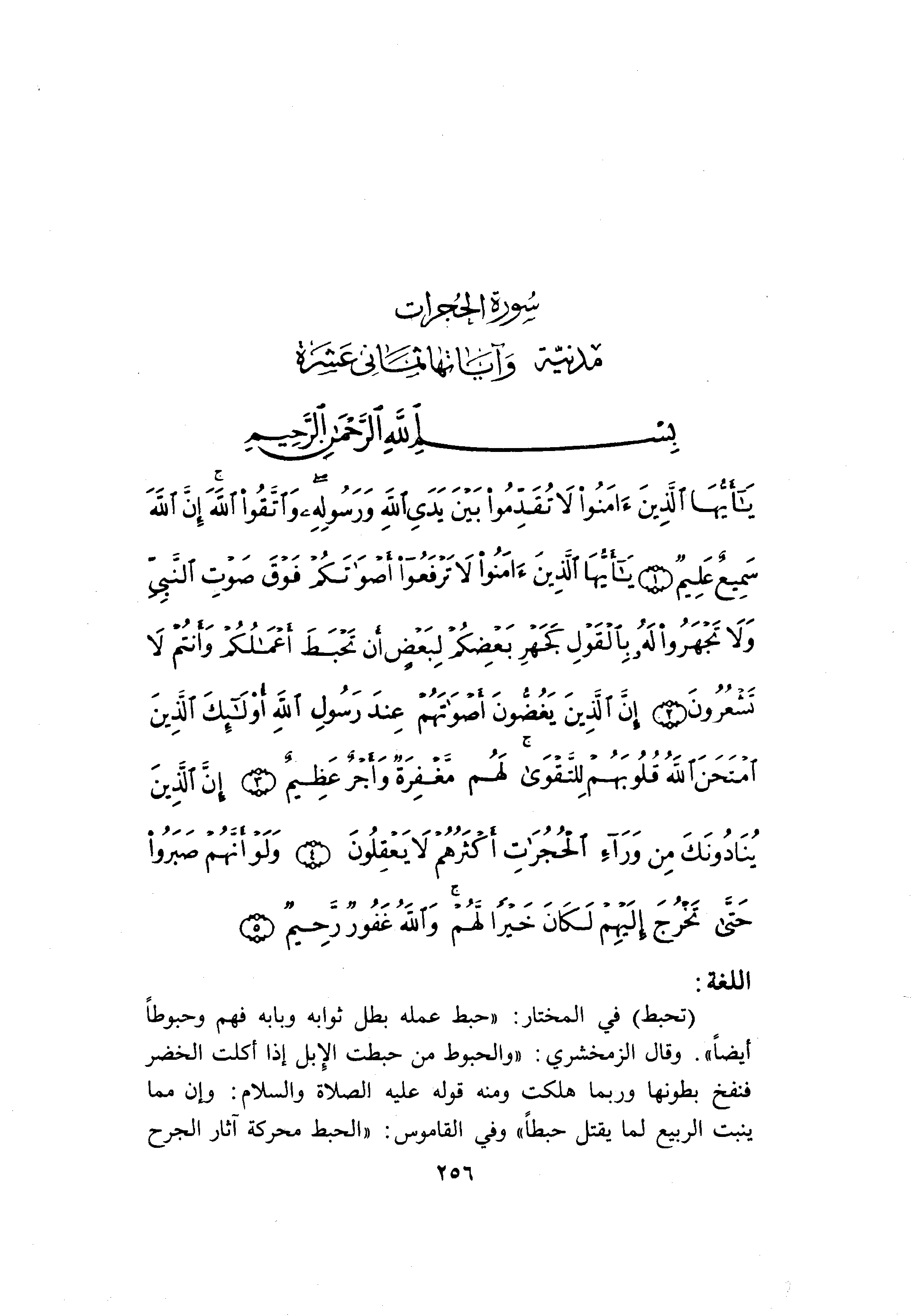 يا أَيُّهَا الَّذِينَ آمَنُوا لا تُقَدِّمُوا بَيْنَ يَدَيِ اللَّهِ وَرَسُولِهِ وَاتَّقُوا اللَّهَ إِنَّ اللَّهَ سَمِيعٌ عَلِيمٌ (1) يا أَيُّهَا الَّذِينَ آمَنُوا لا تَرْفَعُوا أَصْواتَكُمْ فَوْقَ صَوْتِ النَّبِيِّ وَلا تَجْهَرُوا لَهُ بِالْقَوْلِ كَجَهْرِ بَعْضِكُمْ لِبَعْضٍ أَنْ تَحْبَطَ أَعْمالُكُمْ وَأَنْتُمْ لا تَشْعُرُونَ (2) إِنَّ الَّذِينَ يَغُضُّونَ أَصْواتَهُمْ عِنْدَ رَسُولِ اللَّهِ أُولئِكَ الَّذِينَ امْتَحَنَ اللَّهُ قُلُوبَهُمْ لِلتَّقْوى لَهُمْ مَغْفِرَةٌ وَأَجْرٌ عَظِيمٌ (3) إِنَّ الَّذِينَ يُنادُونَكَ مِنْ وَراءِ الْحُجُراتِ أَكْثَرُهُمْ لا يَعْقِلُونَ (4)