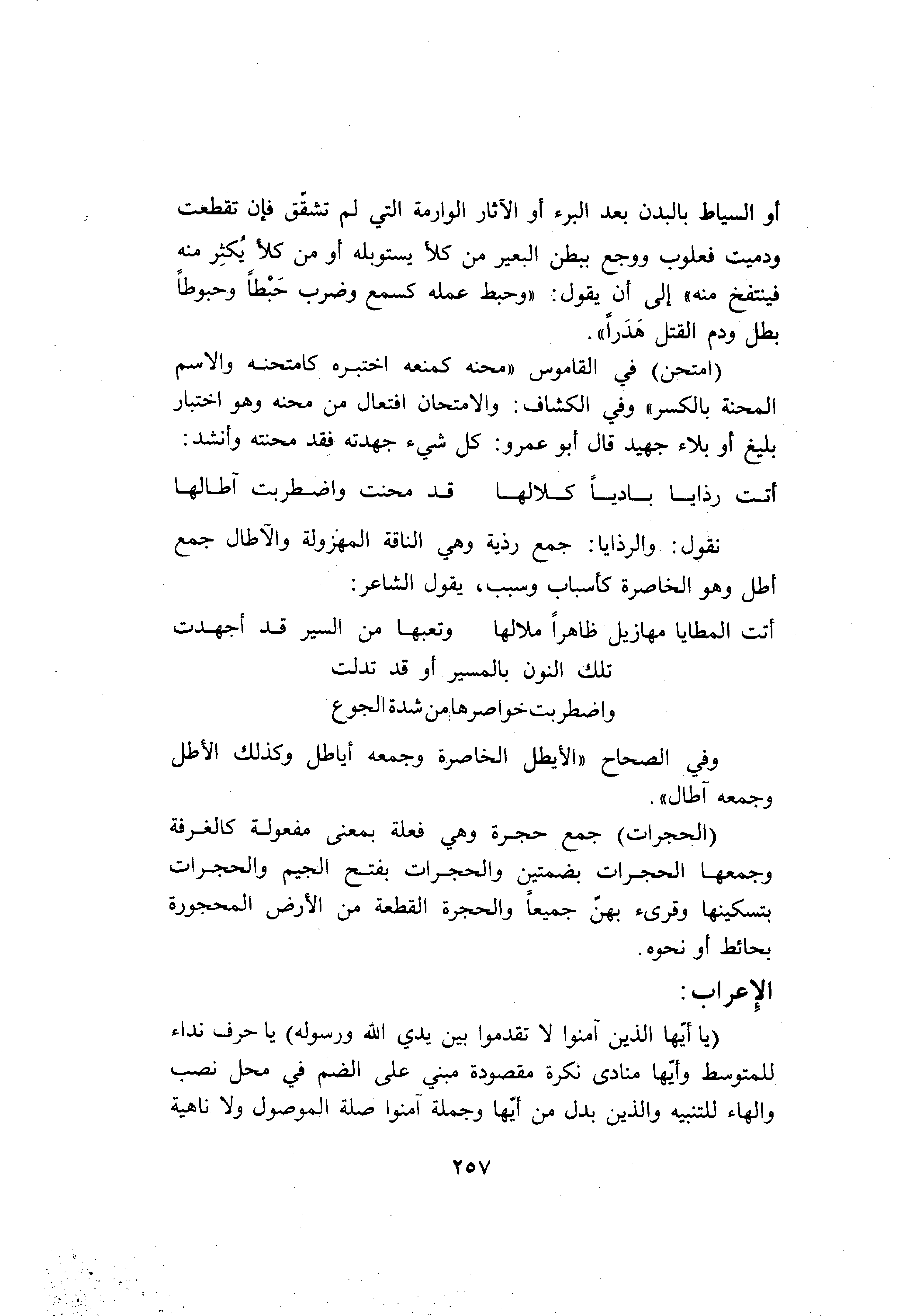 (يا أَيُّهَا الَّذِينَ آمَنُوا لا تُقَدِّمُوا بَيْنَ يَدَيِ اللَّهِ وَرَسُولِهِ) يا حرف نداء للمتوسط وأيّها منادى نكرة مقصودة مبني على الضم في محل نصب والهاء للتنبيه والذين بدل من أيّها وجملة آمنوا صلة الموصول ولا ناهية