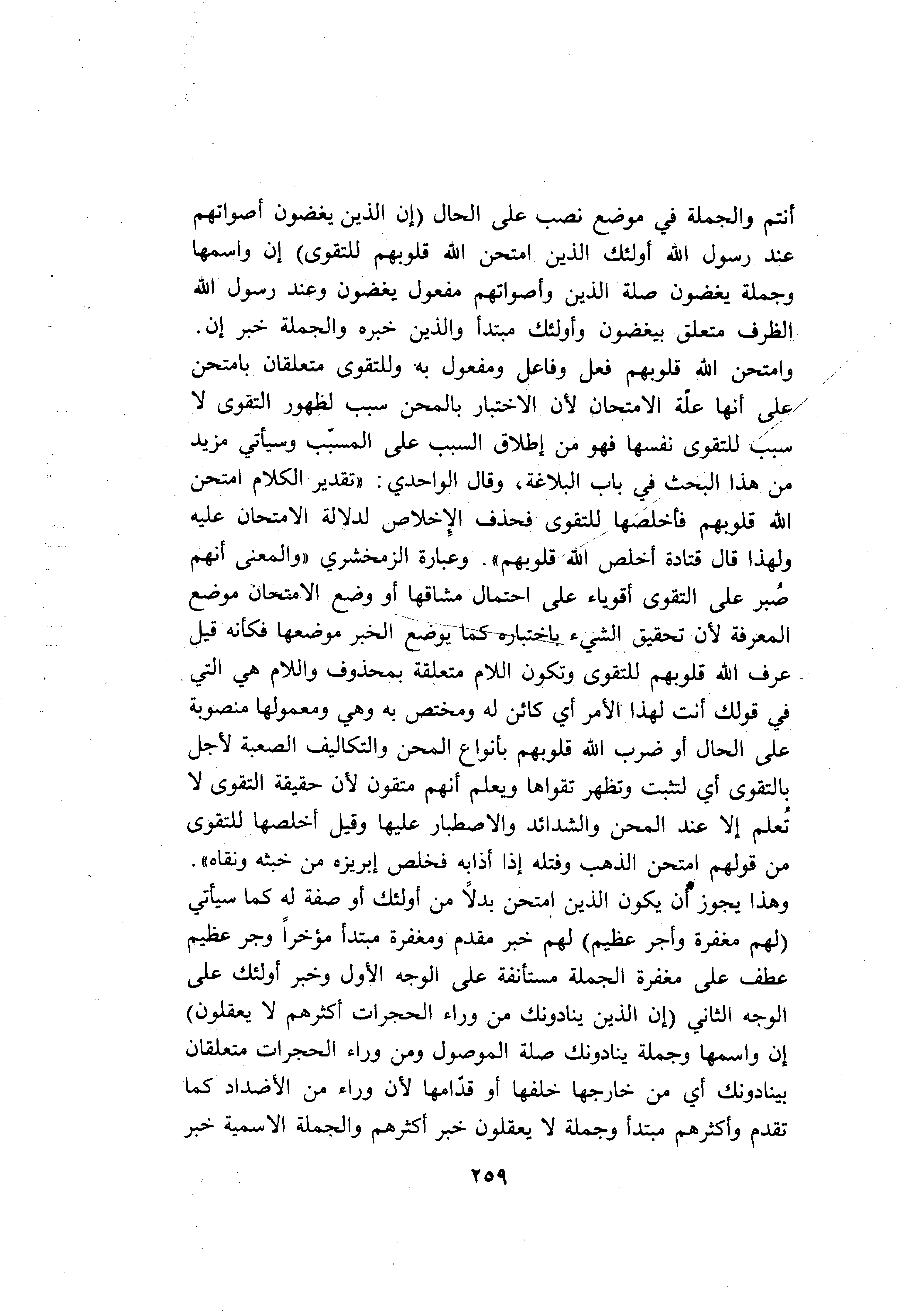 أنتم والجملة في موضع نصب على الحال (إِنَّ الَّذِينَ يَغُضُّونَ أَصْواتَهُمْ عِنْدَ رَسُولِ اللَّهِ أُولئِكَ الَّذِينَ امْتَحَنَ اللَّهُ قُلُوبَهُمْ لِلتَّقْوى) إن واسمها وجملة يغضون صلة الذين وأصواتهم مفعول يغضون وعند رسول الله الظرف متعلق بيغضون وأولئك مبتدأ والذين خبره والجملة خبر إن.