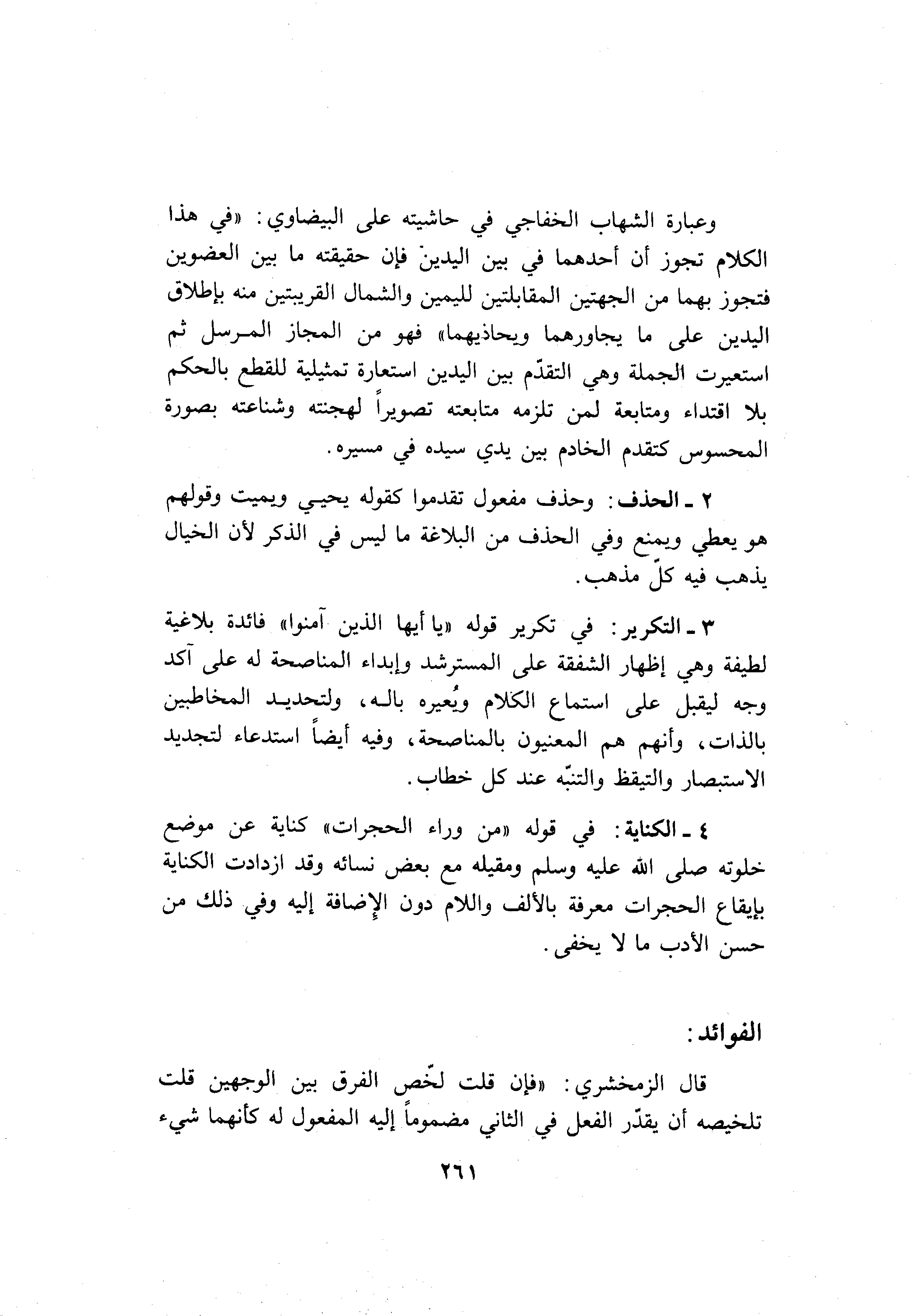 4- الكناية: في قوله «من وراء الحجرات» كناية عن موضع خلوته صلى الله عليه وسلم ومقيله مع بعض نسائه وقد ازدادت الكناية بإيقاع الحجرات معرفة بالألف واللام دون الإضافة إليه وفي ذلك من حسن الأدب ما لا يخفى.