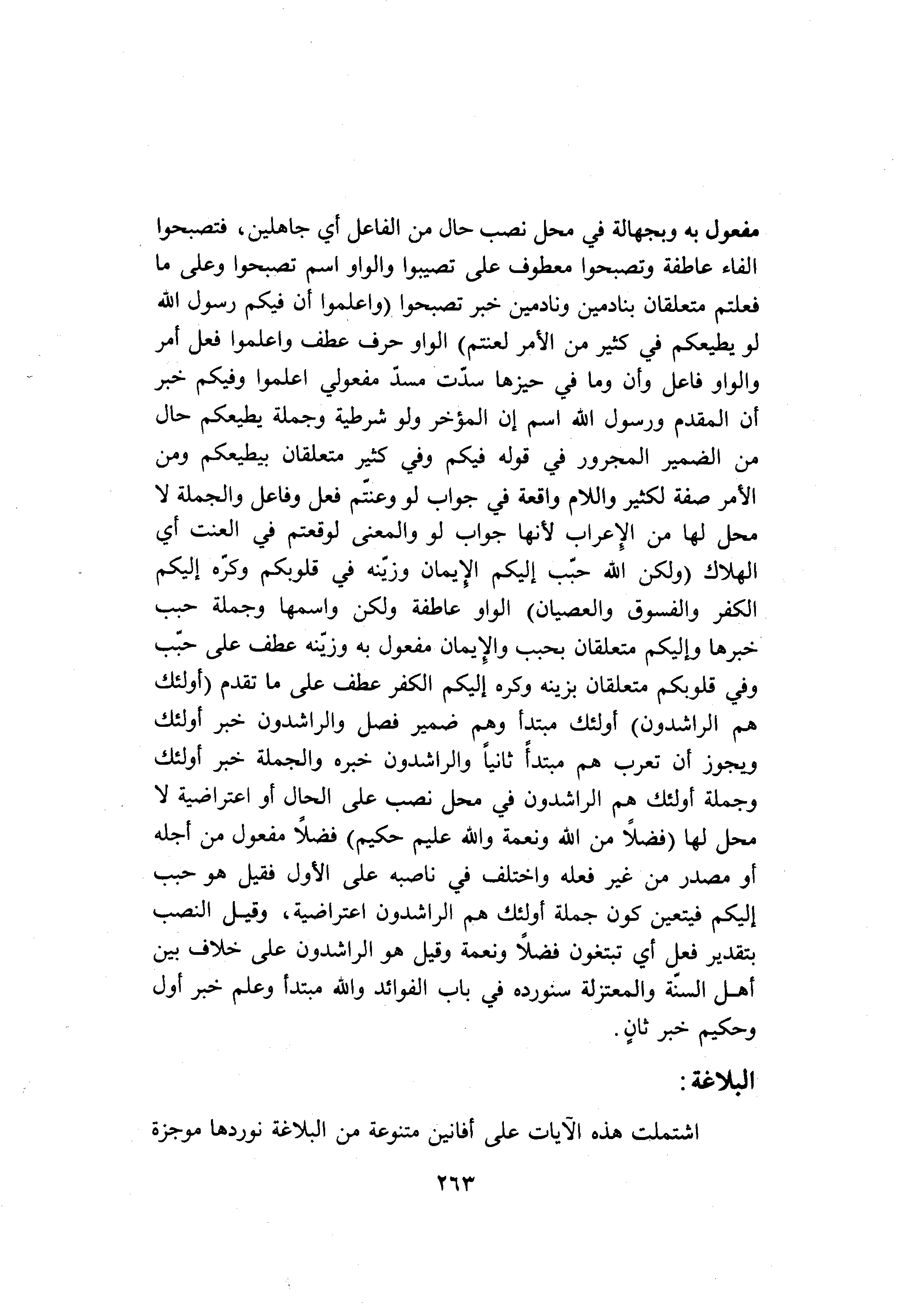مفعول به وبجهالة في محل نصب حال من الفاعل أي جاهلين، فتصبحوا الفاء عاطفة وتصبحوا معطوف على تصيبوا والواو اسم تصبحوا وعلى ما فعلتم متعلقان بنادمين ونادمين خبر تصبحوا (وَاعْلَمُوا أَنَّ فِيكُمْ رَسُولَ اللَّهِ لَوْ يُطِيعُكُمْ فِي كَثِيرٍ مِنَ الْأَمْرِ لَعَنِتُّمْ) الواو حرف عطف واعلموا فعل أمر والواو فاعل وأن وما في حيزها سدّت مسدّ مفعولي اعلموا وفيكم خبر أن المقدم ورسول الله اسم إن المؤخر ولو شرطية وجملة يطيعكم حال من الضمير المجرور في قوله فيكم وفي كثير متعلقان بيطيعكم ومن الأمر صفة لكثير واللام واقعة في جواب لو وعنتّم فعل وفاعل والجملة لا محل لها من الإعراب لأنها جواب لو والمعنى لوقعتم في العنت أي الهلاك (وَلكِنَّ اللَّهَ حَبَّبَ إِلَيْكُمُ الْإِيمانَ وَزَيَّنَهُ فِي قُلُوبِكُمْ وَكَرَّهَ إِلَيْكُمُ الْكُفْرَ وَالْفُسُوقَ وَالْعِصْيانَ) الواو عاطفة ولكن واسمها وجملة حبب خبرها وإليكم متعلقان بحبب والإيمان مفعول به وزيّنه عطف على حبّب وفي قلوبكم متعلقان بزينه وكره إليكم الكفر عطف على ما تقدم (أُولئِكَ هُمُ الرَّاشِدُونَ) أولئك مبتدأ وهم ضمير فصل والراشدون خبر أولئك ويجوز أن تعرب هم مبتدأ ثانيا والراشدون خبره والجملة خبر أولئك وجملة أولئك هم الراشدون في محل نصب على الحال أو اعتراضية لا محل لها (فَضْلًا مِنَ اللَّهِ وَنِعْمَةً وَاللَّهُ عَلِيمٌ حَكِيمٌ) فضلا مفعول من أجله أو مصدر من غير فعله واختلف في ناصبه على الأول فقيل هو حبب إليكم فيتعين كون جملة أولئك هم الراشدون اعتراضية، وقيل النصب بتقدير فعل أي تبتغون فضلا ونعمة وقيل هو الراشدون على خلاف بين أهل السنة والمعتزلة سنورده في باب الفوائد والله مبتدأ وعلم خبر أول وحكيم خبر ثان.