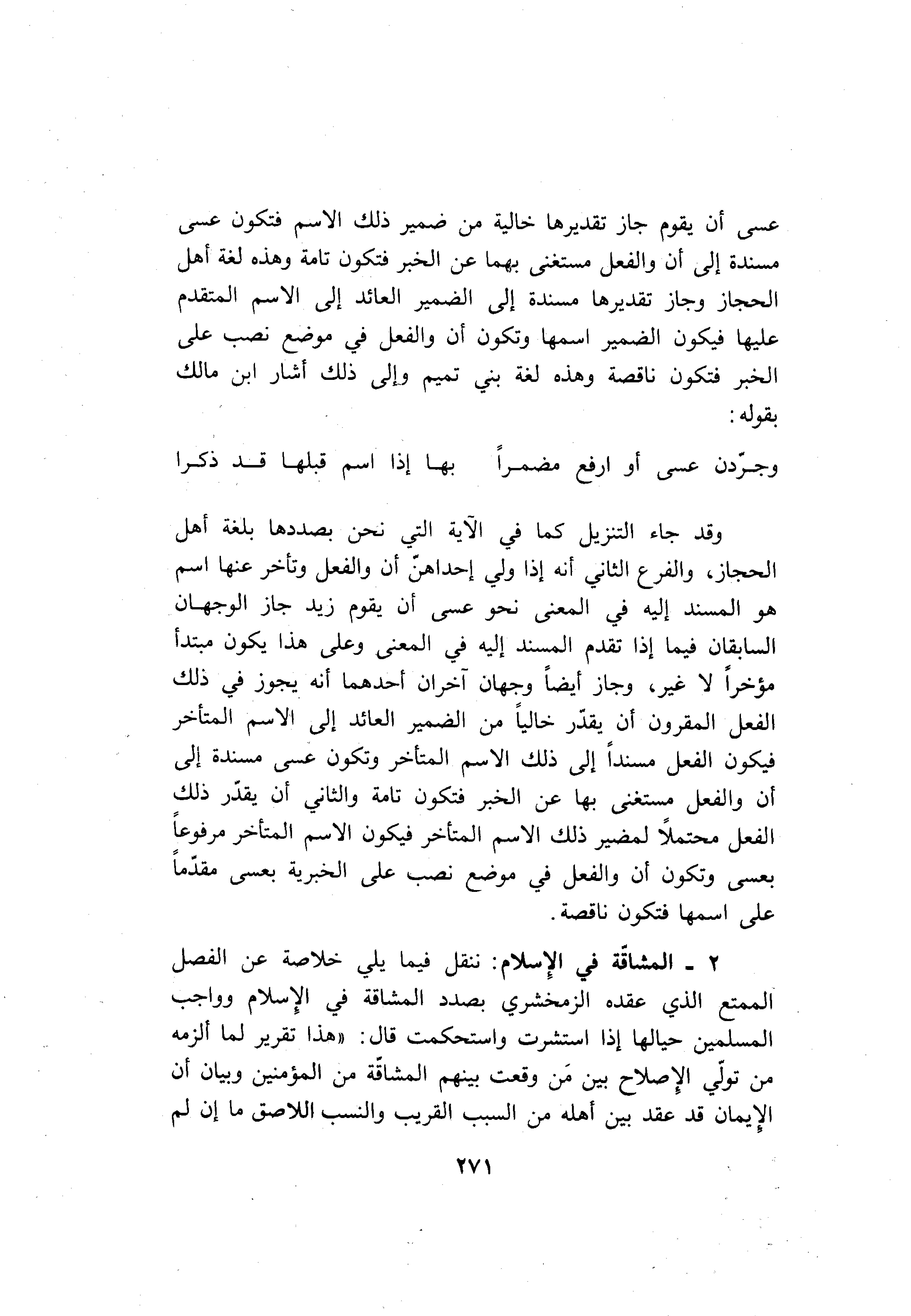 2- المشاقّة في الإسلام: ننقل فيما يلى خلاصة عن الفصل الممتع الذي عقده الزمخشري بصدد المشاقة في الإسلام وواجب المسلمين حيالها إذا استشرت واستحكمت قال: «هذا تقرير لما ألزمه من تولّى الإصلاح بين من وقعت بينهم المشاقّة من المؤمنين وبيان أن الإيمان قد عقد بين أهله من السبب القريب والنسب اللاصق ما إن لم