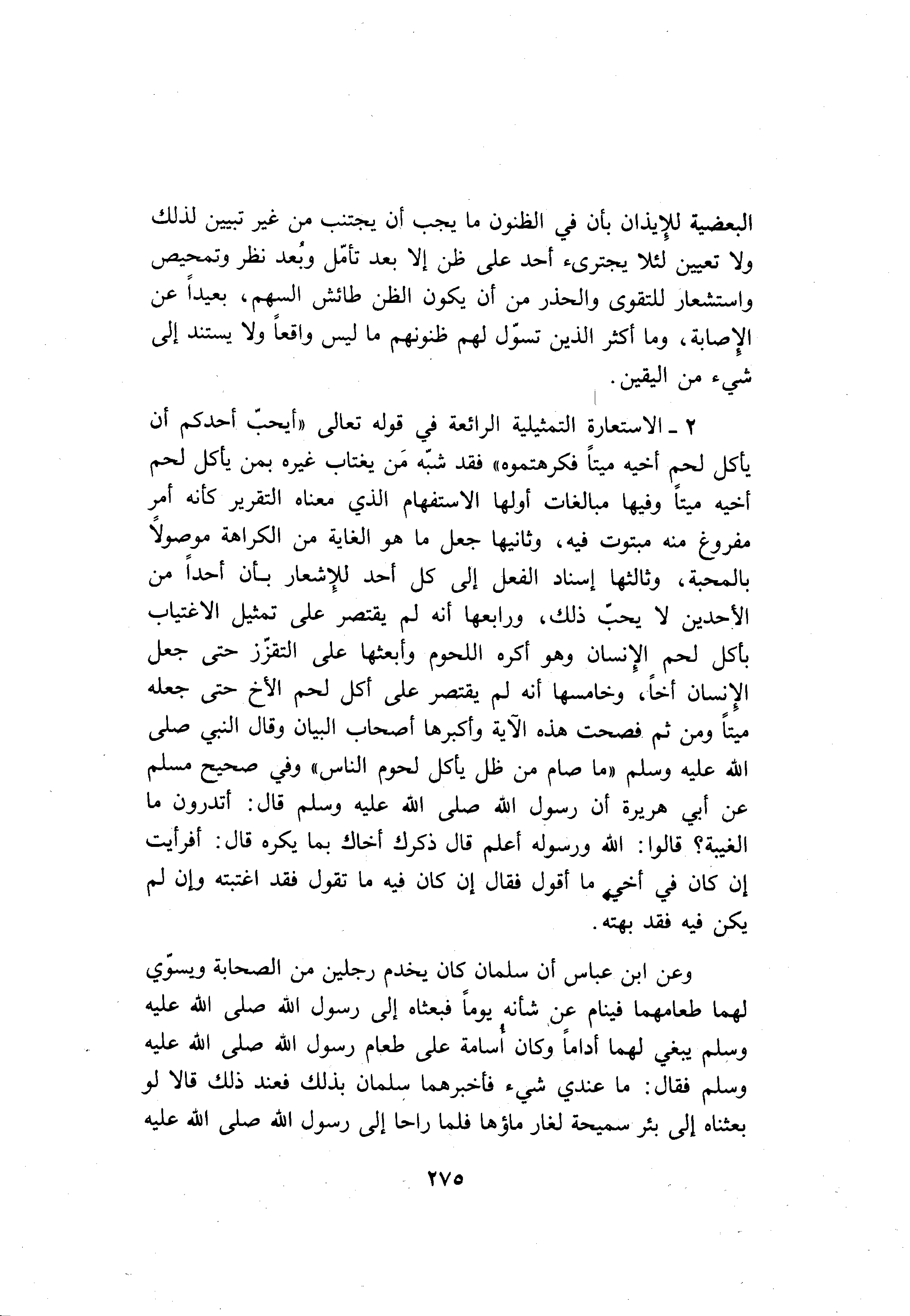 2- الاستعارة التمثيلية الرائعة في قوله تعالى «أيحبّ أحدكم أن يأكل لحم أخيه ميتا فكرهتموه» فقد شبّه من يغتاب غيره بمن يأكل لحم أخيه ميتا وفيها مبالغات أولها الاستفهام الذي معناه التقرير كأنه أمر مفروغ منه مبتوت فيه، وثانيها جعل ما هو الغاية من الكراهة موصولا بالمحبة، وثالثها إسناد الفعل إلى كل أحد للإشعار بأن أحدا من الأحدين لا يحبّ ذلك، ورابعها أنه لم يقتصر على تمثيل الاغتياب بأكل لحم الإنسان وهو أكره اللحوم وأبعثها على التقزّز حتى جعل الإنسان أخا، وخامسها أنه لم يقتصر على أكل لحم الأخ حتى جعله ميتا ومن ثم فصحت هذه الآية وأكبرها أصحاب البيان وقال النبي صلى الله عليه وسلم «ما صام من ظل يأكل لحوم الناس» وفي صحيح مسلم عن أبي هريرة أن رسول الله صلى الله عليه وسلم قال: أتدرون ما الغيبة؟ قالوا: الله ورسوله أعلم قال ذكرك أخاك بما يكره قال: أفرأيت إن كان في أخي ما أقول فقال إن كان فيه ما تقول فقد اغتبته وإن لم يكن فيه فقد بهته.