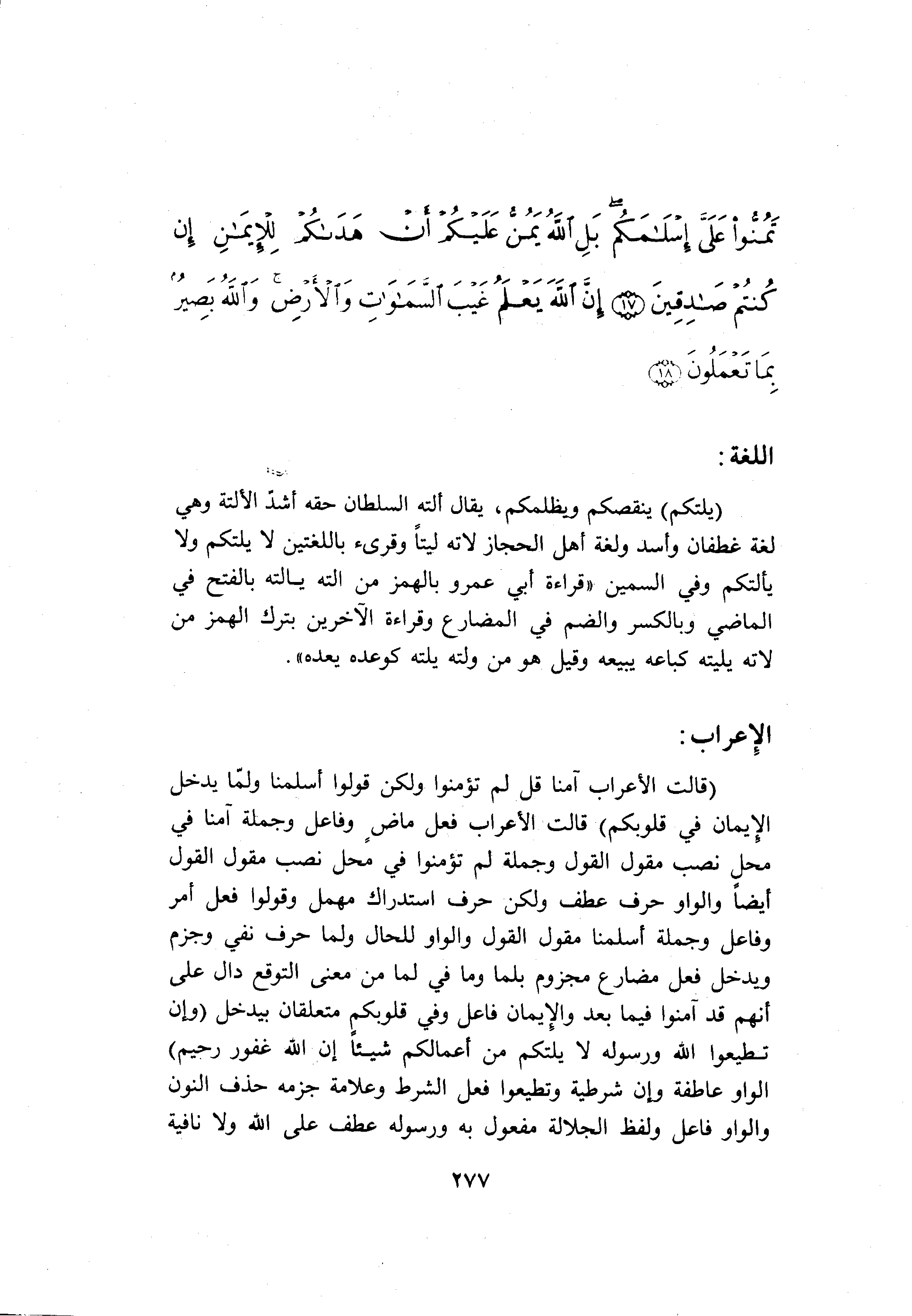 (قالَتِ الْأَعْرابُ آمَنَّا قُلْ لَمْ تُؤْمِنُوا وَلكِنْ قُولُوا أَسْلَمْنا وَلَمَّا يَدْخُلِ الْإِيمانُ فِي قُلُوبِكُمْ) قالت الأعراب فعل ماض وفاعل وجملة آمنا في محل نصب مقول القول وجملة لم تؤمنوا في محل نصب مقول القول أيضا والواو حرف عطف ولكن حرف استدراك مهمل وقولوا فعل أمر وفاعل وجملة أسلمنا مقول القول والواو للحال ولما حرف نفي وجزم ويدخل فعل مضارع مجزوم بلما وما في لما من معنى التوقع دال على أنهم قد آمنوا فيما بعد والإيمان فاعل وفي قلوبكم متعلقان بيدخل (وَإِنْ تُطِيعُوا اللَّهَ وَرَسُولَهُ لا يَلِتْكُمْ مِنْ أَعْمالِكُمْ شَيْئاً إِنَّ اللَّهَ غَفُورٌ رَحِيمٌ) الواو عاطفة وإن شرطية وتطيعوا فعل الشرط وعلامة جزمه حذف النون والواو فاعل ولفظ الجلالة مفعول به ورسوله عطف على الله ولا نافية