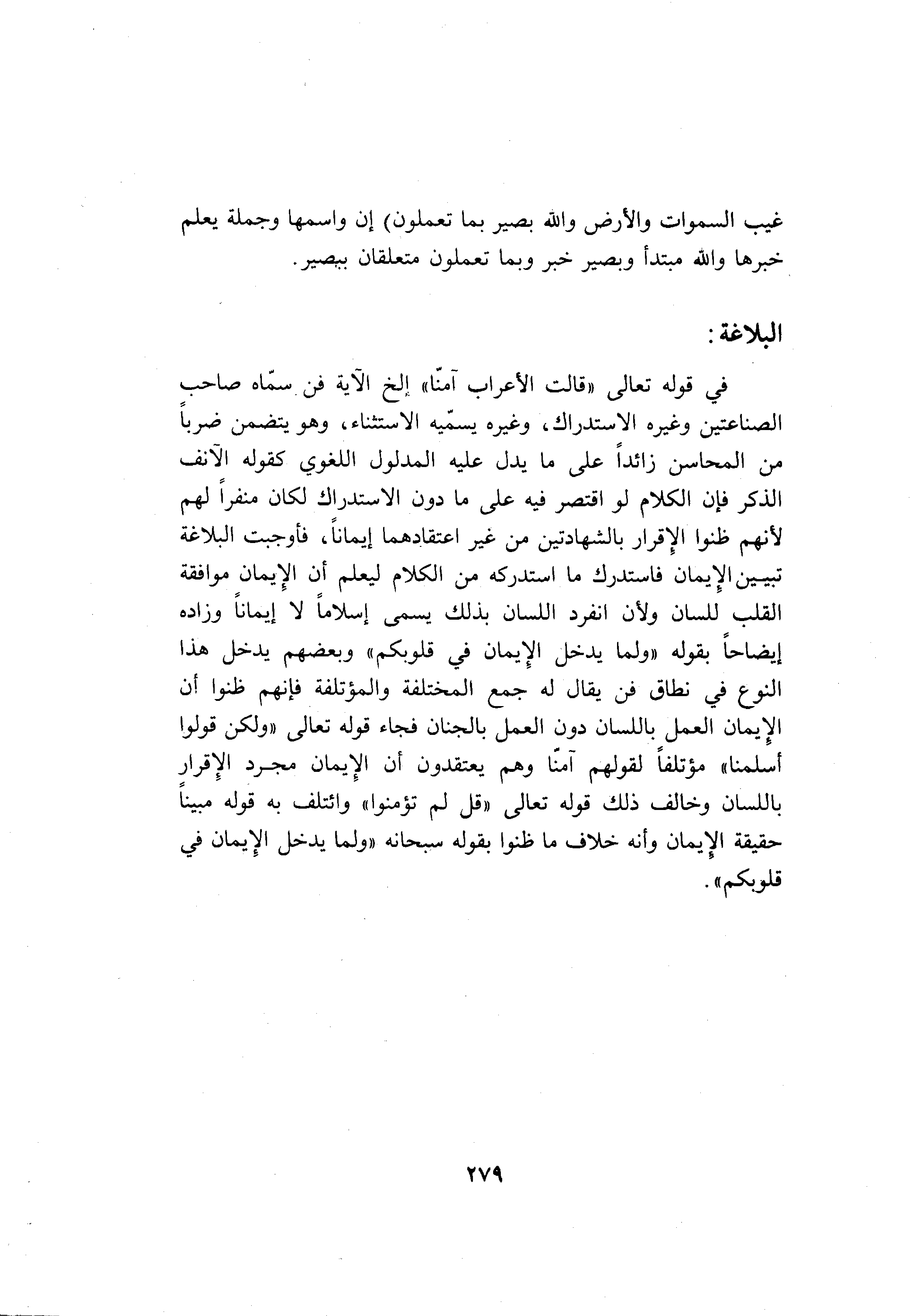 في قوله تعالى «قالت الأعراب آمنّا» إلخ الآية فن سمّاه صاحب الصناعتين وغيره الاستدراك، وغيره يسمّيه الاستثناء، وهو يتضمن ضربا من المحاسن زائدا على ما يدل عليه المدلول اللغوي كقوله الآنف الذكر فإن الكلام لو اقتصر فيه على ما دون الاستدراك لكان منفرا لهم لأنهم ظنوا الإقرار بالشهادتين من غير اعتقادهما إيمانا، فأوجبت البلاغة تبيين الإيمان فاستدرك ما استدركه من الكلام ليعلم أن الإيمان موافقة القلب للسان ولأن انفرد اللسان بذلك يسمى إسلاما لا إيمانا وزاده إيضاحا بقوله «ولما يدخل الإيمان في قلوبكم» وبعضهم يدخل هذا النوع في نطاق فن يقال له جمع المختلفة والمؤتلفة فإنهم ظنوا أن الإيمان العمل باللسان دون العمل بالجنان فجاء قوله تعالى «ولكن قولوا أسلمنا» مؤتلفا لقولهم آمنّا وهم يعتقدون أن الإيمان مجرد الإقرار باللسان وخالف ذلك قوله تعالى «قل لم تؤمنوا» وائتلف به قوله مبينا حقيقة الإيمان وأنه خلاف ما ظنوا بقوله سبحانه «ولما يدخل الإيمان في قلوبكم» .