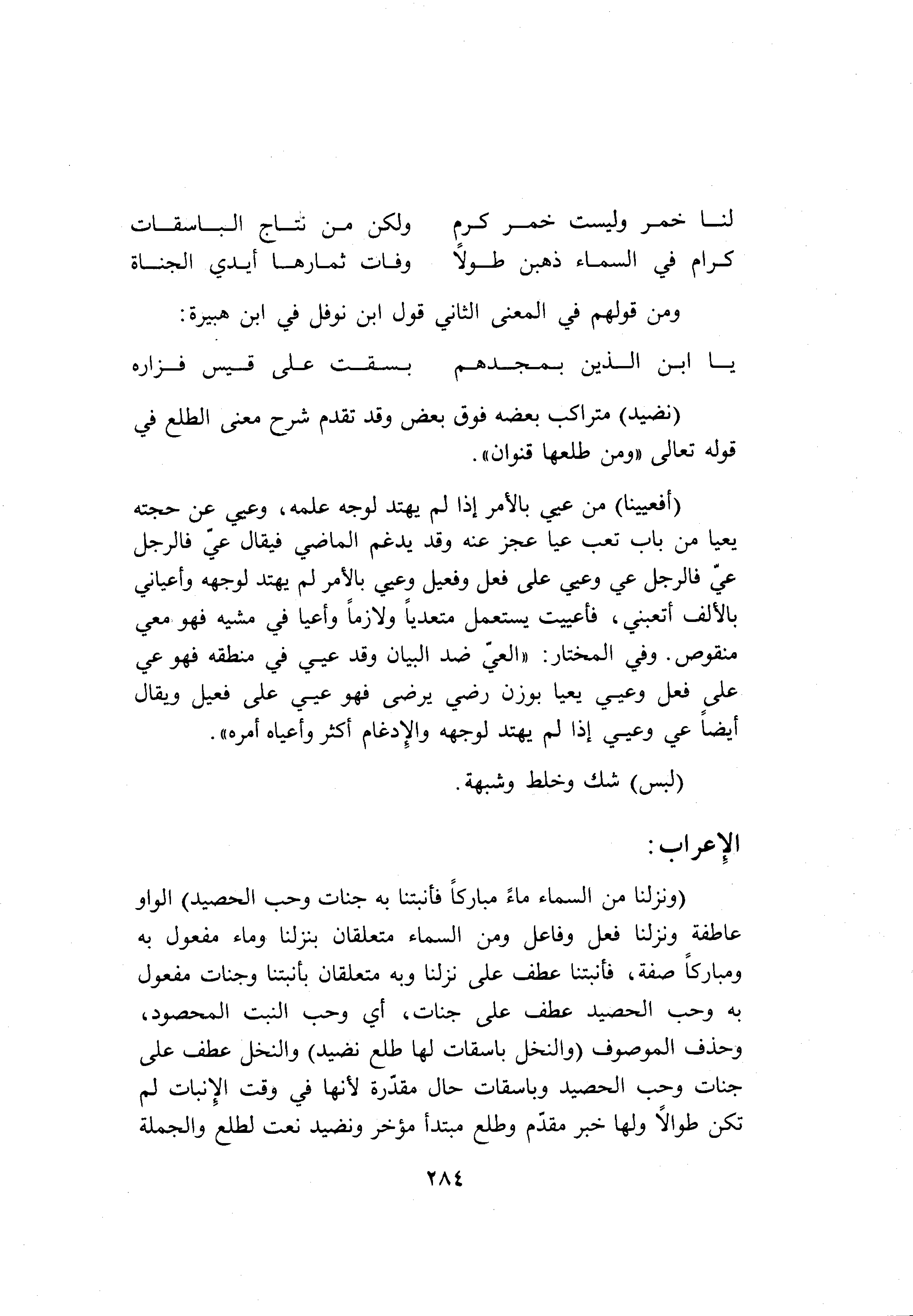 (وَنَزَّلْنا مِنَ السَّماءِ ماءً مُبارَكاً فَأَنْبَتْنا بِهِ جَنَّاتٍ وَحَبَّ الْحَصِيدِ) الواو عاطفة ونزلنا فعل وفاعل ومن السماء متعلقان بنزلنا وماء مفعول به ومباركا صفة، فأنبتنا عطف على نزلنا وبه متعلقان بأنبتنا وجنات مفعول به وحب الحصيد عطف على جنات، أي وحب النبت المحصود، وحذف الموصوف (وَالنَّخْلَ باسِقاتٍ لَها طَلْعٌ نَضِيدٌ) والنخل عطف على جنات وحب الحصيد وباسقات حال مقدّرة لأنها في وقت الإنبات لم تكن طوالا ولها خبر مقدّم وطلع مبتدأ مؤخر ونضيد نعت لطلع والجملة