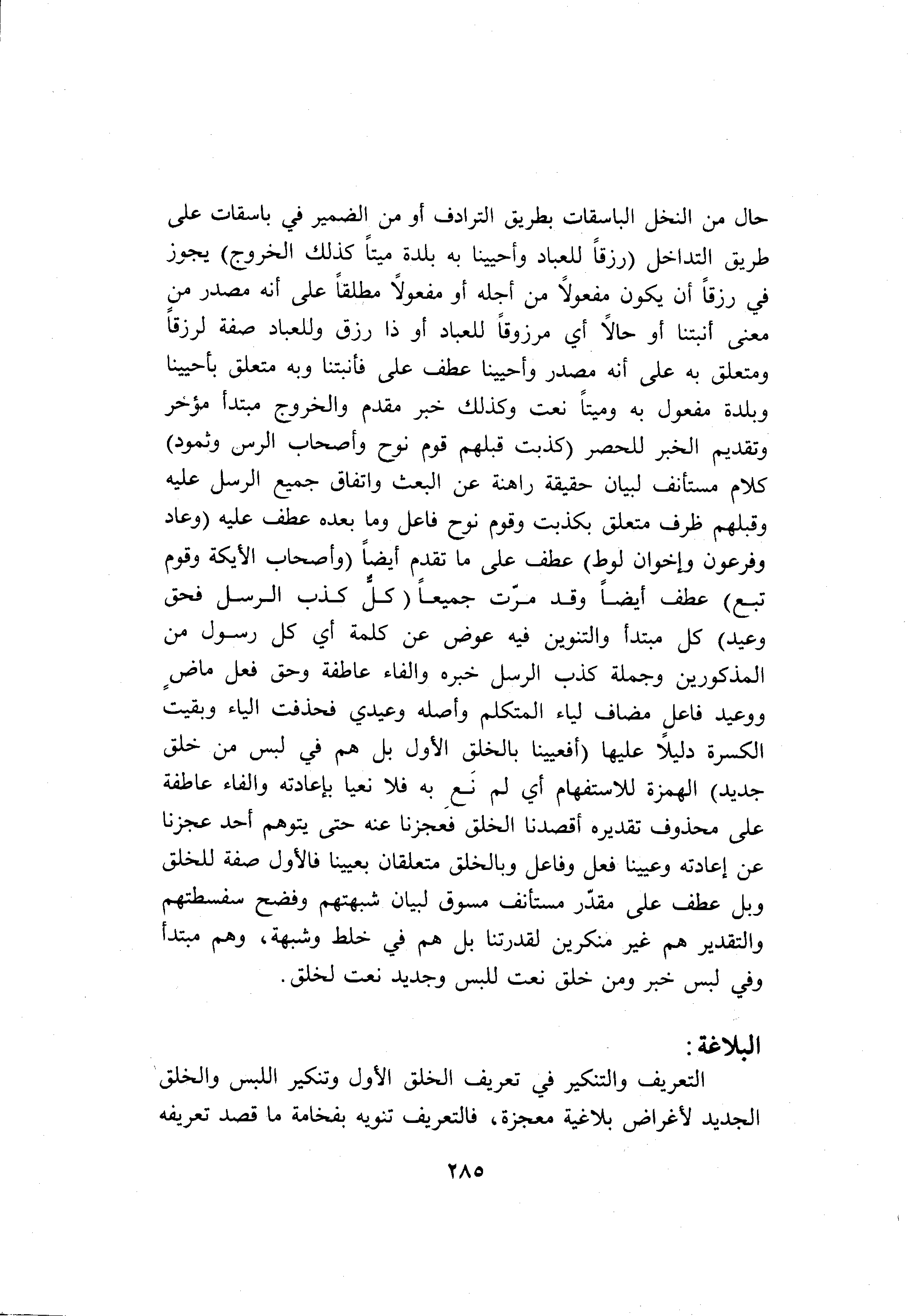 حال من النخل الباسقات بطريق الترادف أو من الضمير في باسقات على طريق التداخل (رِزْقاً لِلْعِبادِ وَأَحْيَيْنا بِهِ بَلْدَةً مَيْتاً كَذلِكَ الْخُرُوجُ) يجوز في رزقا أن يكون مفعولا من أجله أو مفعولا مطلقا على أنه مصدر من معنى أنبتنا أو حالا أي مرزوقا للعباد أو ذا رزق وللعباد صفة لرزقا ومتعلق به على أنه مصدر وأحيينا عطف على فأنبتنا وبه متعلق بأحيينا وبلدة مفعول به وميتا نعت وكذلك خبر مقدم والخروج مبتدأ مؤخر وتقديم الخبر للحصر (كَذَّبَتْ قَبْلَهُمْ قَوْمُ نُوحٍ وَأَصْحابُ الرَّسِّ وَثَمُودُ) كلام مستأنف لبيان حقيقة راهنة عن البعث واتفاق جميع الرسل عليه وقبلهم ظرف متعلق بكذبت وقوم نوح فاعل وما بعده عطف عليه (وَعادٌ وَفِرْعَوْنُ وَإِخْوانُ لُوطٍ) عطف على ما تقدم أيضا (وَأَصْحابُ الْأَيْكَةِ وَقَوْمُ تُبَّعٍ) عطف أيضا وقد مرّت جميعا (كُلٌّ كَذَّبَ الرُّسُلَ فَحَقَّ وَعِيدِ) كل مبتدأ والتنوين فيه عوض عن كلمة أي كل رسول من المذكورين وجملة كذب الرسل خبره والفاء عاطفة وحق فعل ماض ووعيد فاعل مضاف لياء المتكلم وأصله وعيدي فحذفت الياء وبقيت الكسرة دليلا عليها (أَفَعَيِينا بِالْخَلْقِ الْأَوَّلِ بَلْ هُمْ فِي لَبْسٍ مِنْ خَلْقٍ جَدِيدٍ) الهمزة للاستفهام أي لم نع به فلا نعيا بإعادته والفاء عاطفة على محذوف تقديره أقصدنا الخلق فعجزنا عنه حتى يتوهم أحد عجزنا عن إعادته وعيينا فعل وفاعل وبالخلق متعلقان بعيينا فالأول صفة للخلق وبل عطف على مقدّر مستأنف مسوق لبيان شبهتهم وفضح سفسطتهم والتقدير هم غير منكرين لقدرتنا بل هم في خلط وشبهة، وهم مبتدأ وفي لبس خبر ومن خلق نعت للبس وجديد نعت لخلق.