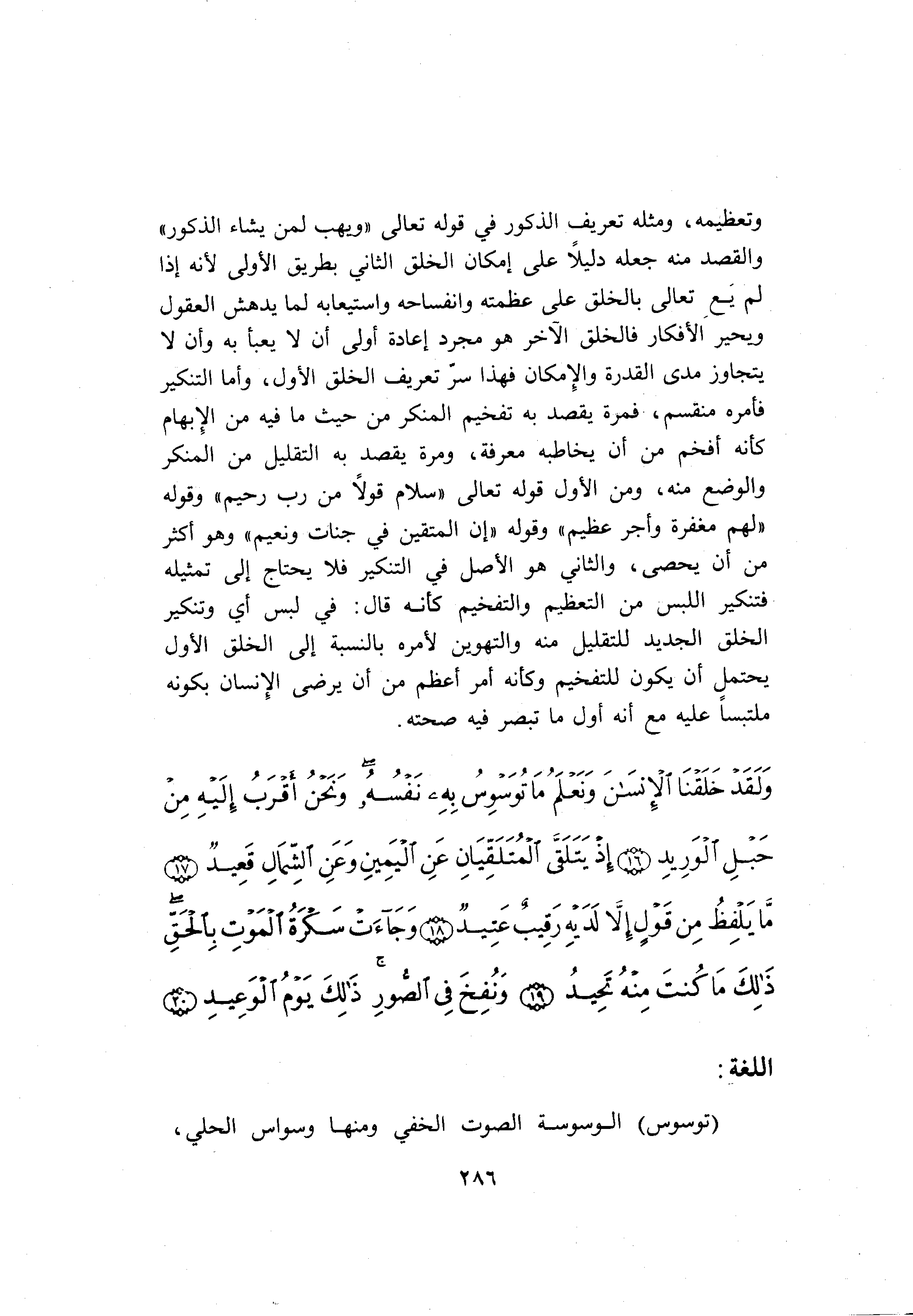 وتعظيمه، ومثله تعريف الذكور في قوله تعالى «ويهب لمن يشاء الذكور» والقصد منه جعله دليلا على إمكان الخلق الثاني بطريق الأولى لأنه إذا لم يع تعالى بالخلق على عظمته وانفساحه واستيعابه لما يدهش العقول ويحير الأفكار فالخلق الآخر هو مجرد إعادة أولى أن لا يعبأ به وأن لا يتجاوز مدى القدرة والإمكان فهذا سرّ تعريف الخلق الأول، وأما التنكير فأمره منقسم، فمرة يقصد به تفخيم المنكر من حيث ما فيه من الإبهام كأنه أفخم من أن يخاطبه معرفة، ومرة يقصد به التقليل من المنكر والوضع منه، ومن الأول قوله تعالى «سلام قولا من رب رحيم» وقوله «لهم مغفرة وأجر عظيم» وقوله «إن المتقين في جنات ونعيم» وهو أكثر من أن يحصى، والثاني هو الأصل في التنكير فلا يحتاج إلى تمثيله فتنكير اللبس من التعظيم والتفخيم كأنه قال: في لبس أي وتنكير الخلق الجديد للتقليل منه والتهوين لأمره بالنسبة إلى الخلق الأول يحتمل أن يكون للتفخيم وكأنه أمر أعظم من أن يرضى الإنسان بكونه ملتبسا عليه مع أنه أول ما تبصر فيه صحته.