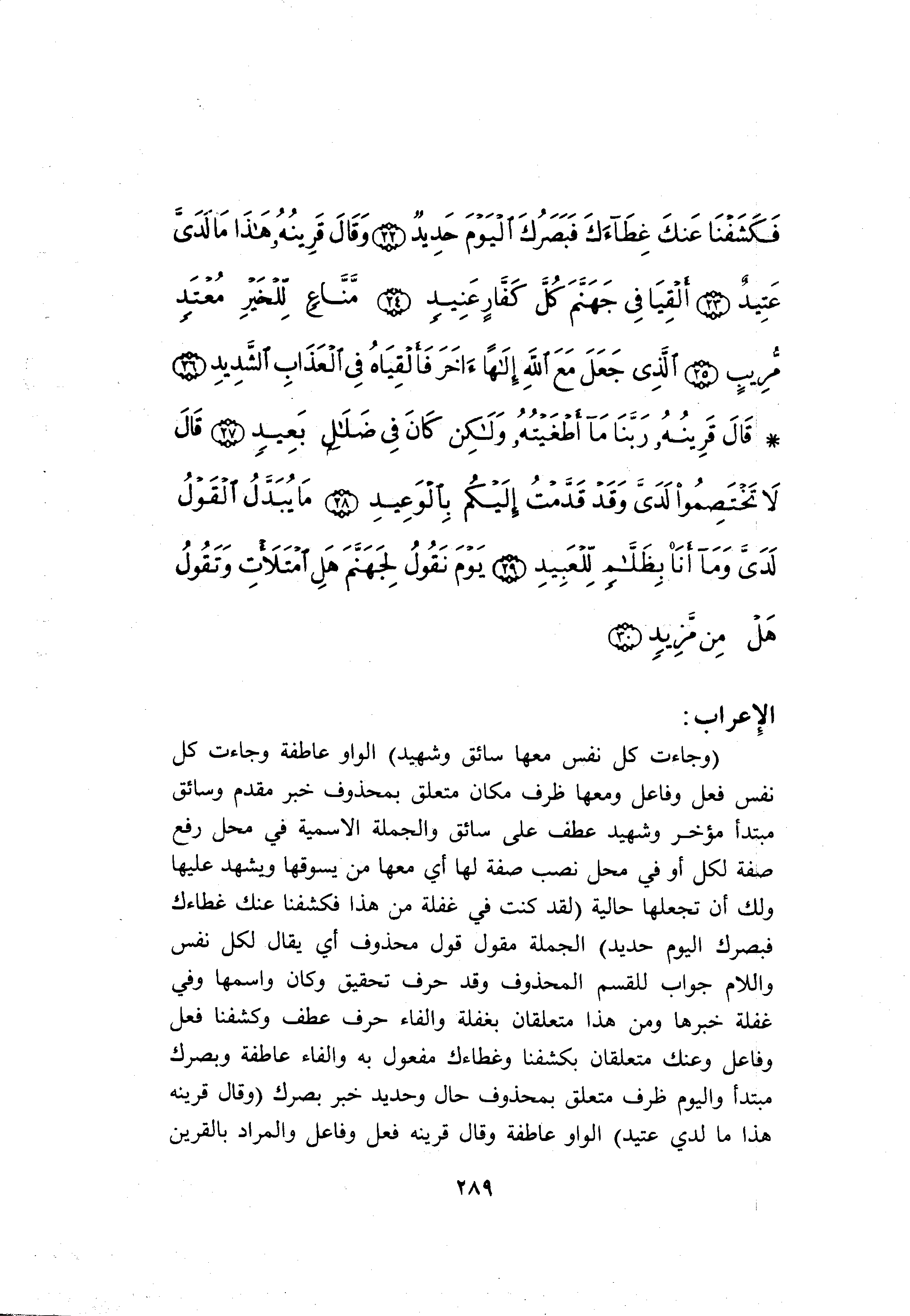 (وَجاءَتْ كُلُّ نَفْسٍ مَعَها سائِقٌ وَشَهِيدٌ) الواو عاطفة وجاءت كل نفس فعل وفاعل ومعها ظرف مكان متعلق بمحذوف خبر مقدم وسائق مبتدأ مؤخر وشهيد عطف على سائق والجملة الاسمية في محل رفع صفة لكل أو في محل نصب صفة لها أي معها من يسوقها ويشهد عليها ولك أن تجعلها حالية (لَقَدْ كُنْتَ فِي غَفْلَةٍ مِنْ هذا فَكَشَفْنا عَنْكَ غِطاءَكَ فَبَصَرُكَ الْيَوْمَ حَدِيدٌ) الجملة مقول قول محذوف أي يقال لكل نفس واللام جواب للقسم المحذوف وقد حرف تحقيق وكان واسمها وفي غفلة خبرها ومن هذا متعلقان بغفلة والفاء حرف عطف وكشفنا فعل وفاعل وعنك متعلقان بكشفنا وغطاءك مفعول به والفاء عاطفة وبصرك مبتدأ واليوم ظرف متعلق بمحذوف حال وحديد خبر بصرك (وَقالَ قَرِينُهُ هذا ما لَدَيَّ عَتِيدٌ) الواو عاطفة وقال قرينه فعل وفاعل والمراد بالقرين