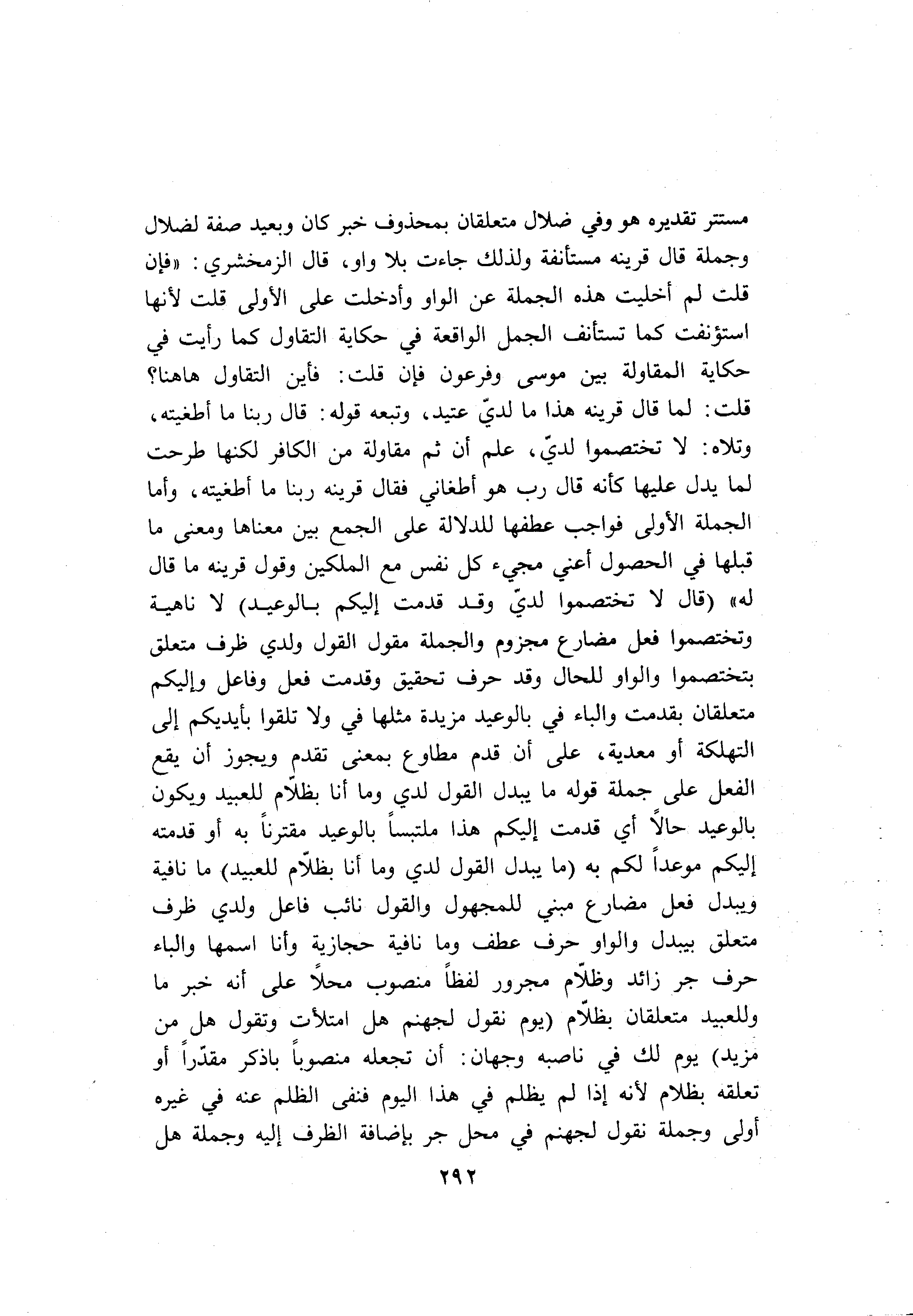 قلت: لما قال قرينه هذا ما لديّ عتيد، وتبعه قوله: قال ربنا ما أطغيته، وتلاه: لا تختصموا لديّ، علم أن ثم مقاولة من الكافر لكنها طرحت لما يدل عليها كأنه قال رب هو أطغاني فقال قرينه ربنا ما أطغيته، وأما الجملة الأولى فواجب عطفها للدلالة على الجمع بين معناها ومعنى ما قبلها في الحصول أعني مجيء كل نفس مع الملكين وقول قرينه ما قال له» (قالَ لا تَخْتَصِمُوا لَدَيَّ وَقَدْ قَدَّمْتُ إِلَيْكُمْ بِالْوَعِيدِ) لا ناهية وتختصموا فعل مضارع مجزوم والجملة مقول القول ولدي ظرف متعلق بتختصموا والواو للحال وقد حرف تحقيق وقدمت فعل وفاعل وإليكم متعلقان بقدمت والباء في بالوعيد مزيدة مثلها في ولا تلقوا بأيديكم إلى التهلكة أو معدية، على أن قدم مطاوع بمعنى تقدم ويجوز أن يقع الفعل على جملة قوله ما يبدل القول لدي وما أنا بظلّام للعبيد ويكون بالوعيد حالا أي قدمت إليكم هذا ملتبسا بالوعيد مقترنا به أو قدمته إليكم موعدا لكم به (ما يُبَدَّلُ الْقَوْلُ لَدَيَّ وَما أَنَا بِظَلَّامٍ لِلْعَبِيدِ) ما نافية ويبدل فعل مضارع مبني للمجهول والقول نائب فاعل ولدي ظرف متعلق بيبدل والواو حرف عطف وما نافية حجازية وأنا اسمها والباء حرف جر زائد وظلّام مجرور لفظا منصوب محلا على أنه خبر ما وللعبيد متعلقان بظلّام (يَوْمَ نَقُولُ لِجَهَنَّمَ هَلِ امْتَلَأْتِ وَتَقُولُ هَلْ مِنْ مَزِيدٍ) يوم لك في ناصبه وجهان: أن تجعله منصوبا باذكر مقدّرا أو تعلقه بظلام لأنه إذا لم يظلم في هذا اليوم فنفى الظلم عنه في غيره أولى وجملة نقول لجهنم في محل جر بإضافة الظرف إليه وجملة هل