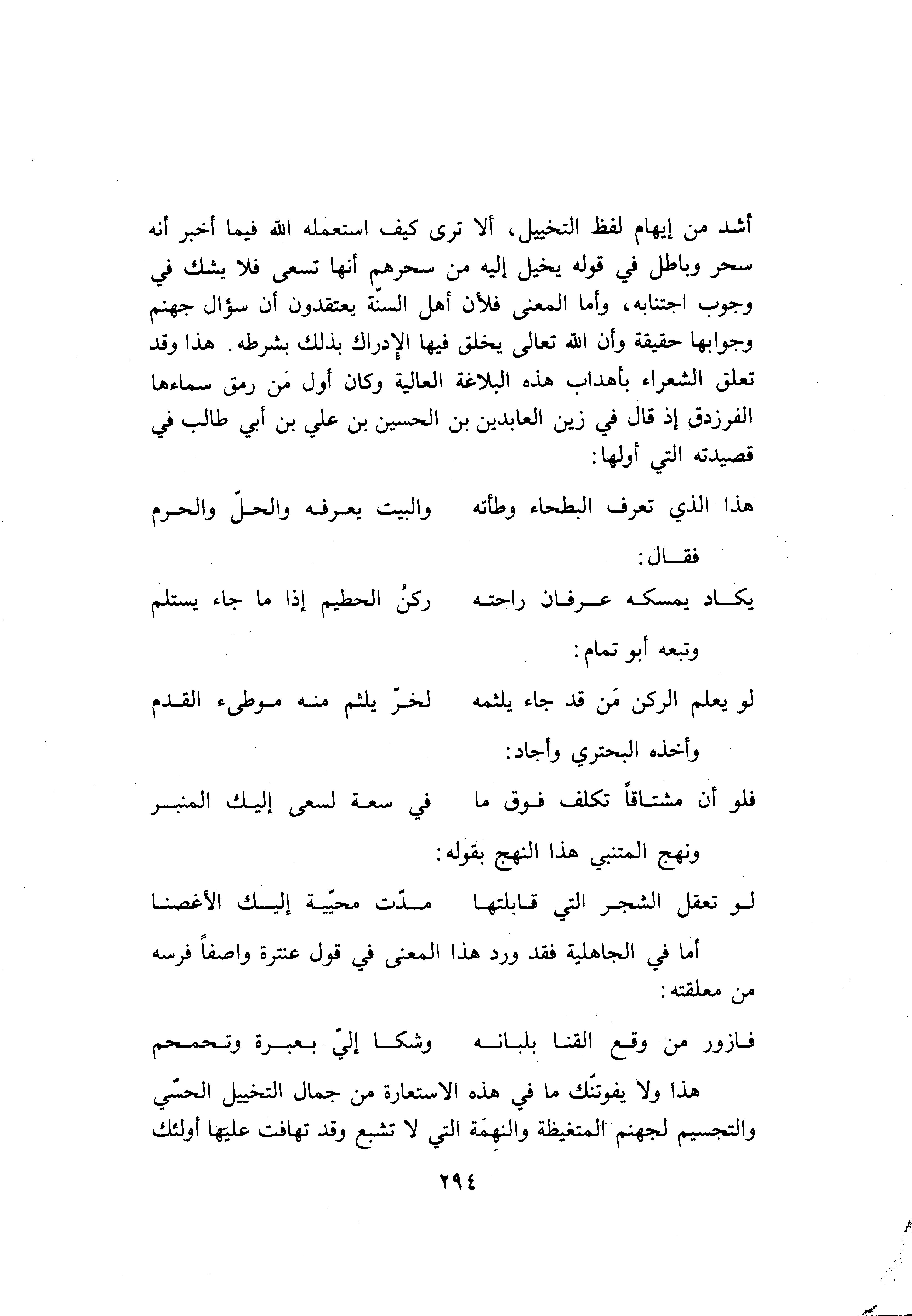 أشد من إيهام لفظ التخييل، ألا ترى كيف استعمله الله فيما أخبر أنه سحر وباطل في قوله يخيل إليه من سحرهم أنها تسعى فلا يشك في وجوب اجتنابه، وأما المعنى فلأن أهل السنّة يعتقدون أن سؤال جهنم وجوابها حقيقة وأن الله تعالى يخلق فيها الإدراك بذلك بشرطه. هذا وقد تعلق الشعراء بأهداب هذه البلاغة العالية وكان أول من رمق سماءها الفرزدق إذ قال في زين العابدين بن الحسين بن علي بن أبي طالب في قصيدته التي أولها: