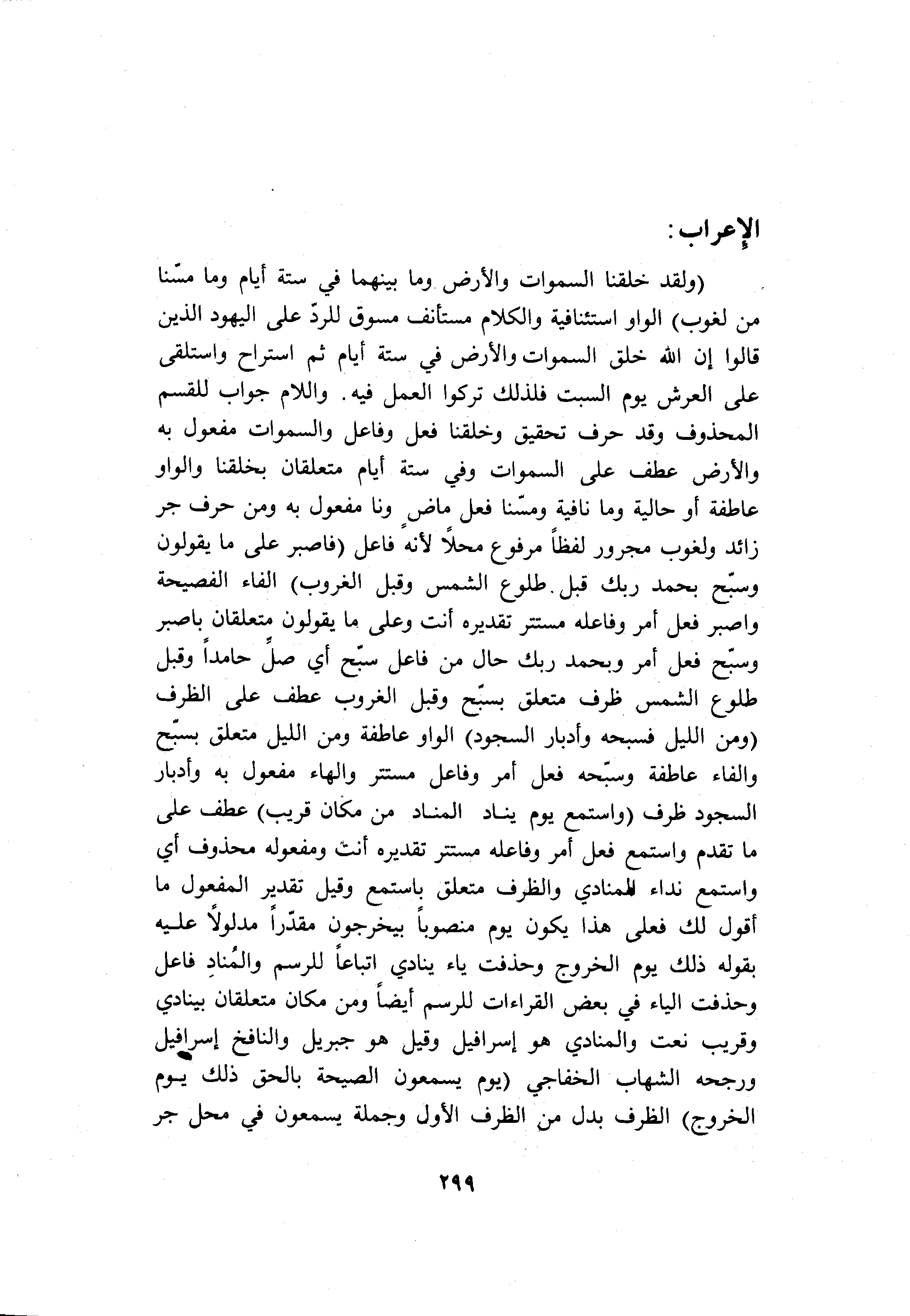 (وَلَقَدْ خَلَقْنَا السَّماواتِ وَالْأَرْضَ وَما بَيْنَهُما فِي سِتَّةِ أَيَّامٍ وَما مَسَّنا مِنْ لُغُوبٍ) الواو استئنافية والكلام مستأنف مسوق للردّ على اليهود الذين قالوا إن الله خلق السموات والأرض في ستة أيام ثم استراح واستلقى على العرش يوم السبت فلذلك تركوا العمل فيه. واللام جواب للقسم المحذوف وقد حرف تحقيق وخلقنا فعل وفاعل والسموات مفعول به والأرض عطف على السموات وفي ستة أيام متعلقان بخلقنا والواو عاطفة أو حالية وما نافية ومسّنا فعل ماض ونا مفعول به ومن حرف جر زائد ولغوب مجرور لفظا مرفوع محلا لأنه فاعل (فَاصْبِرْ عَلى ما يَقُولُونَ وَسَبِّحْ بِحَمْدِ رَبِّكَ قَبْلَ طُلُوعِ الشَّمْسِ وَقَبْلَ الْغُرُوبِ) الفاء الفصيحة واصبر فعل أمر وفاعله مستتر تقديره أنت وعلى ما يقولون متعلقان باصبر وسبّح فعل أمر وبحمد ربك حال من فاعل سبّح أي صلّ حامدا وقبل طلوع الشمس ظرف متعلق بسبّح وقبل الغروب عطف على الظرف (وَمِنَ اللَّيْلِ فَسَبِّحْهُ وَأَدْبارَ السُّجُودِ) الواو عاطفة ومن الليل متعلق بسبّح والفاء عاطفة وسبّحه فعل أمر وفاعل مستتر والهاء مفعول به وأدبار السجود ظرف (وَاسْتَمِعْ يَوْمَ يُنادِ الْمُنادِ مِنْ مَكانٍ قَرِيبٍ) عطف على ما تقدم واستمع فعل أمر وفاعله مستتر تقديره أنت ومفعوله محذوف أي واستمع نداء المنادي والظرف متعلق باستمع وقيل تقدير المفعول ما أقول لك فعلى هذا يكون يوم منصوبا بيخرجون مقدّرا مدلولا عليه بقوله ذلك يوم الخروج وحذفت ياء ينادي اتباعا للرسم والمناد فاعل وحذفت الياء في بعض القراءات للرسم أيضا ومن مكان متعلقان بينادي وقريب نعت والمنادي هو إسرافيل وقيل هو جبريل والنافخ إسرافيل ورجحه الشهاب الخفاجي (يَوْمَ يَسْمَعُونَ الصَّيْحَةَ بِالْحَقِّ ذلِكَ يَوْمُ الْخُرُوجِ) الظرف بدل من الظرف الأول وجملة يسمعون في محل جر