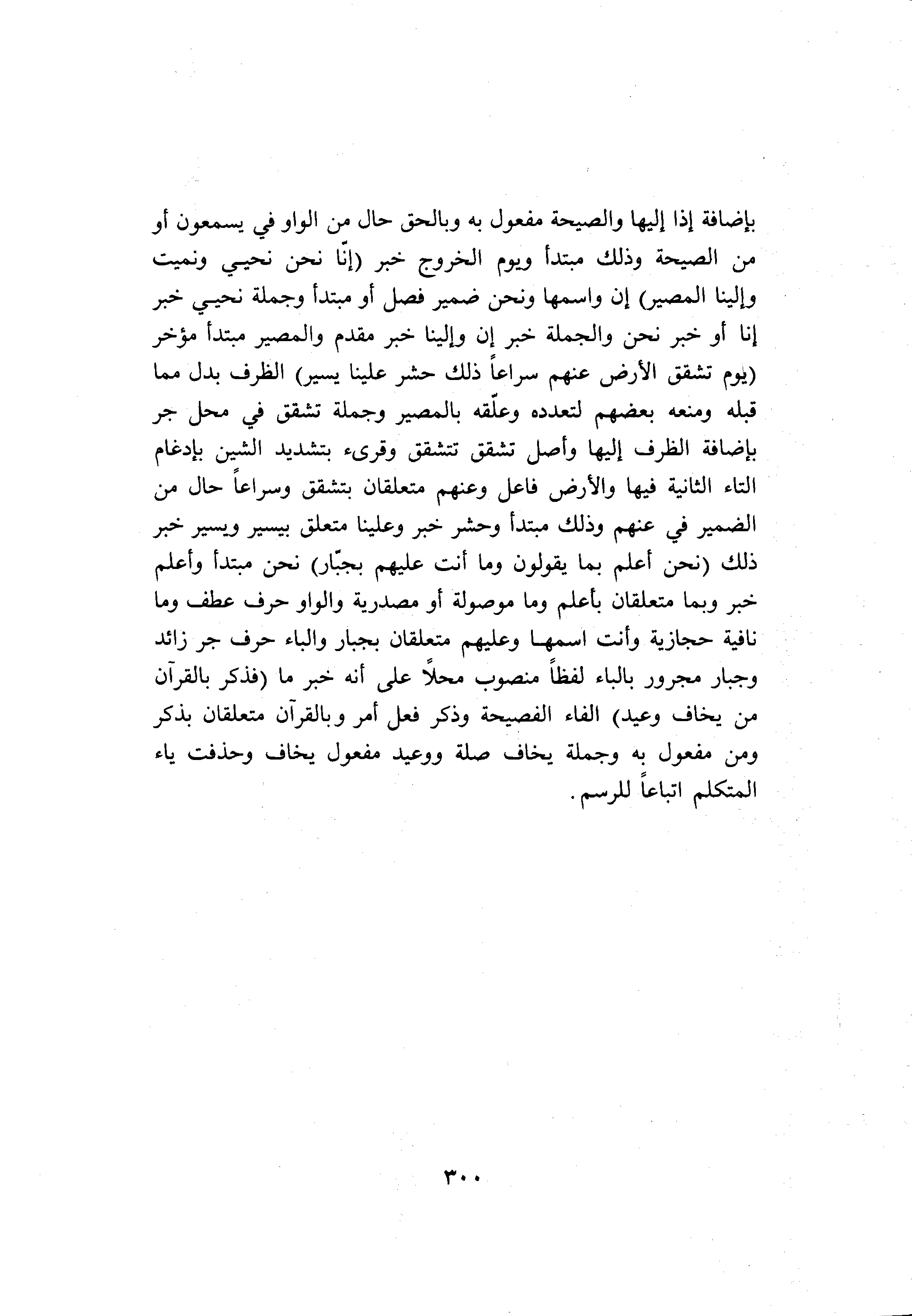 بإضافة إذا إليها والصيحة مفعول به وبالحق حال من الواو في يسمعون أو من الصيحة وذلك مبتدأ ويوم الخروج خبر (إِنَّا نَحْنُ نُحْيِي وَنُمِيتُ وَإِلَيْنَا الْمَصِيرُ) إن واسمها ونحن ضمير فصل أو مبتدأ وجملة نحيي خبر إنا أو خبر نحن والجملة خبر إن وإلينا خبر مقدم والمصير مبتدأ مؤخر (يَوْمَ تَشَقَّقُ الْأَرْضُ عَنْهُمْ سِراعاً ذلِكَ حَشْرٌ عَلَيْنا يَسِيرٌ) الظرف بدل مما قبله ومنعه بعضهم لتعدده وعلّقه بالمصير وجملة تشقق في محل جر بإضافة الظرف إليها وأصل تشقق تتشقق وقرئ بتشديد الشين بإدغام التاء الثانية فيها والأرض فاعل وعنهم متعلقان بتشقق وسراعا حال من الضمير في عنهم وذلك مبتدأ وحشر خبر وعلينا متعلق بيسير ويسير خبر ذلك (نَحْنُ أَعْلَمُ بِما يَقُولُونَ وَما أَنْتَ عَلَيْهِمْ بِجَبَّارٍ) نحن مبتدأ وأعلم خبر وبما متعلقان بأعلم وما موصولة أو مصدرية والواو حرف عطف وما نافية حجازية وأنت اسمها وعليهم متعلقان بجبار والباء حرف جر زائد وجبار مجرور بالباء لفظا منصوب محلا على أنه خبر ما (فَذَكِّرْ بِالْقُرْآنِ مَنْ يَخافُ وَعِيدِ) الفاء الفصيحة وذكر فعل أمر وبالقرآن متعلقان بذكر ومن مفعول به وجملة يخاف صلة ووعيد مفعول يخاف وحذفت ياء المتكلم اتباعا للرسم.