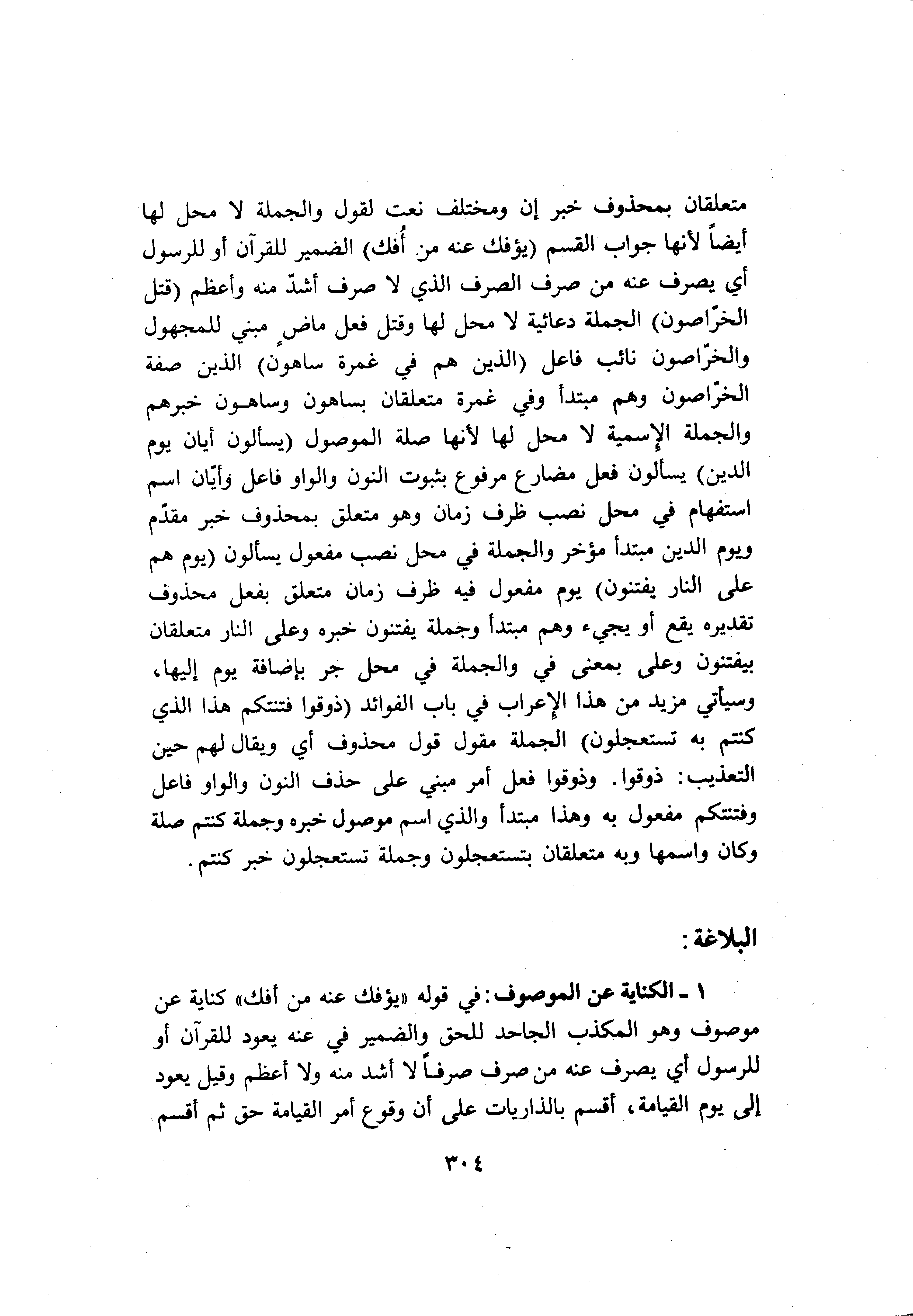 متعلقان بمحذوف خبر إن ومختلف نعت لقول والجملة لا محل لها أيضا لأنها جواب القسم (يُؤْفَكُ عَنْهُ مَنْ أُفِكَ) الضمير للقرآن أو للرسول أي يصرف عنه من صرف الصرف الذي لا صرف أشدّ منه وأعظم (قُتِلَ الْخَرَّاصُونَ) الجملة دعائية لا محل لها وقتل فعل ماض مبني للمجهول والخرّاصون وهم مبتدأ وفي غمرة متعلقان بساهون وساهون خبرهم والجملة الاسمية لا محل لها لأنها صلة الموصول (يَسْئَلُونَ أَيَّانَ يَوْمُ الدِّينِ) يسألون فعل مضارع مرفوع بثبوت النون والواو فاعل وأيّان اسم استفهام في محل نصب ظرف زمان وهو متعلق بمحذوف خبر مقدّم ويوم الدين مبتدأ مؤخر والجملة في محل نصب مفعول يسألون (يَوْمَ هُمْ عَلَى النَّارِ يُفْتَنُونَ) يوم مفعول فيه ظرف زمان متعلق بفعل محذوف تقديره يقع أو يجيء وهم مبتدأ وجملة يفتنون خبره وعلى النار متعلقان بيفتنون وعلى بمعنى في والجملة في محل جر بإضافة يوم إليها، وسيأتي مزيد من هذا الإعراب في باب الفوائد (ذُوقُوا فِتْنَتَكُمْ هذَا الَّذِي كُنْتُمْ بِهِ تَسْتَعْجِلُونَ) الجملة مقول قول محذوف أي ويقال لهم حين التعذيب: ذوقوا. وذوقوا فعل أمر مبني على حذف النون والواو فاعل وفتنتكم مفعول به وهذا مبتدأ والذي اسم موصول خبره وجملة كنتم صلة وكان واسمها وبه متعلقان بتستعجلون وجملة تستعجلون خبر كنتم.