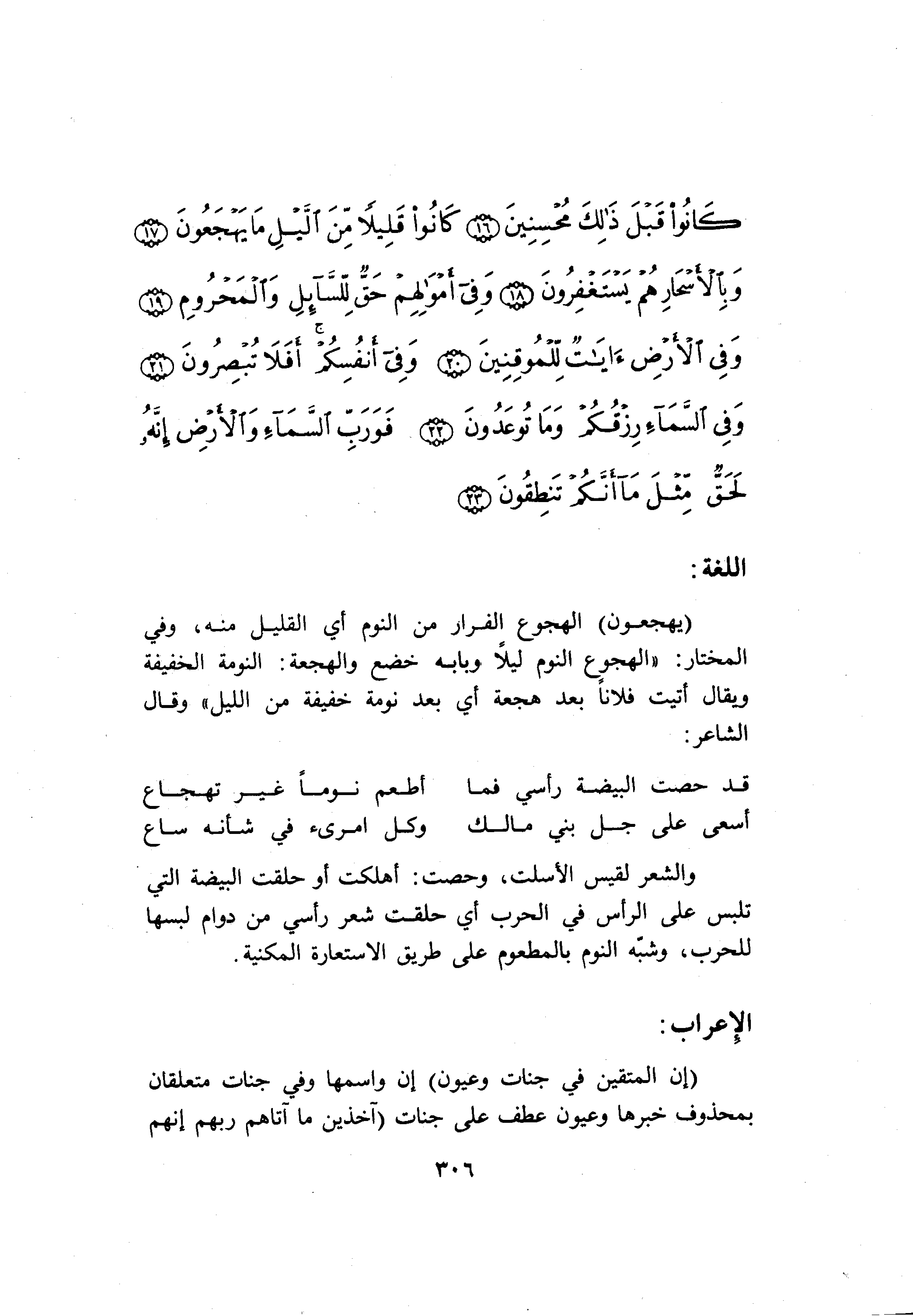 (يَهْجَعُونَ) الهجوع الفرار من النوم أي القليل منه، وفي المختار: «الهجوع النوم ليلا وبابه خضع والهجعة: النومة الخفيفة ويقال أتيت فلانا بعد هجعة أي بعد نومة خفيفة من الليل» وقال الشاعر: