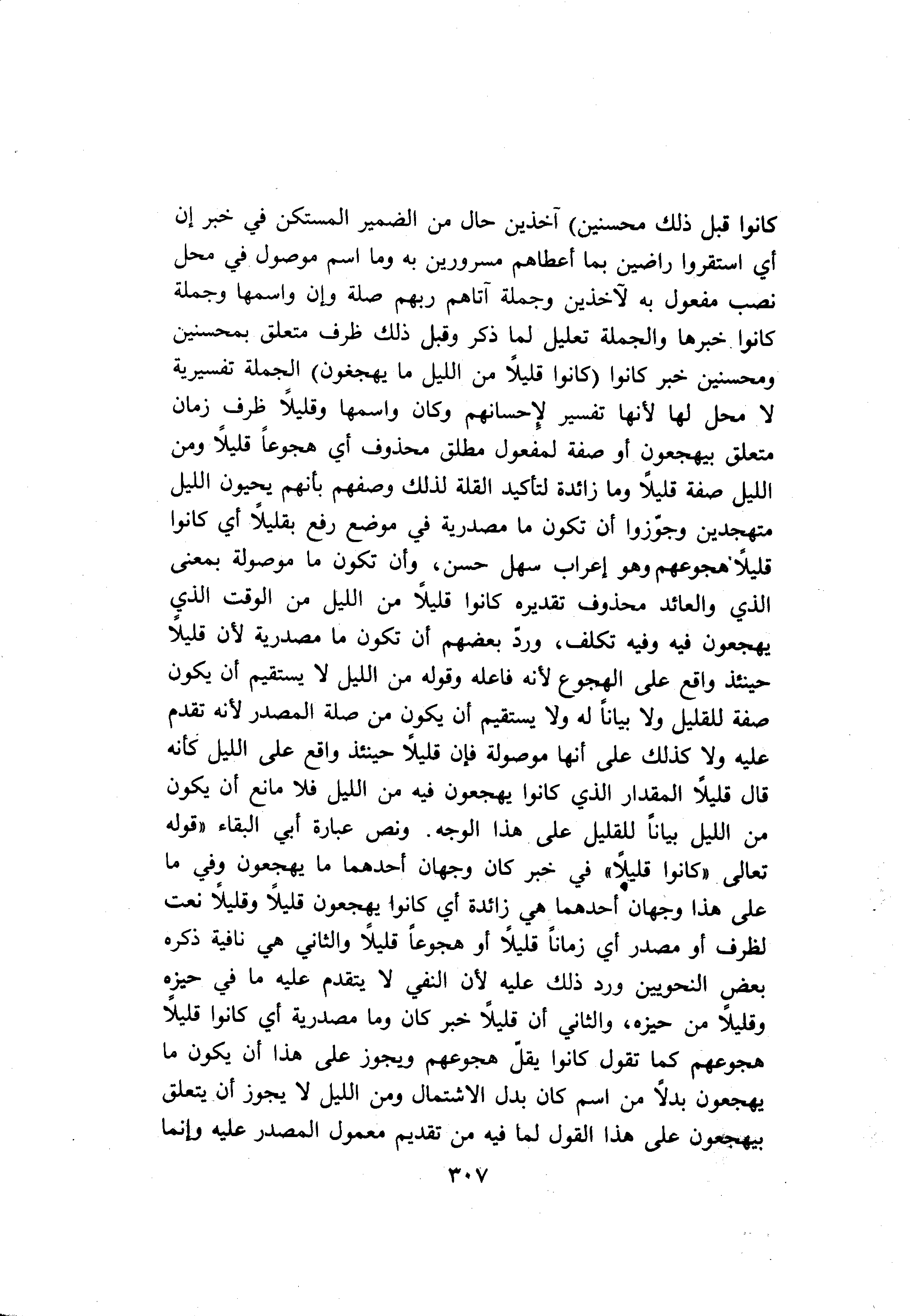 آخذين حال من الضمير المستكن في خبر إن أي استقروا راضين بما أعطاهم مسرورين به وما اسم موصول في محل نصب مفعول به لآخذين وجملة آتاهم ربهم صلة وإن واسمها وجملة كانوا خبرها والجملة تعليل لما ذكر وقبل ذلك ظرف متعلق بمحسنين ومحسنين خبر كانوا (كانُوا قَلِيلًا مِنَ اللَّيْلِ ما يَهْجَعُونَ) الجملة تفسيرية لا محل لها لأنها تفسير لإحسانهم وكان واسمها وقليلا ظرف زمان متعلق بيهجعون أو صفة لمفعول مطلق محذوف أي هجوعا قليلا ومن الليل صفة قليلا وما زائدة لتأكيد القلة لذلك وصفهم بأنهم يحيون الليل متهجدين وجوّزوا أن تكون ما مصدرية في موضع رفع بقليلا أي كانوا قليلا هجوعهم وهو إعراب سهل حسن، وأن تكون ما موصولة بمعنى الذي والعائد محذوف تقديره كانوا قليلا من الليل من الوقت الذي يهجعون فيه وفيه تكلف، وردّ بعضهم أن تكون ما مصدرية لأن قليلا حينئذ واقع على الهجوع لأنه فاعله وقوله من الليل لا يستقيم أن يكون صفة للقليل ولا بيانا له ولا يستقيم أن يكون من صلة المصدر لأنه تقدم عليه ولا كذلك على أنها موصولة فإن قليلا حينئذ واقع على الليل كأنه قال قليلا المقدار الذي كانوا يهجعون فيه من الليل فلا مانع أن يكون من الليل بيانا للقليل على هذا الوجه. ونص عبارة أبي البقاء «قوله تعالى «كانوا قليلا» في خبر كان وجهان أحدهما ما يهجعون وفي ما على هذا وجهان أحدهما هي زائدة أي كانوا يهجعون قليلا وقليلا نعت لظرف أو مصدر أي زمانا قليلا أو هجوعا قليلا والثاني هي نافية ذكره بعض النحويين ورد ذلك عليه لأن النفي لا يتقدم عليه ما في حيزه وقليلا من حيزه، والثاني أن قليلا خبر كان وما مصدرية أي كانوا قليلا هجوعهم كما تقول كانوا يقلّ هجوعهم ويجوز على هذا أن يكون ما يهجعون بدلا من اسم كان بدل الاشتمال ومن الليل لا يجوز أن يتعلق بيهجعون على هذا القول لما فيه من تقديم معمول المصدر عليه وإنما
