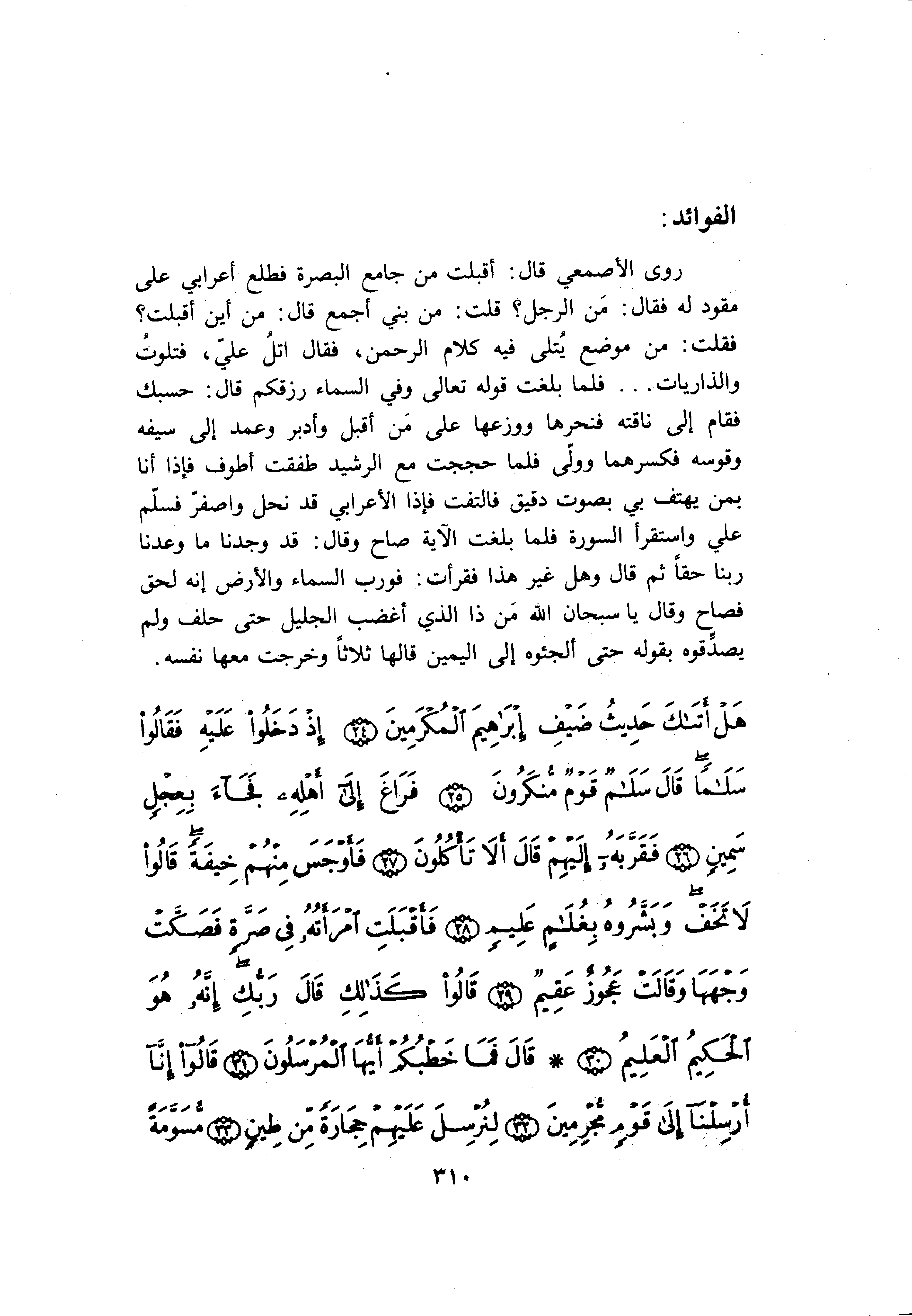 فقلت: من موضع يتلى فيه كلام الرحمن، فقال اتل عليّ، فتلوت والذاريات ... فلما بلغت قوله تعالى وفي السماء رزقكم قال: حسبك فقام إلى ناقته فنحرها ووزعها على من أقبل وأدبر وعمد إلى سيفه وقوسه فكسرهما وولّى فلما حججت مع الرشيد طفقت أطوف فإذا أنا بمن يهتف بي بصوت دقيق فالتفت فإذا الأعرابي قد نحل واصفرّ فسلّم علي واستقرأ السورة فلما بلغت الآية صاح وقال: قد وجدنا ما وعدنا ربنا حقا ثم قال وهل غير هذا فقرأت: فورب السماء والأرض إنه لحق فصاح وقال يا سبحان الله من ذا الذي أغضب الجليل حتى حلف ولم يصدّقوه بقوله حتى ألجئوه إلى اليمين قالها ثلاثا وخرجت معها نفسه.