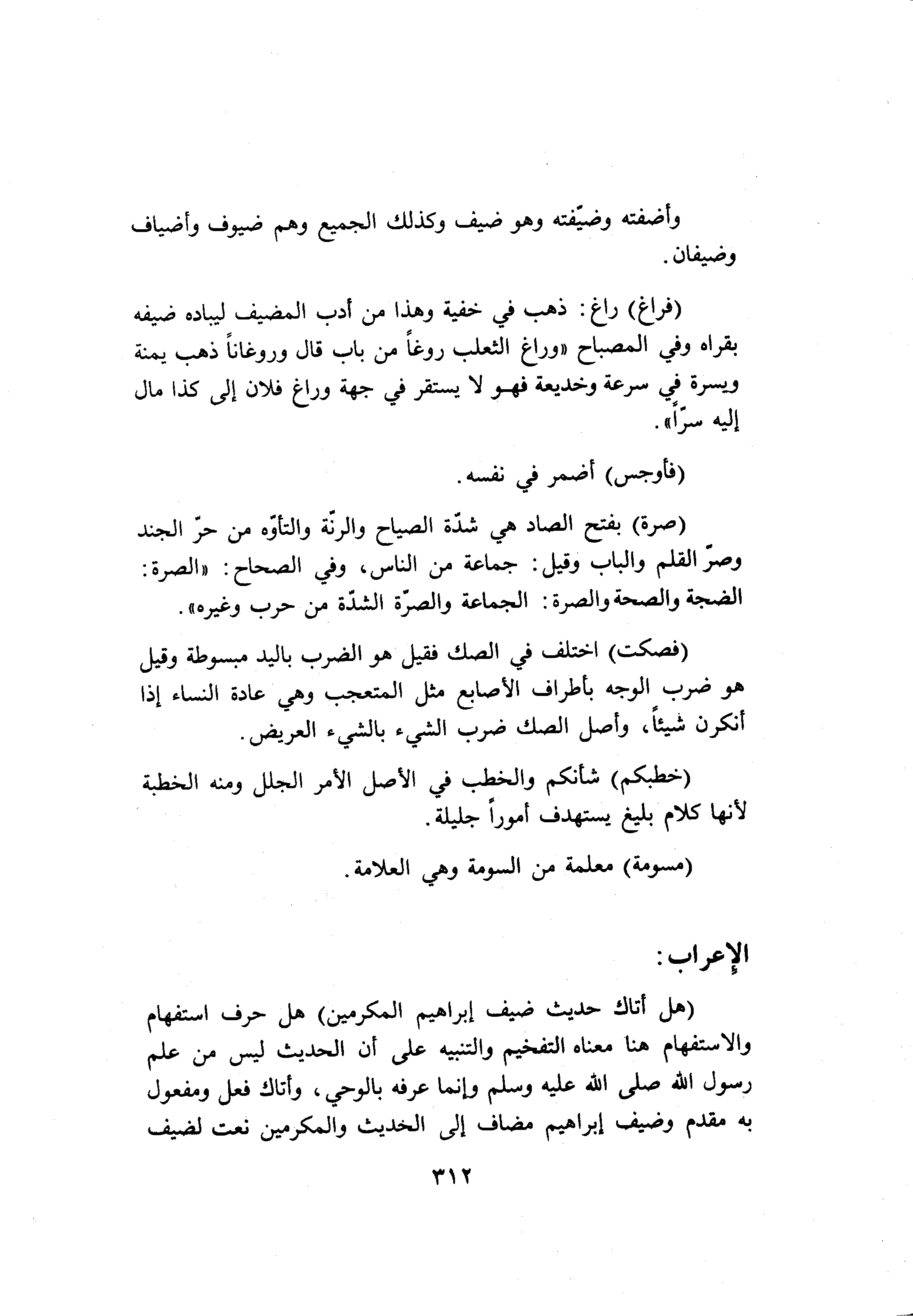 (فَراغَ) راغ: ذهب في خفية وهذا من أدب المضيف ليباده ضيفه بقراه وفي المصباح «وراغ الثعلب روغا من باب قال وروغانا ذهب يمنة ويسرة في سرعة وخديعة فهو لا يستقر في جهة وراغ فلان إلى كذا مال إليه سرّا» .