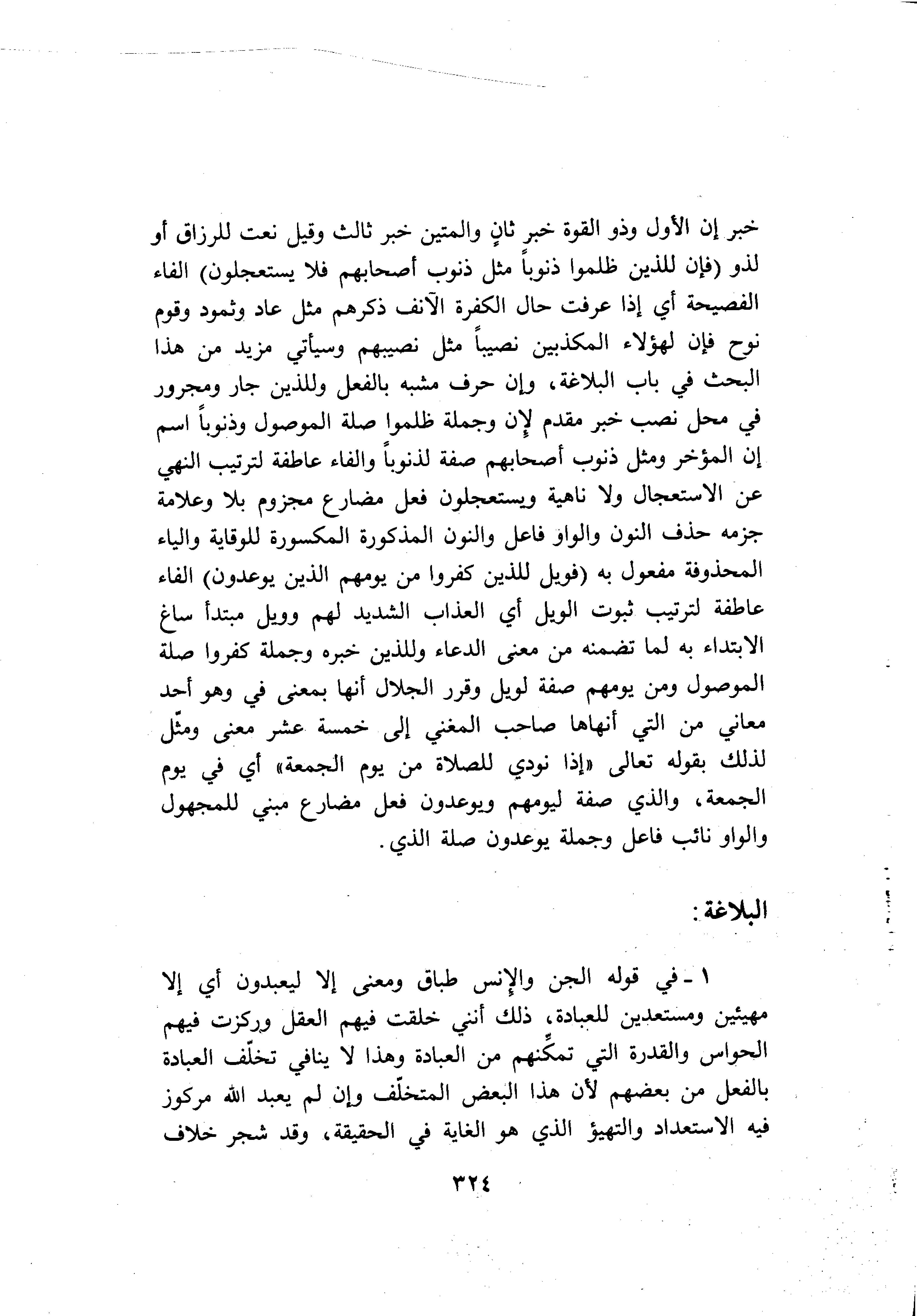 1- في قوله الجن والإنس طباق ومعنى إلا ليعبدون أي إلا مهيئين ومستعدين للعبادة، ذلك أنني خلقت فيهم العقل وركزت فيهم الحواس والقدرة التي تمكّنهم من العبادة وهذا لا ينافي تخلّف العبادة بالفعل من بعضهم لأن هذا البعض المتخلّف وإن لم يعبد الله مركوز فيه الاستعداد والتهيؤ الذي هو الغاية في الحقيقة، وقد شجر خلاف