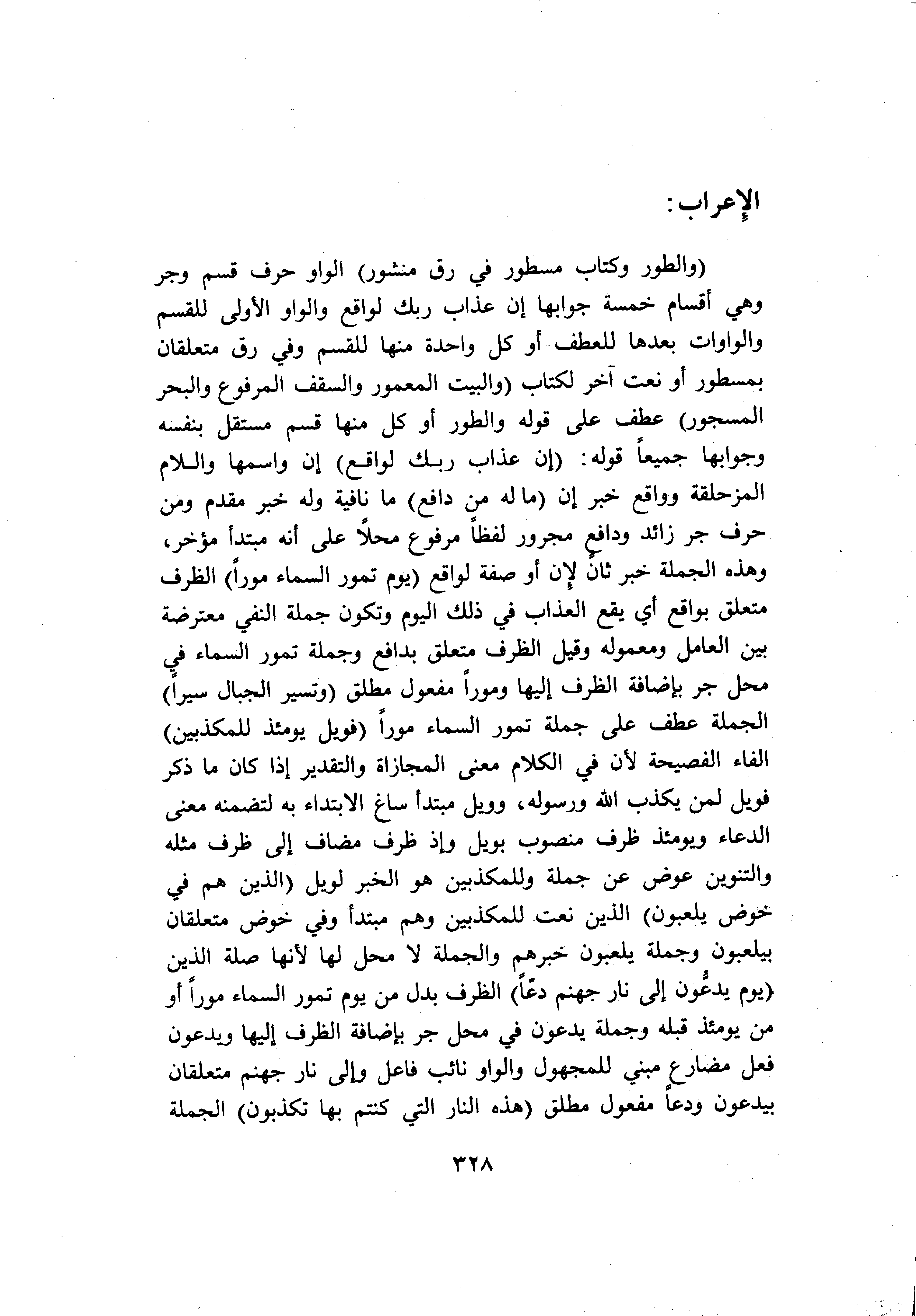 (وَالطُّورِ وَكِتابٍ مَسْطُورٍ فِي رَقٍّ مَنْشُورٍ) الواو حرف قسم وجر وهي أقسام خمسة جوابها إن عذاب ربك لواقع والواو الأولى للقسم والواوات بعدها للعطف أو كل واحدة منها للقسم وفي رق متعلقان بمسطور أو نعت آخر لكتاب (وَالْبَيْتِ الْمَعْمُورِ وَالسَّقْفِ الْمَرْفُوعِ وَالْبَحْرِ الْمَسْجُورِ) عطف على قوله والطور أو كل منها قسم مستقل بنفسه وجوابها جميعا قوله: (إِنَّ عَذابَ رَبِّكَ لَواقِعٌ) إن واسمها واللام المزحلقة وواقع خبر إن (ما لَهُ مِنْ دافِعٍ) ما نافية وله خبر مقدم ومن حرف جر زائد ودافع مجرور لفظا مرفوع محلا على أنه مبتدأ مؤخر، وهذه الجملة خبر ثان لإن أو صفة لواقع (يَوْمَ تَمُورُ السَّماءُ مَوْراً) الظرف متعلق بواقع أي يقع العذاب في ذلك اليوم وتكون جملة النفي معترضة بين العامل ومعموله وقيل الظرف متعلق بدافع وجملة تمور السماء في محل جر بإضافة الظرف إليها ومورا مفعول مطلق (وَتَسِيرُ الْجِبالُ سَيْراً) الجملة عطف على جملة تمور السماء مورا (فَوَيْلٌ يَوْمَئِذٍ لِلْمُكَذِّبِينَ) الفاء الفصيحة لأن في الكلام معنى المجازاة والتقدير إذا كان ما ذكر فويل لمن يكذب الله ورسوله، وويل مبتدأ ساغ الابتداء به لتضمنه معنى الدعاء ويومئذ ظرف منصوب بويل وإذ ظرف مضاف إلى ظرف مثله والتنوين عوض عن جملة وللمكذبين هو الخبر لويل (الَّذِينَ هُمْ فِي خَوْضٍ يَلْعَبُونَ) الذين نعت للمكذبين وهم مبتدأ وفي خوض متعلقان بيلعبون وجملة يلعبون خبرهم والجملة لا محل لها لأنها صلة الذين (يَوْمَ يُدَعُّونَ إِلى نارِ جَهَنَّمَ دَعًّا) الظرف بدل من يوم تمور السماء مورا أو من يومئذ قبله وجملة يدعون في محل جر بإضافة الظرف إليها ويدعون فعل مضارع مبني للمجهول والواو نائب فاعل وإلى نار جهنم متعلقان بيدعون ودعا مفعول مطلق (هذِهِ النَّارُ الَّتِي كُنْتُمْ بِها تُكَذِّبُونَ) الجملة