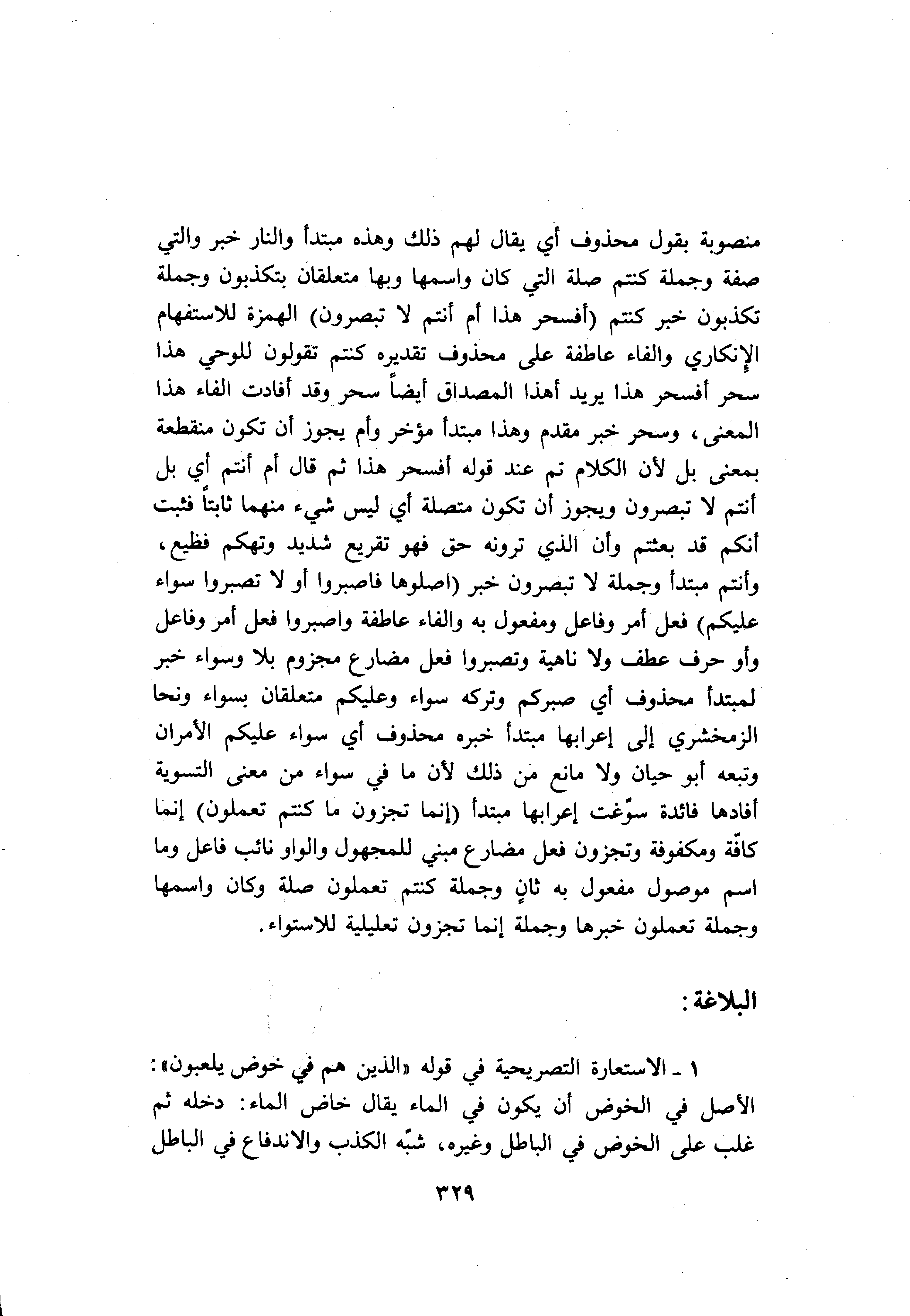 منصوبة بقول محذوف أي يقال لهم ذلك وهذه مبتدأ والنار خبر والتي صفة وجملة كنتم صلة التي كان واسمها وبها متعلقان بتكذبون وجملة تكذبون خبر كنتم (أَفَسِحْرٌ هذا أَمْ أَنْتُمْ لا تُبْصِرُونَ) الهمزة للاستفهام الإنكاري والفاء عاطفة على محذوف تقديره كنتم تقولون للوحي هذا سحر أفسحر هذا يريد أهذا المصداق أيضا سحر وقد أفادت الفاء هذا المعنى، وسحر خبر مقدم وهذا مبتدأ مؤخر وأم يجوز أن تكون منقطعة بمعنى بل لأن الكلام تم عند قوله أفسحر هذا ثم قال أم أنتم أي بل أنتم لا تبصرون ويجوز أن تكون متصلة أي ليس شيء منهما ثابتا فثبت أنكم قد بعثتم وأن الذي ترونه حق فهو تقريع شديد وتهكم فظيع، وأنتم مبتدأ وجملة لا تبصرون خبر (اصْلَوْها فَاصْبِرُوا أَوْ لا تَصْبِرُوا سَواءٌ عَلَيْكُمْ) فعل أمر وفاعل ومفعول به والفاء عاطفة واصبروا فعل أمر وفاعل وأو حرف عطف ولا ناهية وتصبروا فعل مضارع مجزوم بلا وسواء خبر لمبتدأ محذوف أي صبركم وتركه سواء وعليكم متعلقان بسواء ونحا الزمخشري إلى إعرابها مبتدأ خبره محذوف أي سواء عليكم الأمران وتبعه أبو حيان ولا مانع من ذلك لأن ما في سواء من معنى التسوية أفادها فائدة سوّغت إعرابها مبتدأ (إِنَّما تُجْزَوْنَ ما كُنْتُمْ تَعْمَلُونَ) إنما كافّة ومكفوفة وتجزون فعل مضارع مبني للمجهول والواو نائب فاعل وما اسم موصول مفعول به ثان وجملة كنتم تعملون صلة وكان واسمها وجملة تعملون خبرها وجملة إنما تجزون تعليلية للاستواء.